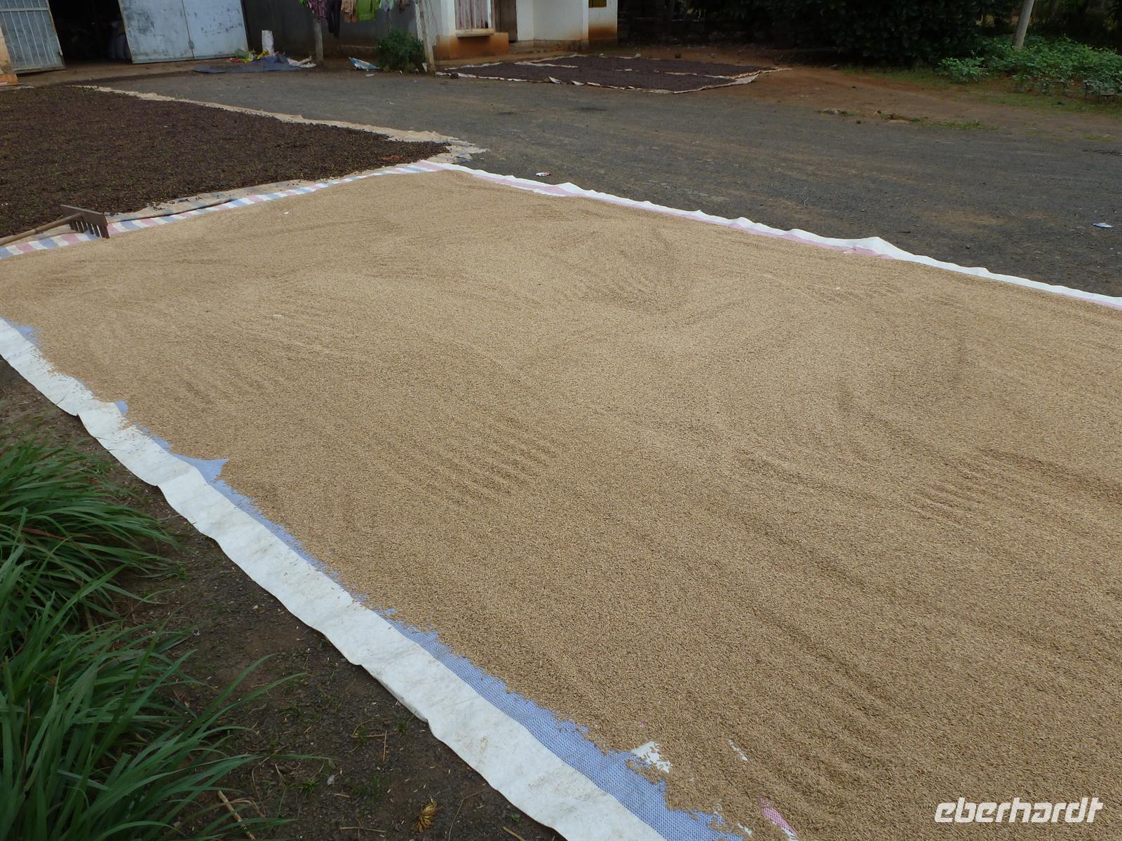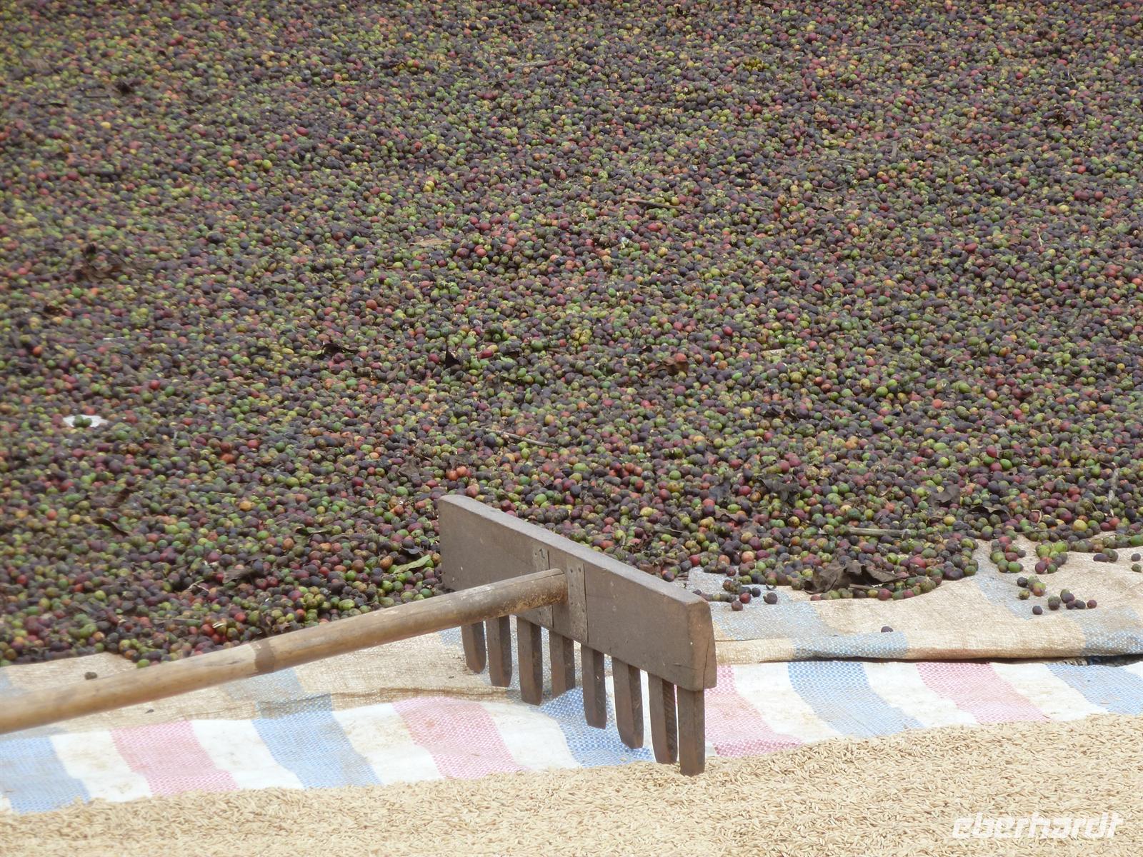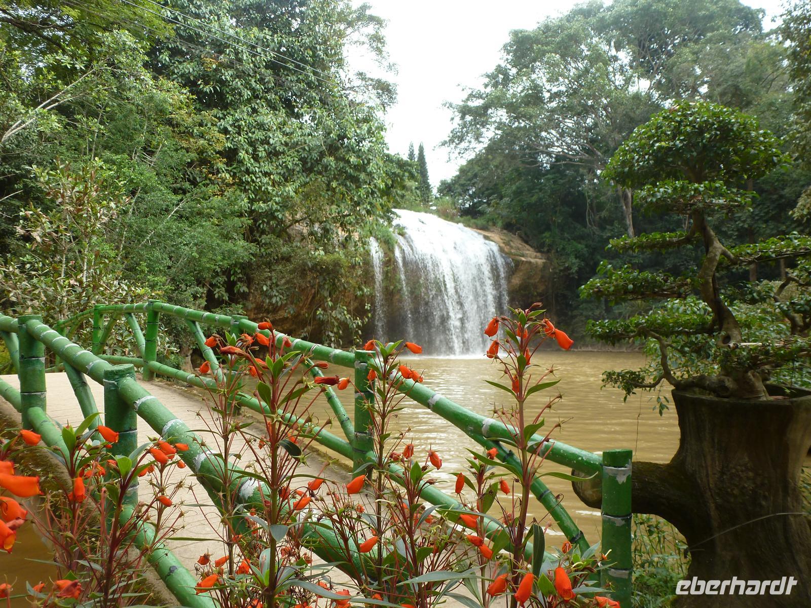 Leider mussten wir heute das angenehme Klima des vietnamesischen Hochlandes schon wieder verlassen und uns von dem schönen Örtchen Da Lat verabschieden. Unser nächstes Ziel auf unserer Reise gen Süden war die größte Stadt Vietnams und Boomtown am Saigon-River, Ho-Chi-Minh-Stadt. Auf dem Weg dahin lagen noch 320 Kilometer vor uns, knapp 10 Stunden Busfahrt also über mehr oder wenig gut ausgebaute Straßen. Unweit von Da Lat machten wir unseren ersten Stopp am Prenn-Wasserfall, für sich genommen ziemlich unspektakulär, deshalb wurde drum herum ein kleiner Freizeitpark in einer schönen Gartenanlage gestaltet. Als wir den Park betraten, waren wir fast die ersten Gäste und konnten die einheimischen Dienstleister bei ihren Vorbereitungen auf das Tagesgeschäft beobachten. Wer wollte, konnte gegen einen kleinen Obolus auch einen kurzen Ausritt auf einem Elefanten oder Strauß unternehmen. Nach ein, zwei Tässchen Lotus- oder Jasmintee bestiegen wir wieder unseren Bus und weiter ging die Fahrt ins Tiefland Richtung Saigon. Unterwegs wechselten sich Reis- und Gemüsefelder mit dichtem, grünen Dschungel ab, wir passierten kleine, ärmliche Ortschaften der ansässigen Minderheiten und stoppten hin und wieder für ein interessantes Foto. Wir schauten uns an, wie die hiesigen Bauern Reis und Kaffee zur Trocknung auslegten und fuhren an großen Teeplantagen vorbei. Im schönem “Cafe Tram Anh“ in Bao Loc verkosteten wir den starken, einheimischen Kaffee und verschiedene Teesorten. Wer wollte, konnte anschließend seine favorisierte Mischung auch käuflich erwerben. Der für uns Europäer eher ungewöhnlich gefilterte, teilweise auch kalt getrunkene Kaffee ist am