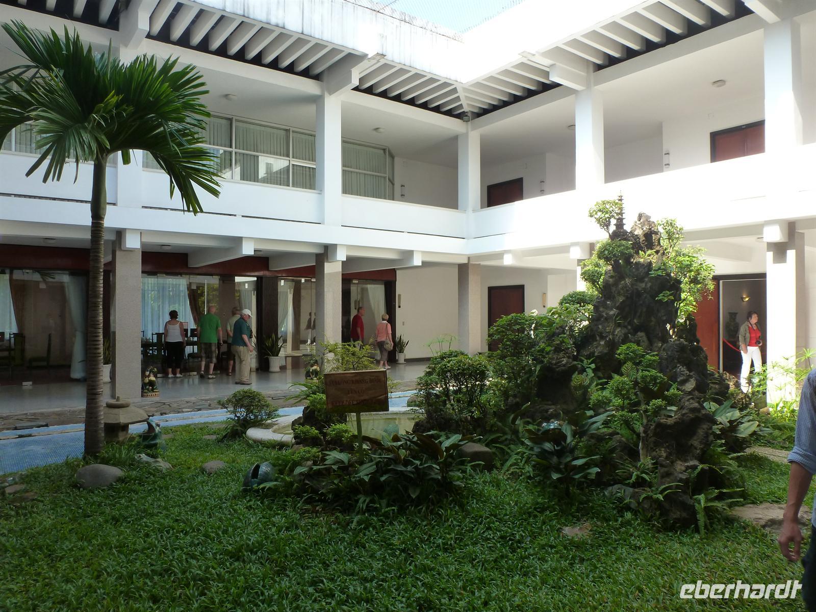 die Schönheit der Umgebung führten. Zum Abschluss unserer Schiffstour wurde uns ein schmackhaftes Brunch-Buffet dargeboten, währenddessen wir in den Hafen von Halong-City zurückfuhren und die Eindrücke der letzten 24 Stunden an Bord nochmals Revue passieren ließen. Nach dem Ausschiffen verließen wir den Golf von Tonkin und fuhren mit unserem Bus zurück nach Hanoi. Unterwegs stoppten wir an einem Obststand, um Frische Maracuja und Babyananas zu kosten. Bei einem Rundgang durch ein Dorf bekamen wir unverfälschte Eindrücke vom Alltag und den Lebensumständen der einfachen vietnamesischen Bauernfamilien und probierten an kleinen Ständen Zuckerrohrsaft, Guaven und Mandarinen. Zurück in der nordvietnamesischen Metropole bezogen wir unsere Zimmer im 5-Sterne-Hotel Nikko Hanoi und bereiteten uns für das Abendessen vor, welches wir Restaurant Toto gegenüber dem Literaturtempel einnahmen. Als Hilfs- und Ausbildungsprojekt für vietnamesische Straßenkinder ins Leben gerufen, werden hier in einem schönen, modernen Ambiente schmackhafte asiatische Speisen serviert. Nach der Rückkehr ins Hotel gingen wir ziemlich schnell schlafen, denn Morgen stand ein langer Tag auf dem Programm.