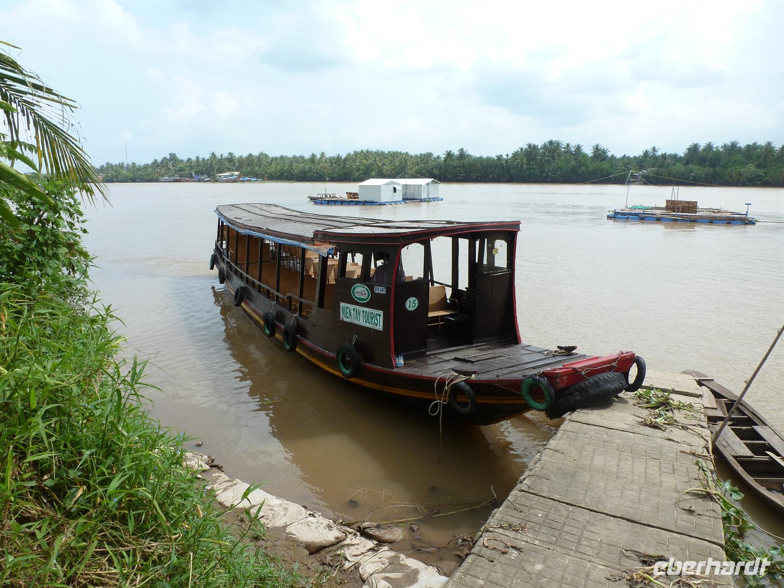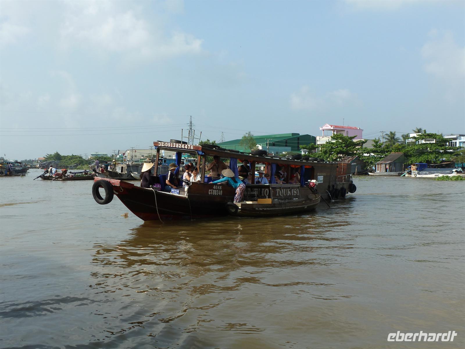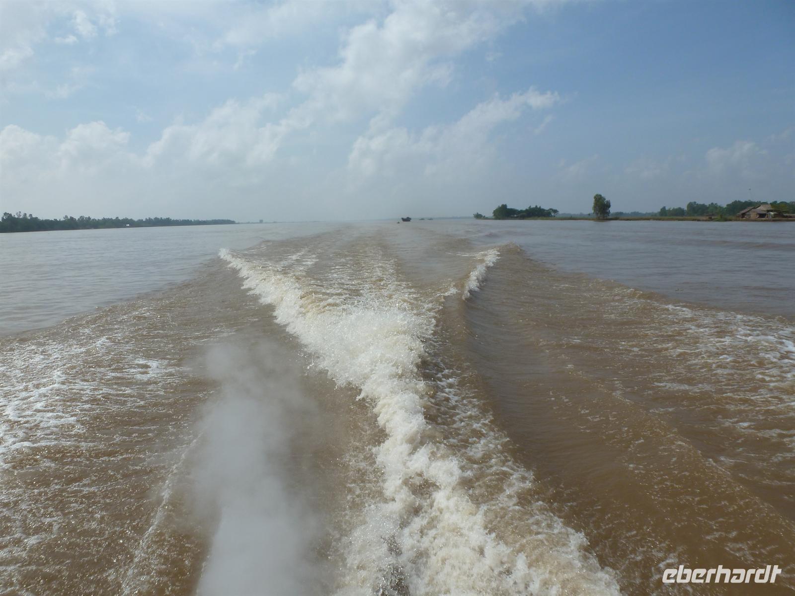 Good Morning Vietnam - und Auf Wiedersehen! Sehr zeitig am Morgen rief uns der Wecker aus den Betten, denn heute hieß es endgültig Abschied nehmen von Vietnam, einem Land, was uns in den letzten zwei Wochen gastfreundlich und offenherzig aufgenommen hatte. Wir hatten hier viele schöne Erlebnisse und wunderbare Begegnungen, haben Neues entstehen und Altes vergehen sehen und haben uns dabei immer Willkommen gefühlt. Und trotz der riesigen sozialen Unterschiede und Probleme hatten die Menschen, denen wir begegneten, meistens ein Lächeln im Gesicht und den unverkennbaren Drang, ein selbstbestimmtes und zufriedenes Leben zu führen. Unser Bus brachte uns noch die paar Meter zur Schnellbootanlegestelle, wo wir uns von unserem kompetenten, liebenswerten und sympathischen Reiseleiter Ot verabschiedeten, der uns vierzehn Tage lang in die Essenswerten Geheimnisse der vietnamesischen Küche eingeweiht und jedesmal mit den Worten „…schmeckt wuuunderbar…“ die Scheu vor dem Neuen genommen hatte. Ob Frosch, Maus oder Hund, nach seiner Meinung gehört alles in den Mund. Nach der Verladung unserer Koffer und dem Zustieg aller Gäste legen wir mit drei Mann Besatzung und 23 Passagieren an Bord Richtung Grenze ab. Mit knapp dreißig Kilometer pro Stunden huschten wir über die schmutzigen Fluten des Mekong, bis… bereits nach 30 Minuten das erste Mal der Motor erstarb. Rrrrar. Was jetzt? Unser Kapitän wusste sich Rat und hatte auch schnell das Problem lokalisiert. Es war der Dieselfilter, welcher wohl neben Diesel auch Luft zog. Fünf Minuten entlüften und