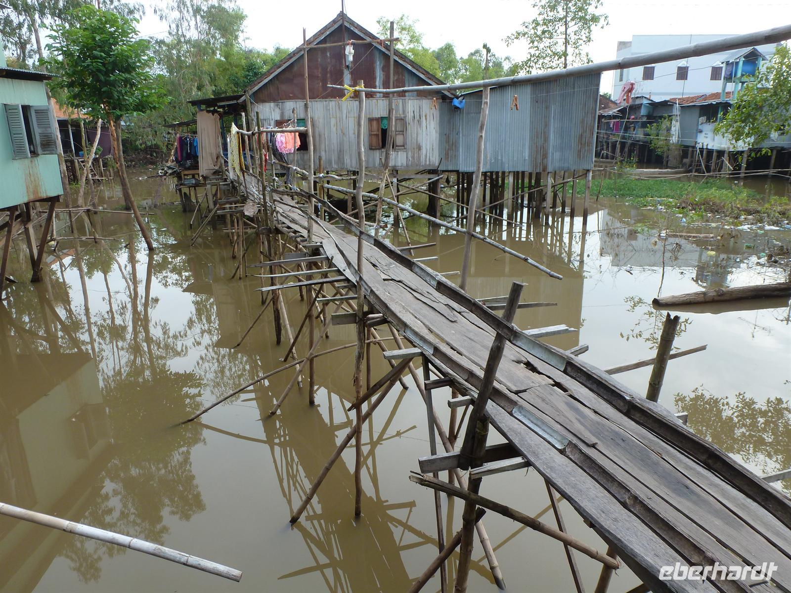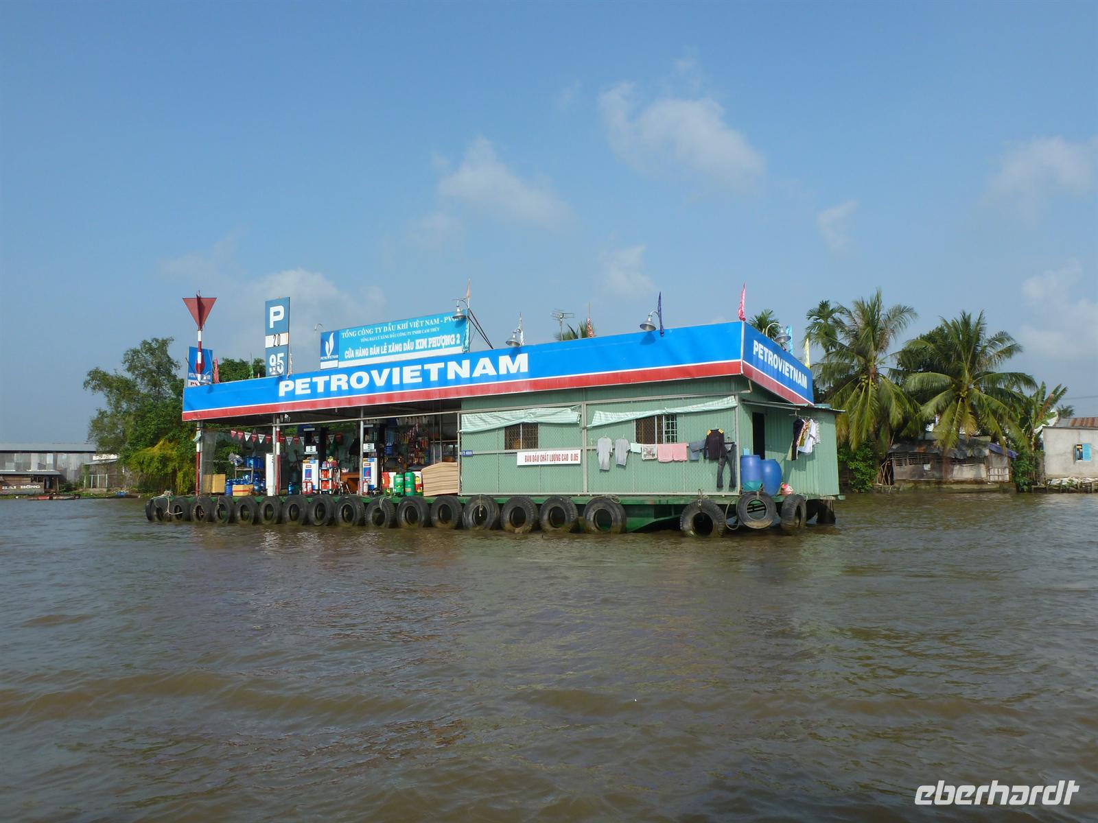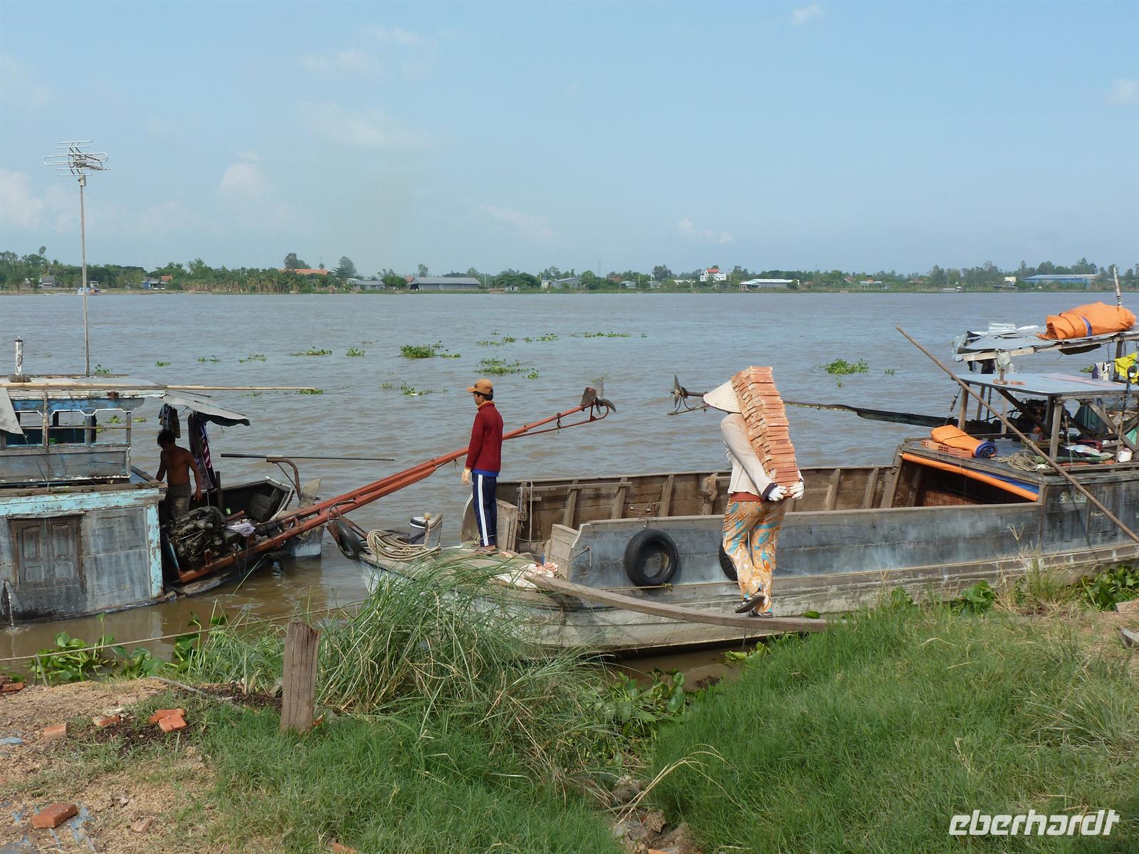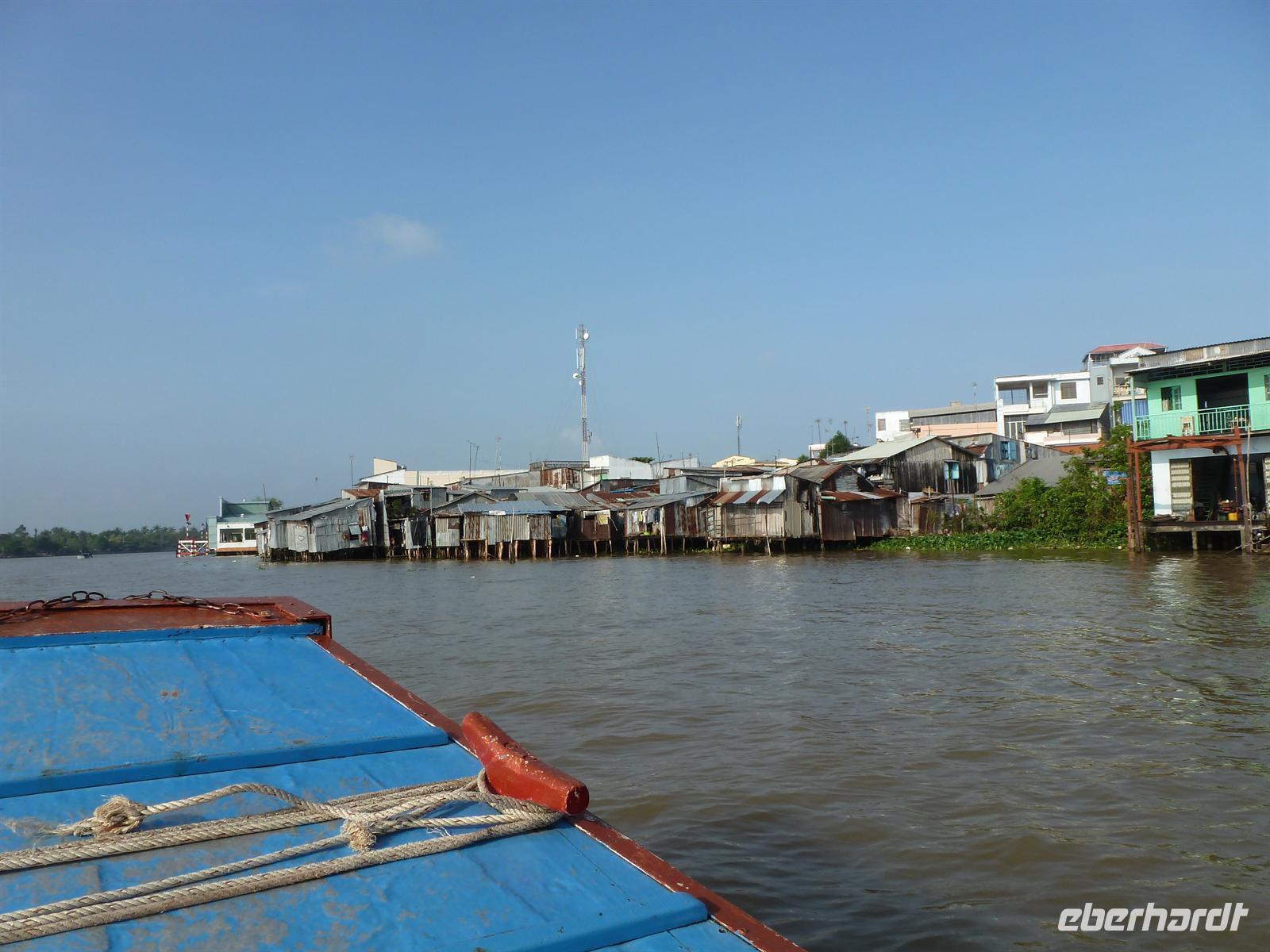 Good Morning Vietnam - und Auf Wiedersehen! Sehr zeitig am Morgen rief uns der Wecker aus den Betten, denn heute hieß es endgültig Abschied nehmen von Vietnam, einem Land, was uns in den letzten zwei Wochen gastfreundlich und offenherzig aufgenommen hatte. Wir hatten hier viele schöne Erlebnisse und wunderbare Begegnungen, haben Neues entstehen und Altes vergehen sehen und haben uns dabei immer Willkommen gefühlt. Und trotz der riesigen sozialen Unterschiede und Probleme hatten die Menschen, denen wir begegneten, meistens ein Lächeln im Gesicht und den unverkennbaren Drang, ein selbstbestimmtes und zufriedenes Leben zu führen. Unser Bus brachte uns noch die paar Meter zur Schnellbootanlegestelle, wo wir uns von unserem kompetenten, liebenswerten und sympathischen Reiseleiter Ot verabschiedeten, der uns vierzehn Tage lang in die Essenswerten Geheimnisse der vietnamesischen Küche eingeweiht und jedesmal mit den Worten „…schmeckt wuuunderbar…“ die Scheu vor dem Neuen genommen hatte. Ob Frosch, Maus oder Hund, nach seiner Meinung gehört alles in den Mund. Nach der Verladung unserer Koffer und dem Zustieg aller Gäste legen wir mit drei Mann Besatzung und 23 Passagieren an Bord Richtung Grenze ab. Mit knapp dreißig Kilometer pro Stunden huschten wir über die schmutzigen Fluten des Mekong, bis… bereits nach 30 Minuten das erste Mal der Motor erstarb. Rrrrar. Was jetzt? Unser Kapitän wusste sich Rat und hatte auch schnell das Problem lokalisiert. Es war der Dieselfilter, welcher wohl neben Diesel auch Luft zog. Fünf Minuten entlüften und