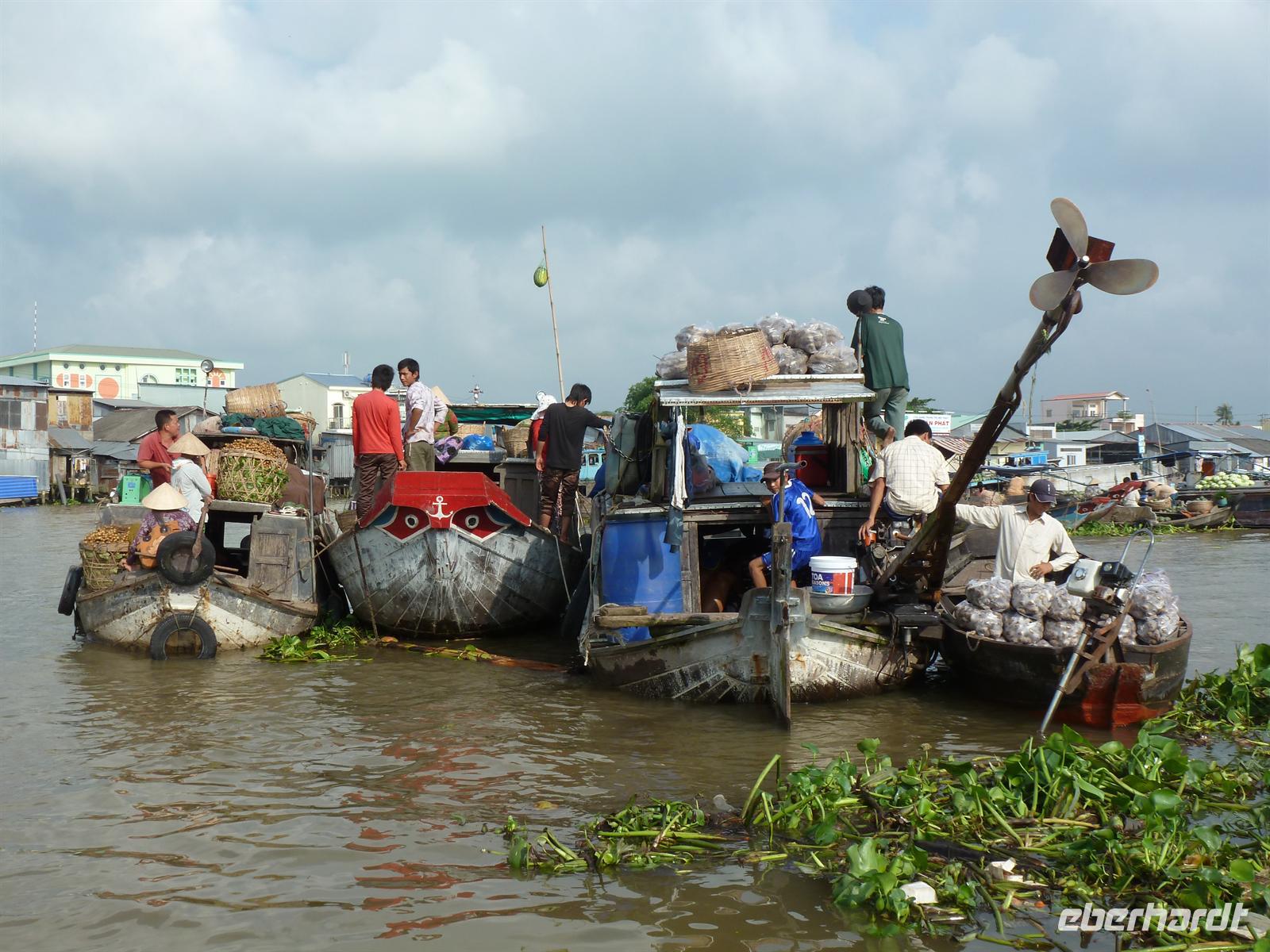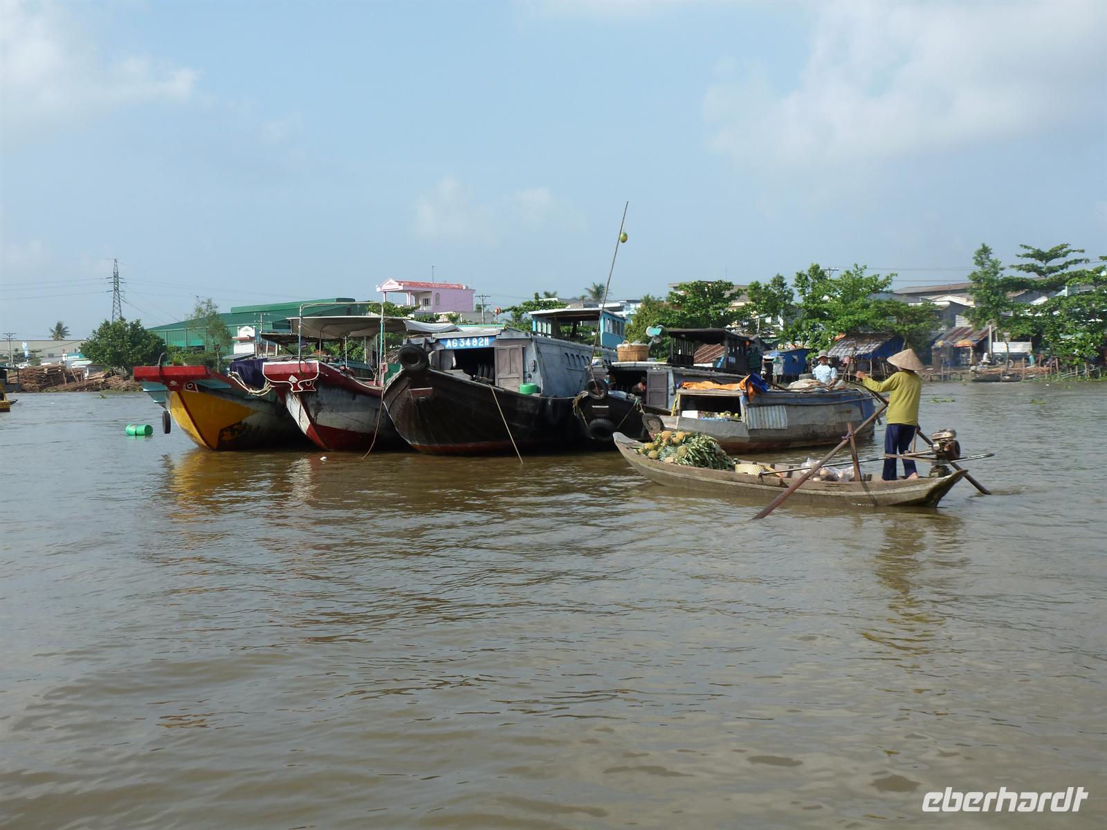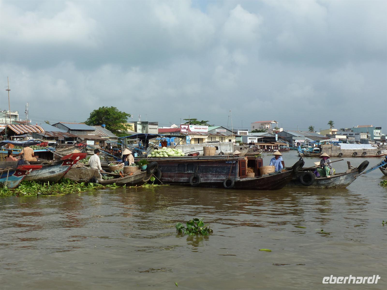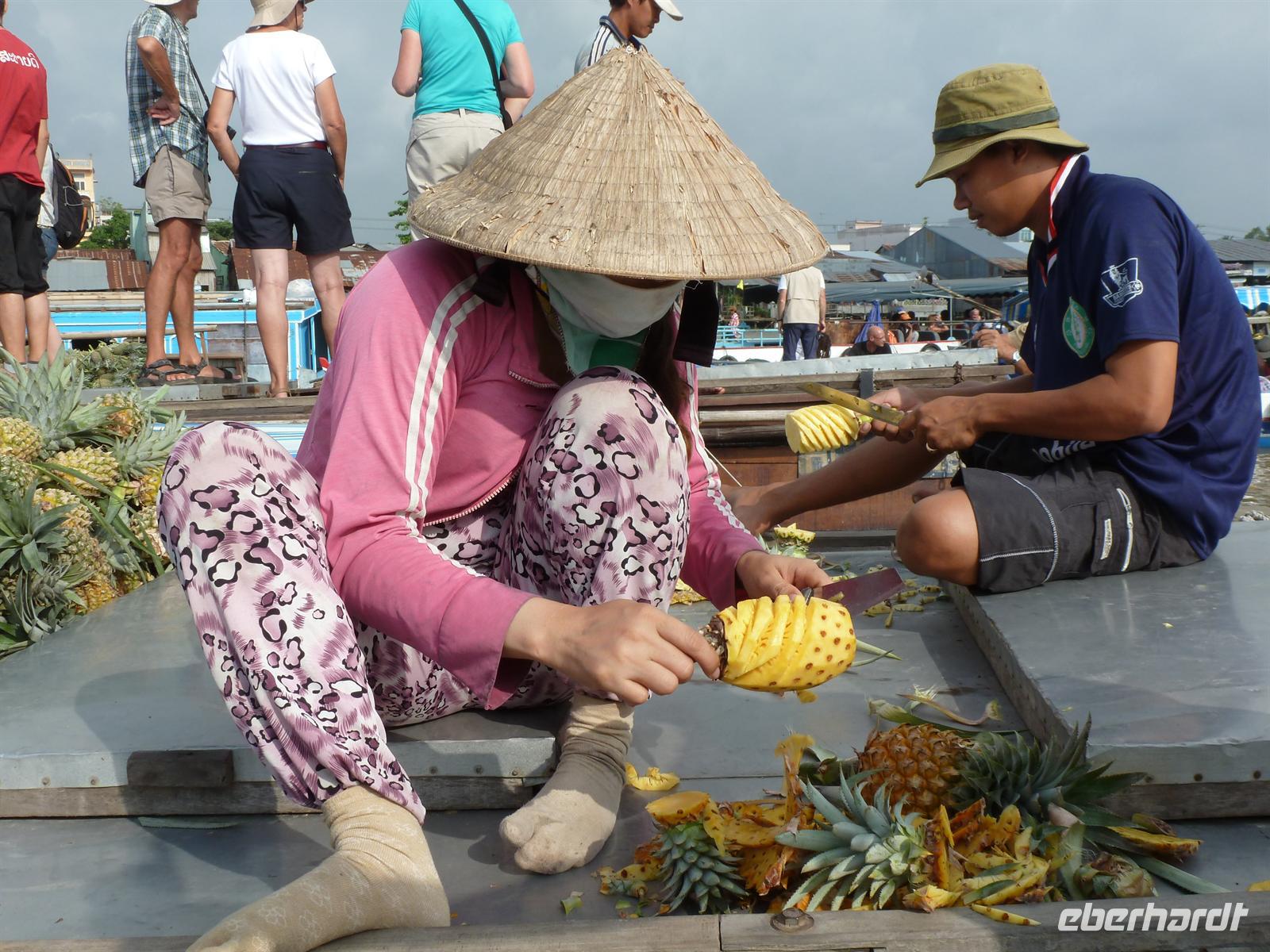 Heute hieß es wieder etwas zeitiger Aufstehen, wollten wir doch gleich am Morgen zu den berühmten „Schwimmenden Märkten“ von Can Tho. Nach einem reichhaltigen Frühstück checkten wir aus unserem Hotel aus und begaben uns zur Anlegestelle der örtlichen „Schnellbootarmada“. Ein Schiff war schnell geentert und wir nahmen Kurs auf den Höhepunkt des noch jungen Tages. Mit uns durchpflügten weitere Bötchen das lehmig-braune Wasser und beinahe alle hatten das gleiche Ziel. Die „schwimmenden Märkte“ sind eine lockere Ansammlung von Booten aller Größen, die ihre Produkte an langen Stangen hängend kund tun und vom Boot aus verkaufen. Dabei handelt es sich fast ausschließlich um Nahrungsmittel, Obst, Gemüse und ein paar wenige fliegende „Supermärkte en Miniatur“. Wir schlängelten uns durch das bunte Treiben und machten an einem Ananaskahn längsseits fest, um von den leckeren Früchten zu kosten. Nach weiteren