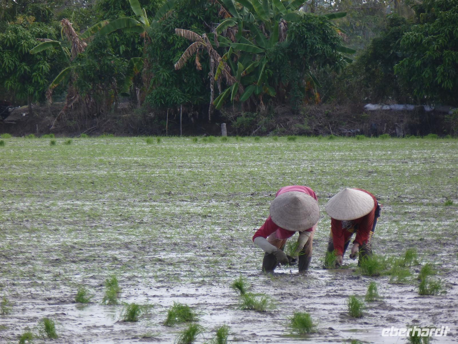 Ein Tag, zwei Nächte, mehr Zeit blieb uns leider in dieser faszinierenden Stadt am Saigon-River nicht für Erkundungen, denn unsere Reise ging weiter in die Reiskammer Vietnams, in das Herz und die Lebensader einer ganzen Region, ins Mekong-Delta. Unser heutiges Programm bestand zu einem Großteil aus Bootsfahrten im Delta, deshalb führte uns unser Weg nach My Tho, dem Zentrum solcherart Touristenaktivitäten. Dort angekommen, gingen wir mit einer freundlichen vietnamesischen Führerin an Bord eines Sampans, eines langen und schmalen Holzbootes mit Platz für ca. 40 Passagiere. Zur Begrüßung bekommen wir alle Kokosnussmilch in der Frucht. Während wir diese Erfrischung genießen, gleiten wir auf den braunen Wassern des Mekong an Fischfarmen, Mangroven und von Kokospalmen gesäumten Ufern vorbei hin zur kleinen Insel Quo Son, wo wir anlegen und aussteigen. Wir verkosten bei einem Imker grünen Tee mit Honig und Limette und können verschiedene Produkte auch kaufen (Gelee Royal), danach fahren wir mit kleinen Eselkarren durch ein Dorf, sehr zum Leid der Esel, aber zum Spaß der Bewohner. Im Anschluss daran gab es Ananas, Pomelo, Papaya, Mango und Brotfrucht mit folkloristischer Untermalung zu essen, bevor es mit kleineren Booten für jeweils vier Personen auf einem Mekong-Seitenarm
