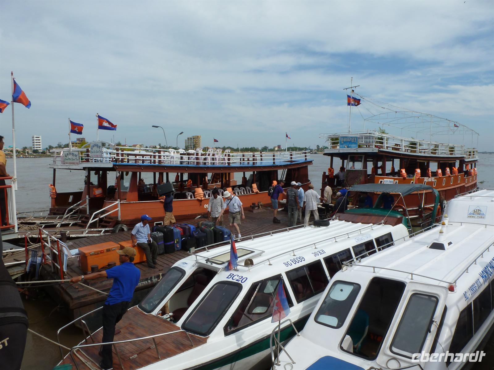 weiter ging die wilde Fahrt. Bis zum nächsten Absterben der Maschine. Bis zur vietnamesischen Grenze vollzog sich das ganze vier Mal, so dass uns ein Bootwechsel an der Grenze avisiert wurde. Nach Vollzug der Grenzformalitäten stand natürlich kein neues Boot da, denn der Kapitän hatte zwischenzeitlich mit einer vielköpfigen vietnamesischen Ingenieursanwärter-Crew das Problem in den Griff bekommen. Wurde uns von allen Seiten beteuert und ungefähr fünf Mal geschworen. Nun gut, es ist ja nur der Mekong und nicht der Stille Ozean. Wird schon gut gehen. Wir also wieder aufs Schiff und ab durch die Mitte zur kambodschanischen Grenze. Ohne Ausfall! Hut ab, dann hatten sie ja doch nicht übertrieben. Nach dem Grenzprozedere, welches ohne Probleme verlief, schnurrten wir also wieder mit vollem Speed in Richtung Phnom Penh. 80 Kilometer lagen vor uns, mit Dampf aus allen Kesseln in ca. drei Stunden zu schaffen. Wir saßen auf dem Unter- oder Oberdeck und waren so schnell unterwegs, dass wir wahrscheinlich sogar Wasserski hätten fahren können, wenn der Mekong nicht eine so schlammige Brühe gewesen wäre. Bis zum …. Rrrrar. Da war es wieder. Das Maschinenproblem. Alles erstarrte und die Gespräche erstarben. Was jetzt? Evakuieren? Frauen, Kinder und Gäste ohne Nachlassregelung zuerst? Oder vielleicht erst alle Touristen mit Stoffkoffern, Hartschale schwimmt länger? Oder doch lieber Ruhe bewahren…? Fragen über Fragen. Wir haben uns dann für letzteres entscheiden, da der Mekong hier 1,5 Kilometer breit war und Rettungsboote nicht in Sicht. Dem Kapitän war das ganze natürlich sichtlich peinlich, er löste das Problem aber auf die bisherige Art und Weise. Was soll ich sagen? Die Geschichte ist relativ schnell zu Ende erzählt. Das satte Motorbrummen erstarb noch weitere 11 Mal, wir gewöhnten uns auch ganz gut daran, nur die Durchschnittsgeschwindigkeit sank auf ganze zehn Kilometer pro Stunde, was für Wasserski dann eindeutig zu langsam war. Dafür sangen manche sogar „…eine Seefahrt, die ist lustig, eine Seefahrt die ist schön….“ bis circa fünf Kilometer vor Phnom Penh der „Ofen“ endgültig aus war. Man kabelte um Hilfe, welche uns dann dreißig Minuten später zuteil wurde. Ein weiteres Boot ging längsseits und übernahm unsere Koffer und uns. Wir erreichten Phnom Penh gegen 14.00 Uhr und waren immer noch guter Stimmung, obwohl das Schnellboot am Ende nur noch ein Tretboot war. Aber naja, keiner musste leiden, wir hatten Zeit und Essen und Getränke gab es auch. Man lernt auf Reisen, sich manchmal in das Unvermeidliche einer Situation zu fügen und diese mit Ruhe und Geduld zu meistern. Wir wurden am Pier in der kambodschanischen Hauptstadt schon von unserem einheimischen Reiseleiter Chan Thou erwartet, der uns in unser schönes Hotel ins Zentrum der Stadt begleitete. Alle nutzen die Annehmlichkeiten unseres neuen Zuhauses, um auszuspannen oder ein, zwei Runden im Pool zu schwimmen. Das Abendessen nahmen wir in einem Restaurant mit einheimischen Khmer-Spezialitäten ein, welche allen sehr gut mundeten. So verging ein weiterer Tag auf unserem Weg durch Indochina, nicht ohne Ecken und Kanten, aber mit jeder Menge neuer Erfahrungen.