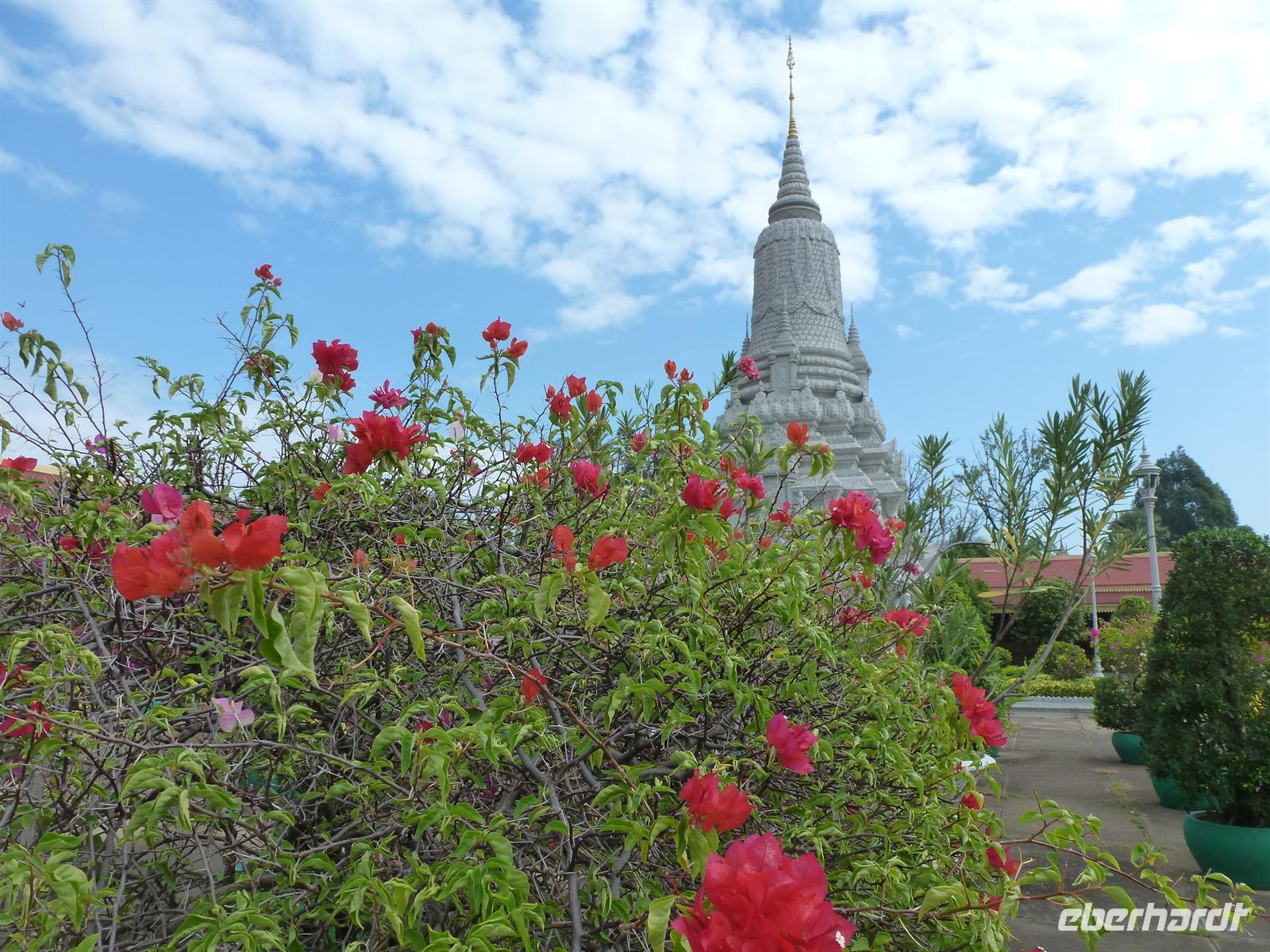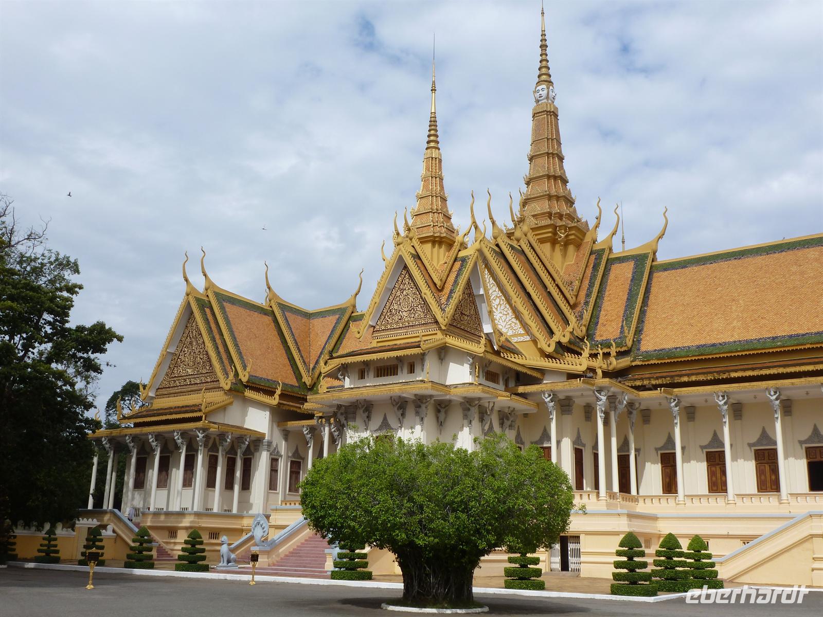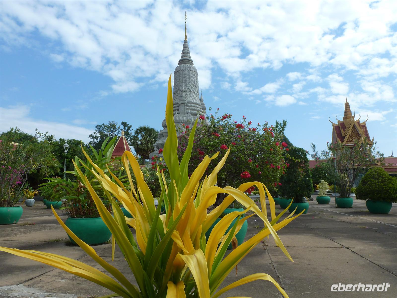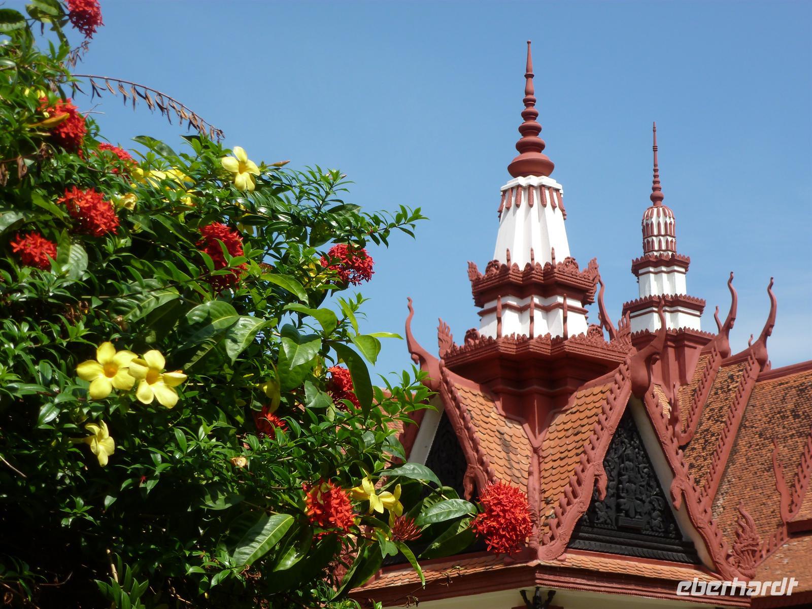 Wir waren schon ganz gespannt auf die kambodschanische Hauptstadt und ihre Sehenswürdigkeiten. Da auch heute wieder ein sehr heißer Tag werden würde, machten wir uns schon am frühen Morgen auf unsere Tour durch die unter Pol Pot einstmals fast entvölkerte Stadt. Unser erster Stopp galt dem 1958 errichteten Unabhängigkeitsdenkmal am Sihanouk-Boulevard. Danach ging es weiter zum Areal des Königspalastes, welcher schon von weitem durch die sehr schöne Khmer-Architektur sichtbar ist. Verschiedene Teile der Palastanlagen sind für Besucher zugänglich, unter anderem der 100 Meter lange und 30 Meter breite Thronsaal, die königliche Schatzkammer sowie die bekannte Silberpagode und umliegende Gebäude. Der Palast, welcher in seinen Ursprüngen aus dem Jahre 1813 stammt, ist in seiner architektonischen Darstellung ein wahres Kleinod und absolut sehenswert. Er dient seit 1939 wieder als Residenz des kambodschanischen Königs. Die anschließende Besichtigung des Nationalmuseums, welches 1917