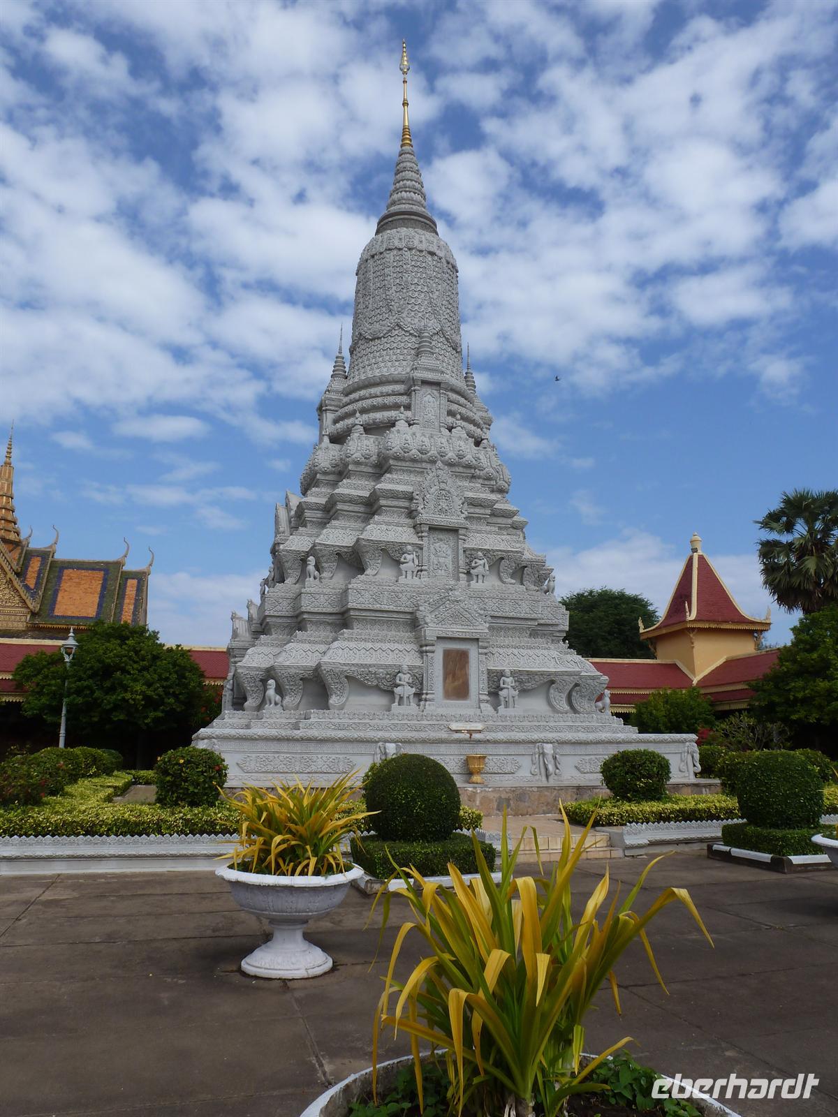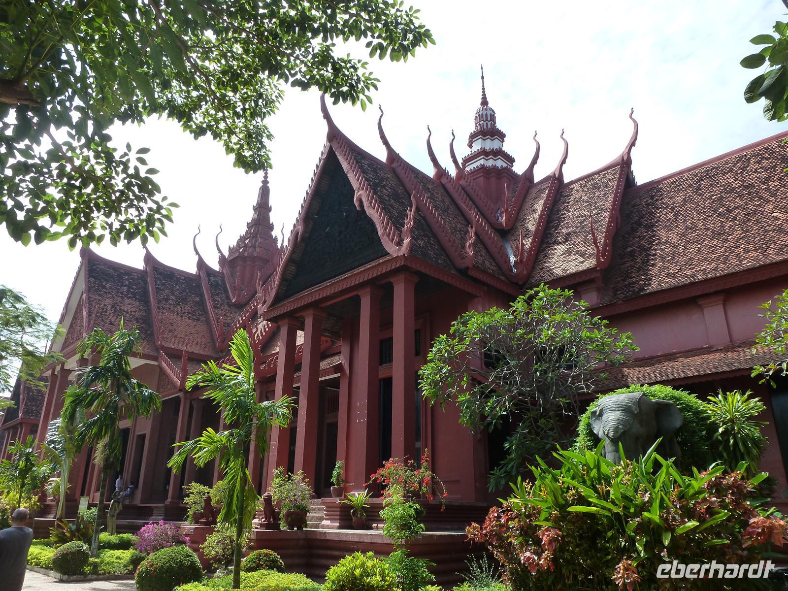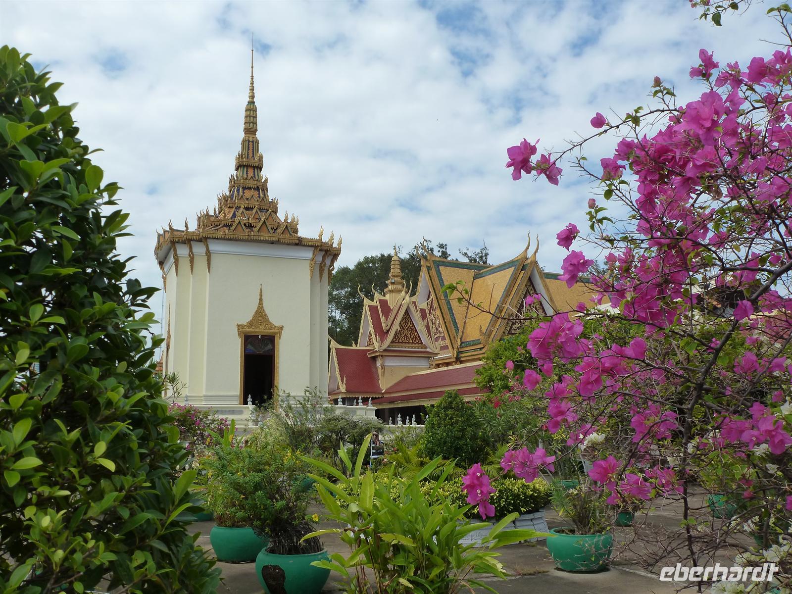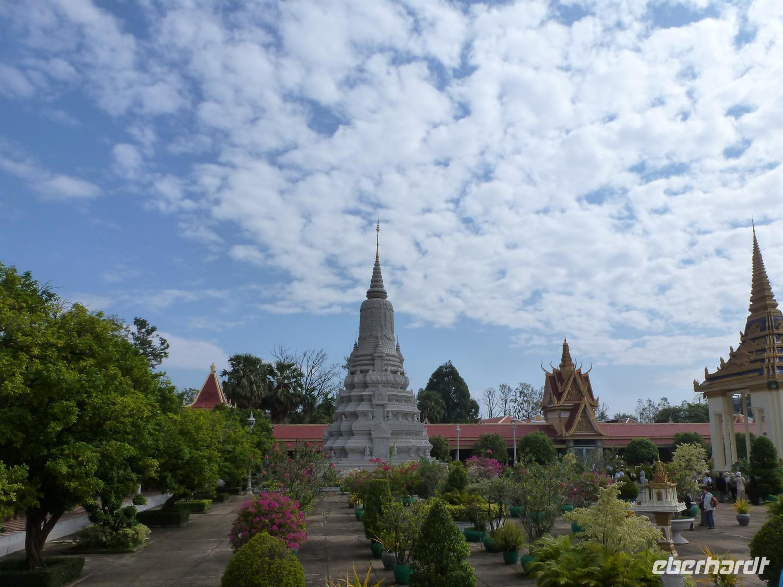 Wir waren schon ganz gespannt auf die kambodschanische Hauptstadt und ihre Sehenswürdigkeiten. Da auch heute wieder ein sehr heißer Tag werden würde, machten wir uns schon am frühen Morgen auf unsere Tour durch die unter Pol Pot einstmals fast entvölkerte Stadt. Unser erster Stopp galt dem 1958 errichteten Unabhängigkeitsdenkmal am Sihanouk-Boulevard. Danach ging es weiter zum Areal des Königspalastes, welcher schon von weitem durch die sehr schöne Khmer-Architektur sichtbar ist. Verschiedene Teile der Palastanlagen sind für Besucher zugänglich, unter anderem der 100 Meter lange und 30 Meter breite Thronsaal, die königliche Schatzkammer sowie die bekannte Silberpagode und umliegende Gebäude. Der Palast, welcher in seinen Ursprüngen aus dem Jahre 1813 stammt, ist in seiner architektonischen Darstellung ein wahres Kleinod und absolut sehenswert. Er dient seit 1939 wieder als Residenz des kambodschanischen Königs. Die anschließende Besichtigung des Nationalmuseums, welches 1917