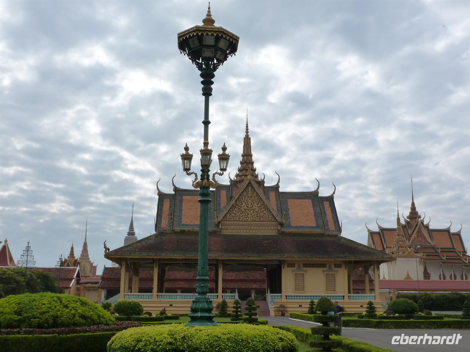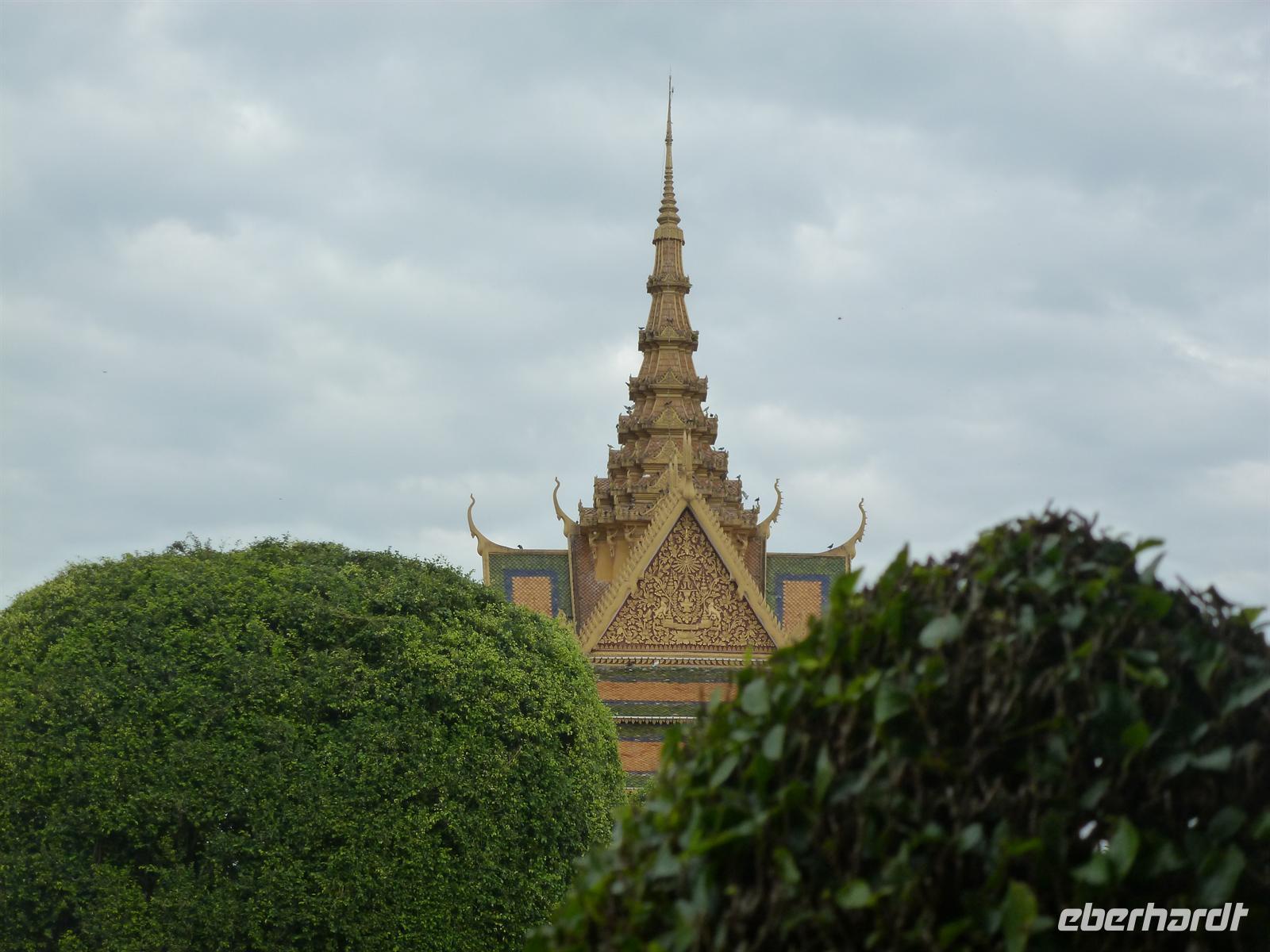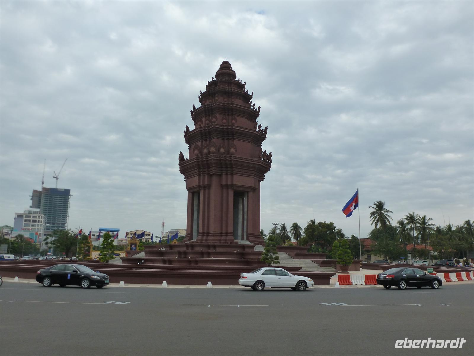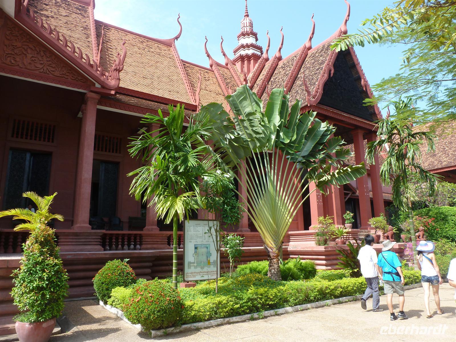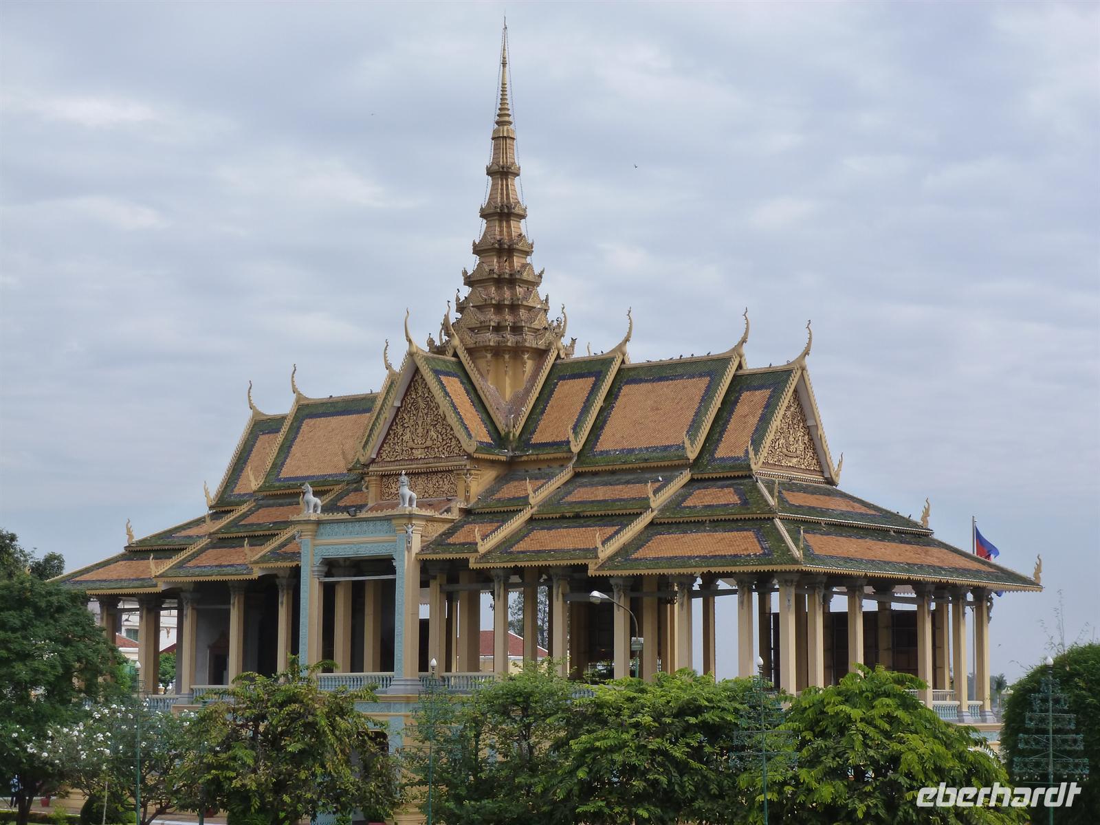 Wir waren schon ganz gespannt auf die kambodschanische Hauptstadt und ihre Sehenswürdigkeiten. Da auch heute wieder ein sehr heißer Tag werden würde, machten wir uns schon am frühen Morgen auf unsere Tour durch die unter Pol Pot einstmals fast entvölkerte Stadt. Unser erster Stopp galt dem 1958 errichteten Unabhängigkeitsdenkmal am Sihanouk-Boulevard. Danach ging es weiter zum Areal des Königspalastes, welcher schon von weitem durch die sehr schöne Khmer-Architektur sichtbar ist. Verschiedene Teile der Palastanlagen sind für Besucher zugänglich, unter anderem der 100 Meter lange und 30 Meter breite Thronsaal, die königliche Schatzkammer sowie die bekannte Silberpagode und umliegende Gebäude. Der Palast, welcher in seinen Ursprüngen aus dem Jahre 1813 stammt, ist in seiner architektonischen Darstellung ein wahres Kleinod und absolut sehenswert. Er dient seit 1939 wieder als Residenz des kambodschanischen Königs. Die anschließende Besichtigung des Nationalmuseums, welches 1917