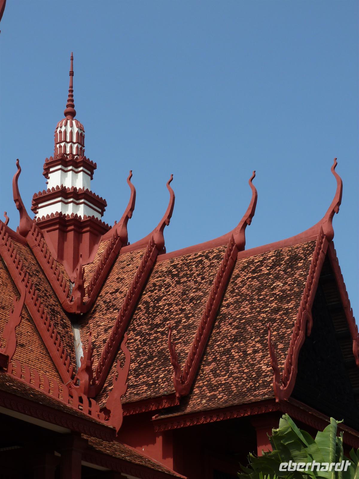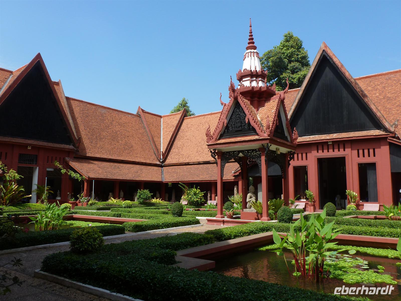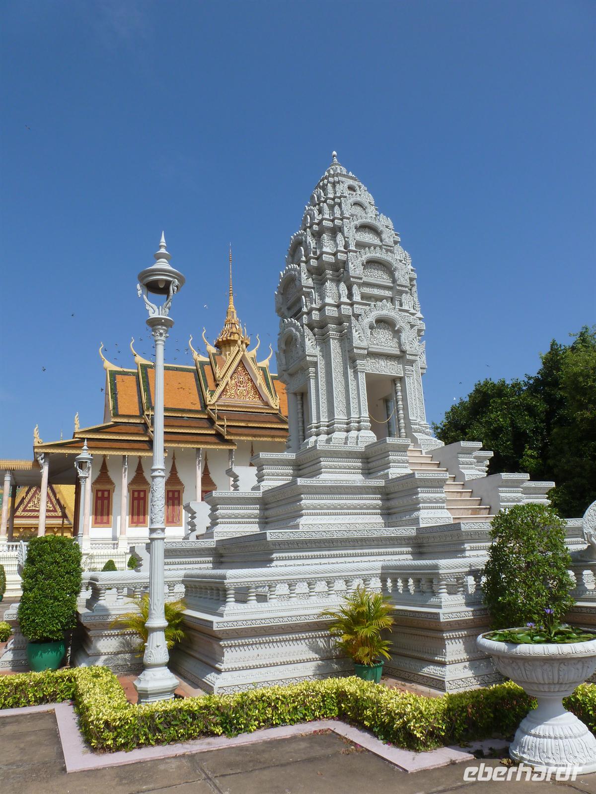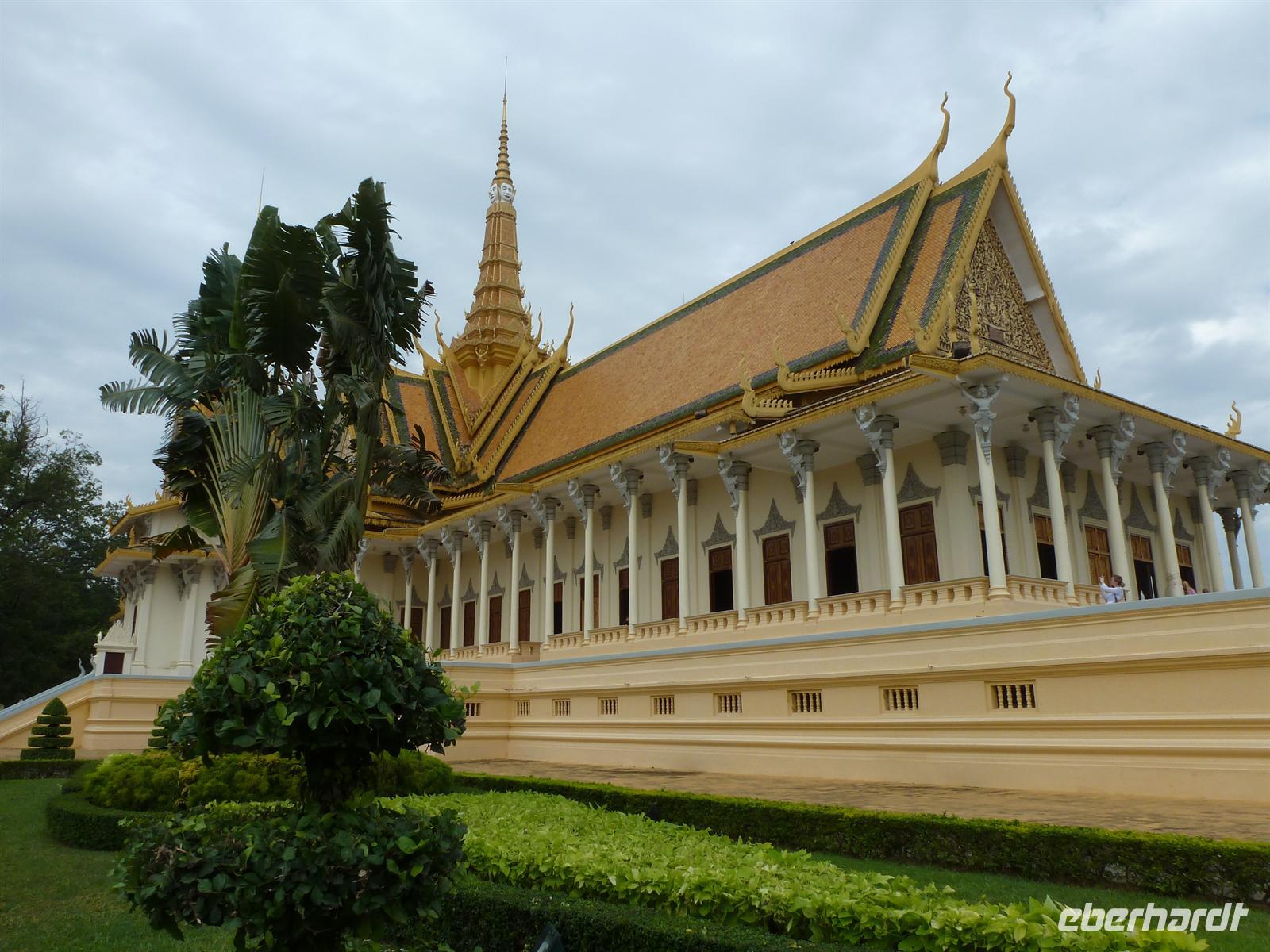 Wir waren schon ganz gespannt auf die kambodschanische Hauptstadt und ihre Sehenswürdigkeiten. Da auch heute wieder ein sehr heißer Tag werden würde, machten wir uns schon am frühen Morgen auf unsere Tour durch die unter Pol Pot einstmals fast entvölkerte Stadt. Unser erster Stopp galt dem 1958 errichteten Unabhängigkeitsdenkmal am Sihanouk-Boulevard. Danach ging es weiter zum Areal des Königspalastes, welcher schon von weitem durch die sehr schöne Khmer-Architektur sichtbar ist. Verschiedene Teile der Palastanlagen sind für Besucher zugänglich, unter anderem der 100 Meter lange und 30 Meter breite Thronsaal, die königliche Schatzkammer sowie die bekannte Silberpagode und umliegende Gebäude. Der Palast, welcher in seinen Ursprüngen aus dem Jahre 1813 stammt, ist in seiner architektonischen Darstellung ein wahres Kleinod und absolut sehenswert. Er dient seit 1939 wieder als Residenz des kambodschanischen Königs. Die anschließende Besichtigung des Nationalmuseums, welches 1917