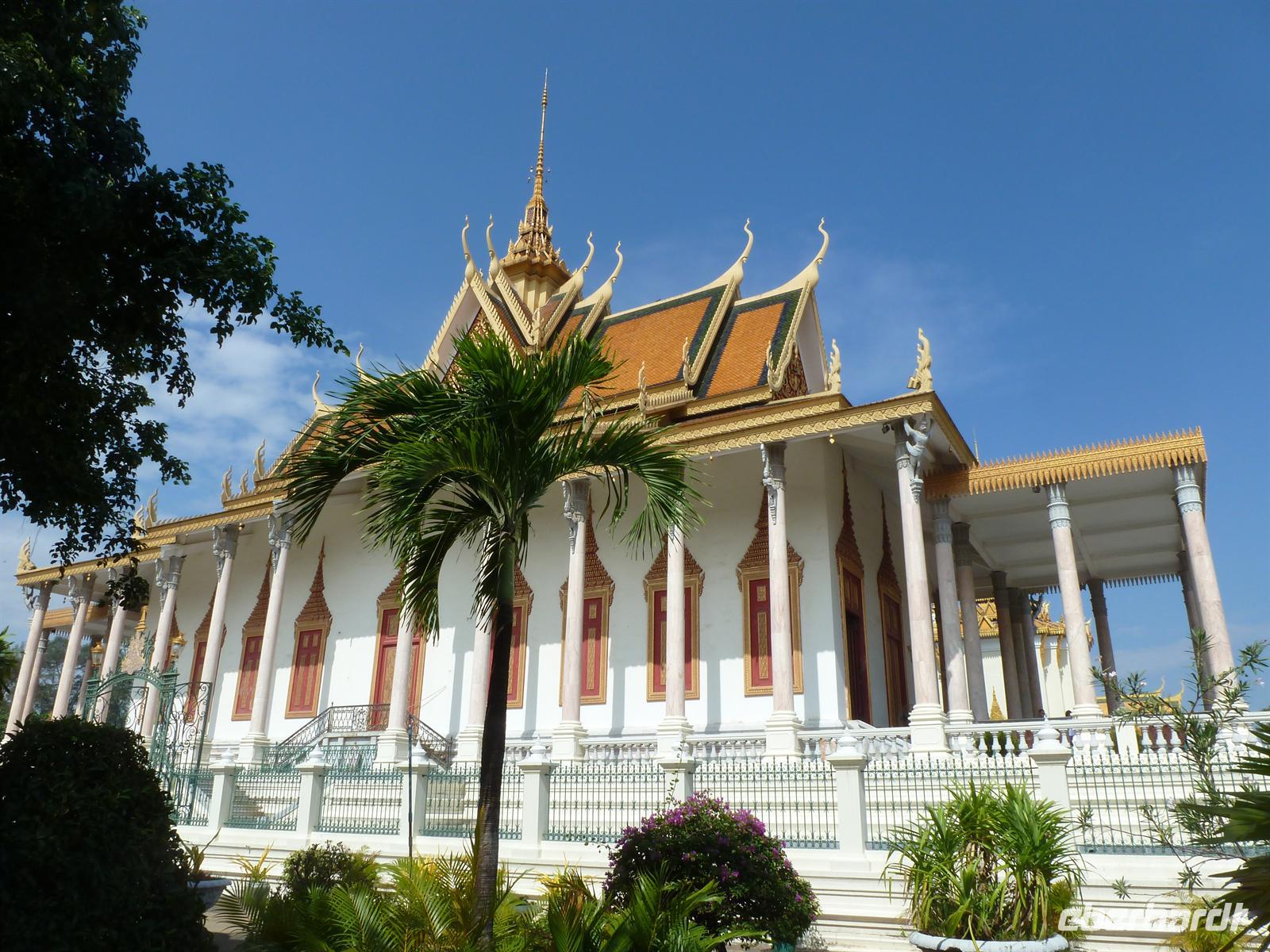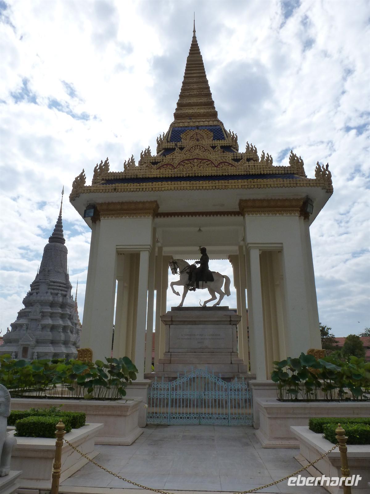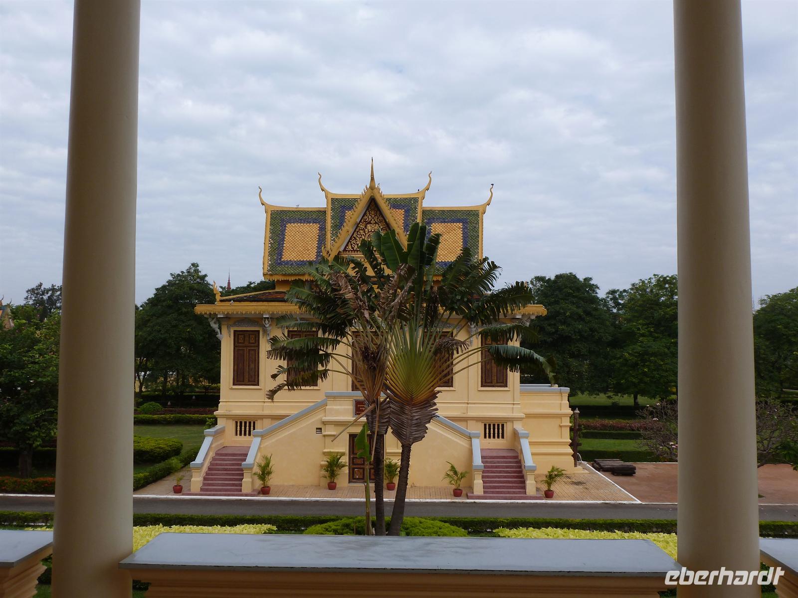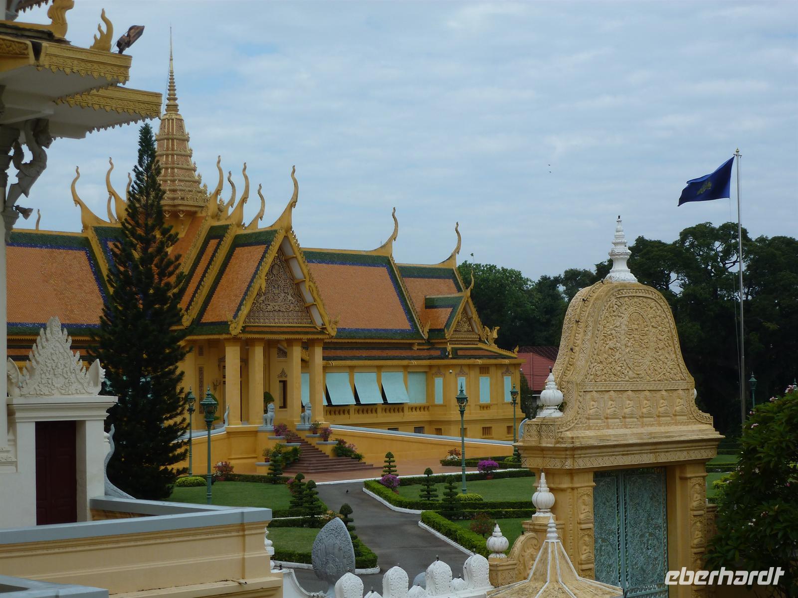 Wir waren schon ganz gespannt auf die kambodschanische Hauptstadt und ihre Sehenswürdigkeiten. Da auch heute wieder ein sehr heißer Tag werden würde, machten wir uns schon am frühen Morgen auf unsere Tour durch die unter Pol Pot einstmals fast entvölkerte Stadt. Unser erster Stopp galt dem 1958 errichteten Unabhängigkeitsdenkmal am Sihanouk-Boulevard. Danach ging es weiter zum Areal des Königspalastes, welcher schon von weitem durch die sehr schöne Khmer-Architektur sichtbar ist. Verschiedene Teile der Palastanlagen sind für Besucher zugänglich, unter anderem der 100 Meter lange und 30 Meter breite Thronsaal, die königliche Schatzkammer sowie die bekannte Silberpagode und umliegende Gebäude. Der Palast, welcher in seinen Ursprüngen aus dem Jahre 1813 stammt, ist in seiner architektonischen Darstellung ein wahres Kleinod und absolut sehenswert. Er dient seit 1939 wieder als Residenz des kambodschanischen Königs. Die anschließende Besichtigung des Nationalmuseums, welches 1917