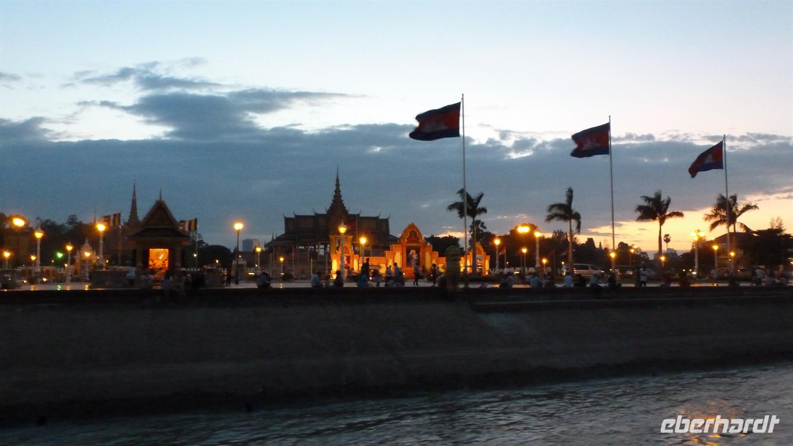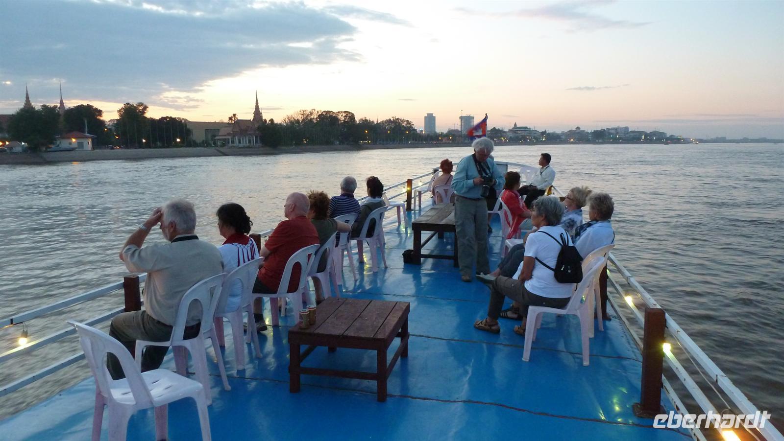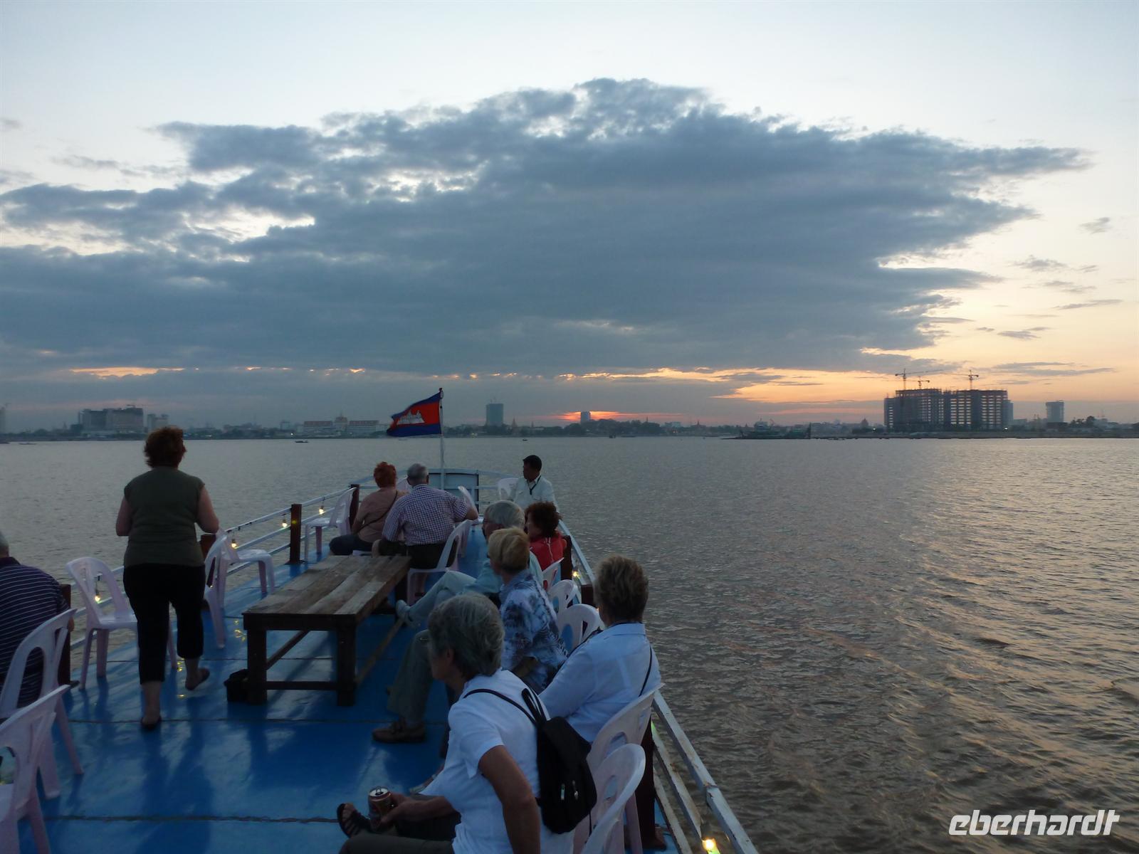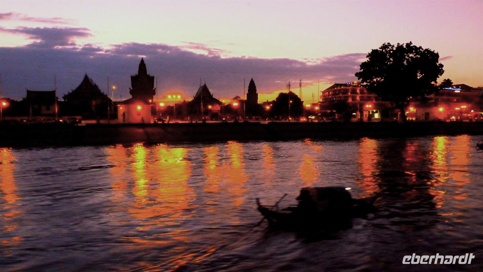 eröffnet wurde und über 5000 Ausstellungsstücke aus der Angkor/ Khmer-Zeit beherbergt, gibt uns einen guten Überblick über die religiösen und kulturellen Einflüsse der einzelnen Epochen. Weiter geht unsere Tour durch das moderne Phnom Penh, vorbei an im Bau befindlichen Hochhäusern, Schulen, Universitäten, Ministerien und breiten Boulevards. Uns erstaunt, dass wir eine relativ gepflegte Innenstadt mit breiten, guten Straßen und jede Menge großer Autos zu Gesicht bekommen, ist doch Kambodscha im Vergleich mit Vietnam ein weitaus ärmeres Land. Doch innerhalb der Grenzen der Hauptstadt ist davon gar nichts zu spüren. Sicherlich ist Phnom Penh lange nicht so prosperierend wie Shanghai, Saigon oder Bangkok, dafür ist es hier ein ganz klein wenig sauberer, ein bisschen weniger lärmend und fast „unchaotisch“. Aber es ist und bleibt natürlich eine südostasiatische Großstadt, mit allen Problemen, die man in einer solchen Stadt sucht und am Ende auch findet. Unsere letzte Besichtigung für diesen Vormittag gilt dem Wat Phnom Penh, einer Pagode inmitten einer Parkanlage, welche im Jahre 1372 durch Frau Penh, der Namensgeberin der Stadt, zu Ehren vierer von ihr gefundener Buddha-Statuen an dieser Stelle gegründet wurde. Nach der Besichtigung der Pagode und der Stupa fuhren wir nach einem kleinen Mittagessen zu unserem Hotel zurück, da es mittlerweile so heiß war, dass allen nach einer Abkühlung im Pool oder einfach nur nach Schatten zumute war. Am frühen Abend trafen wir uns alle wieder und gemeinsam machten wir uns zu einer weiteren Bootstour auf den Weg, dieses Mal zu einer Lichterfahrt auf dem Tonle-Sap-Fluss im Licht der letzten Strahlen der untergehenden Sonne. Wir waren die einzigen Gäste an Bord und genossen bei kalten Getränken und angenehmen Temperaturen um die 25 Grad den rotgetönten Himmel über dem Königspalast und die sich stetig ändernden Farben der kambodschanischen Hauptstadt. Nach einer Stunde Fahrt entlang der Uferpromenaden hatte sich Dunkelheit über die Stadt gelegt und das farbige Lichtspiel der Nacht begann in allen Schattierungen. Wir gingen augenseitig satt und zufrieden an Land und begaben uns zu einem Lokal in Hafennähe, um auch bauchseitig die innere Harmonie herzustellen. Begleitet von Live-Musik bekamen wir ein vorzügliches Abendessen kredenzte, welches geschmacklich bisher ganz oben auf der kulinarischen Richter-Skala anzusiedeln war.