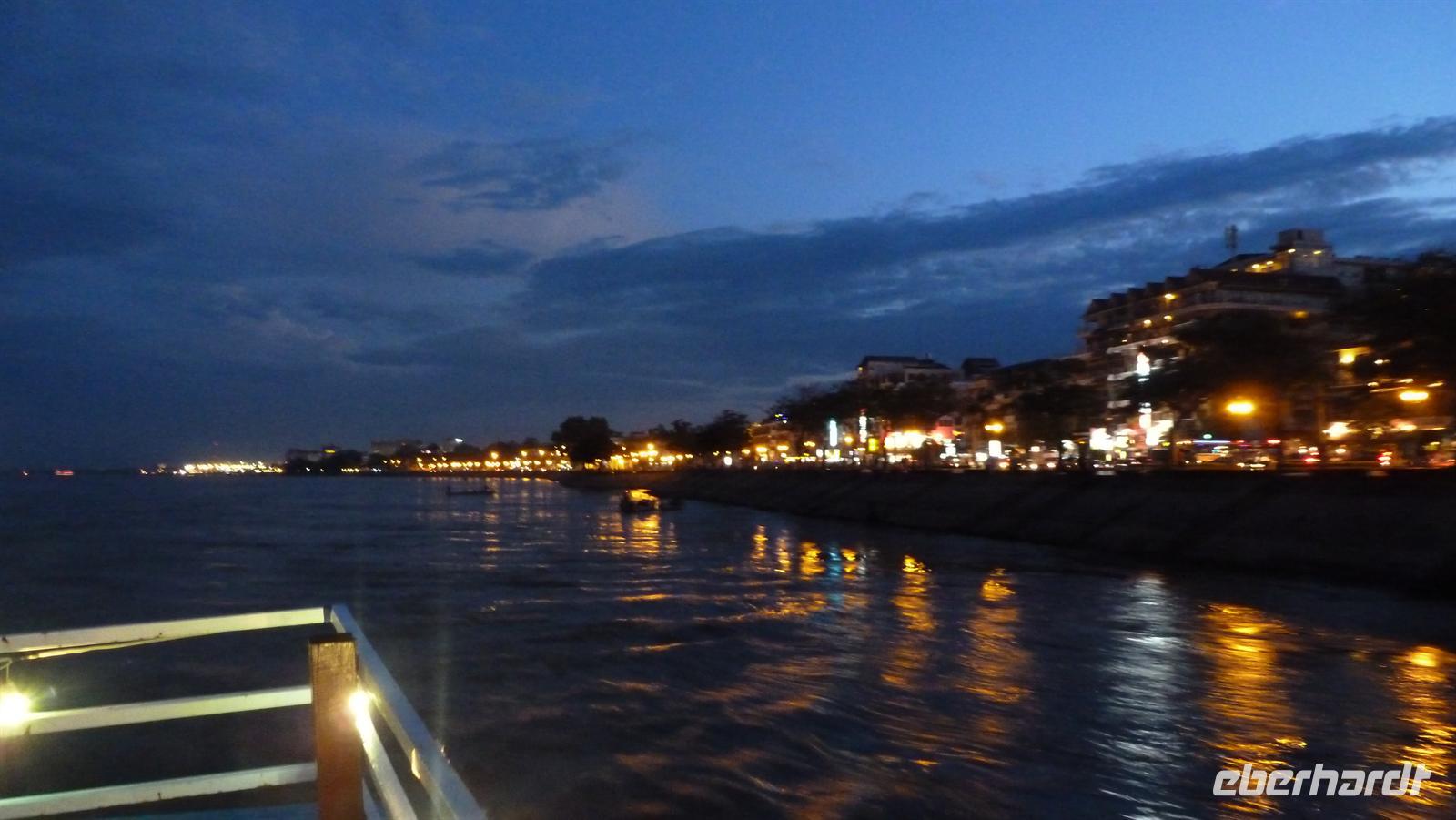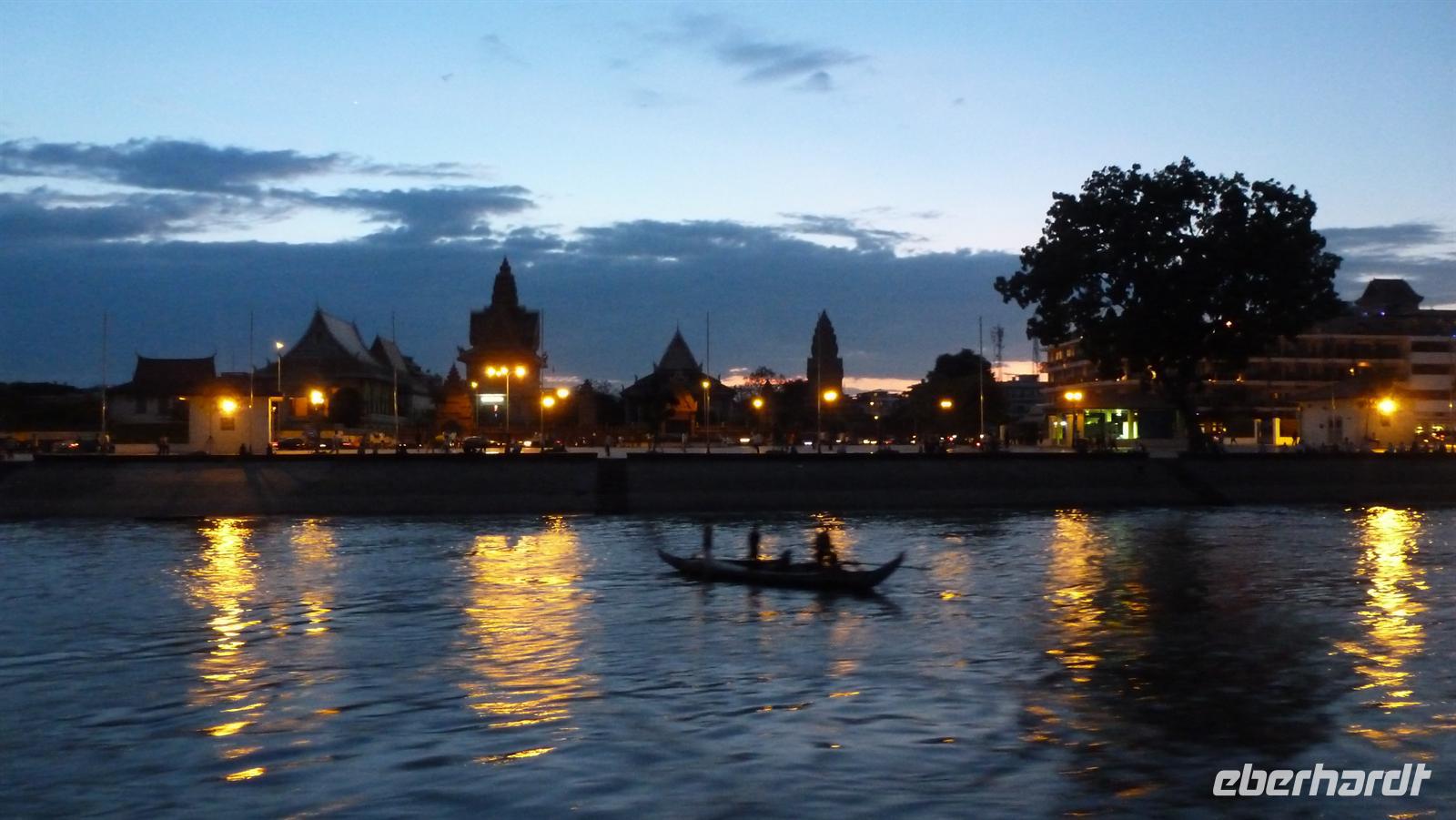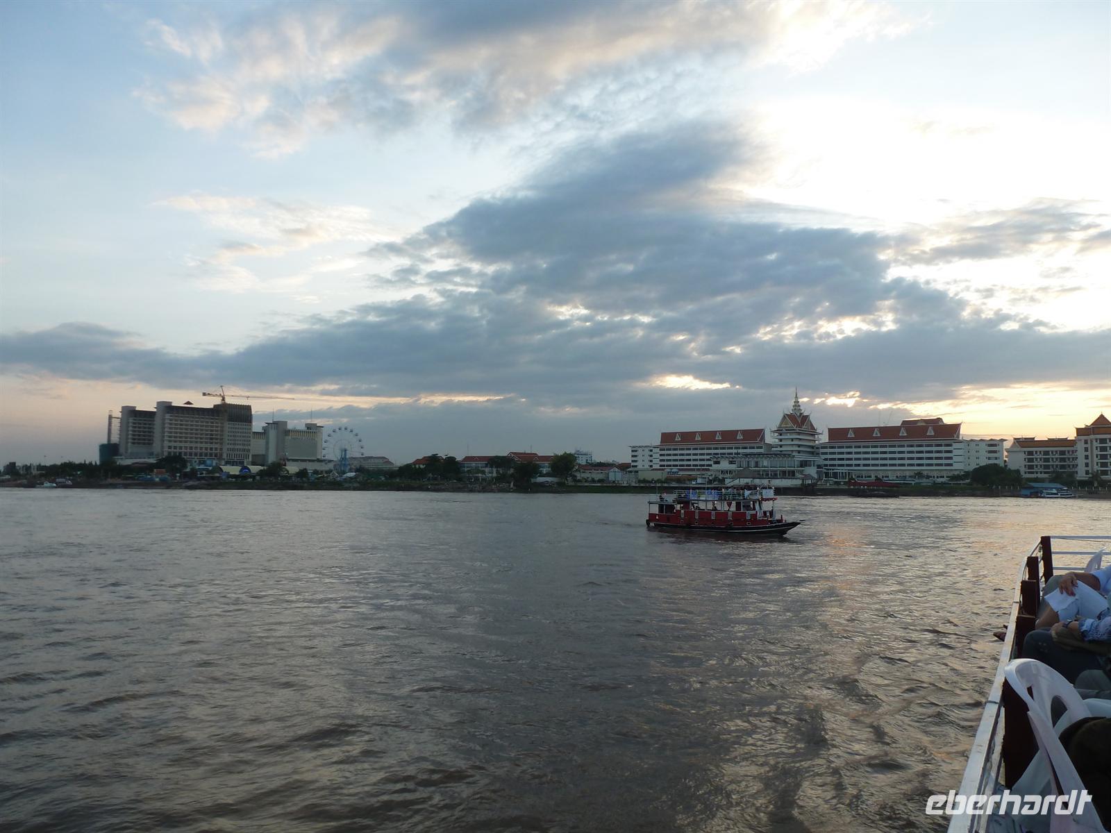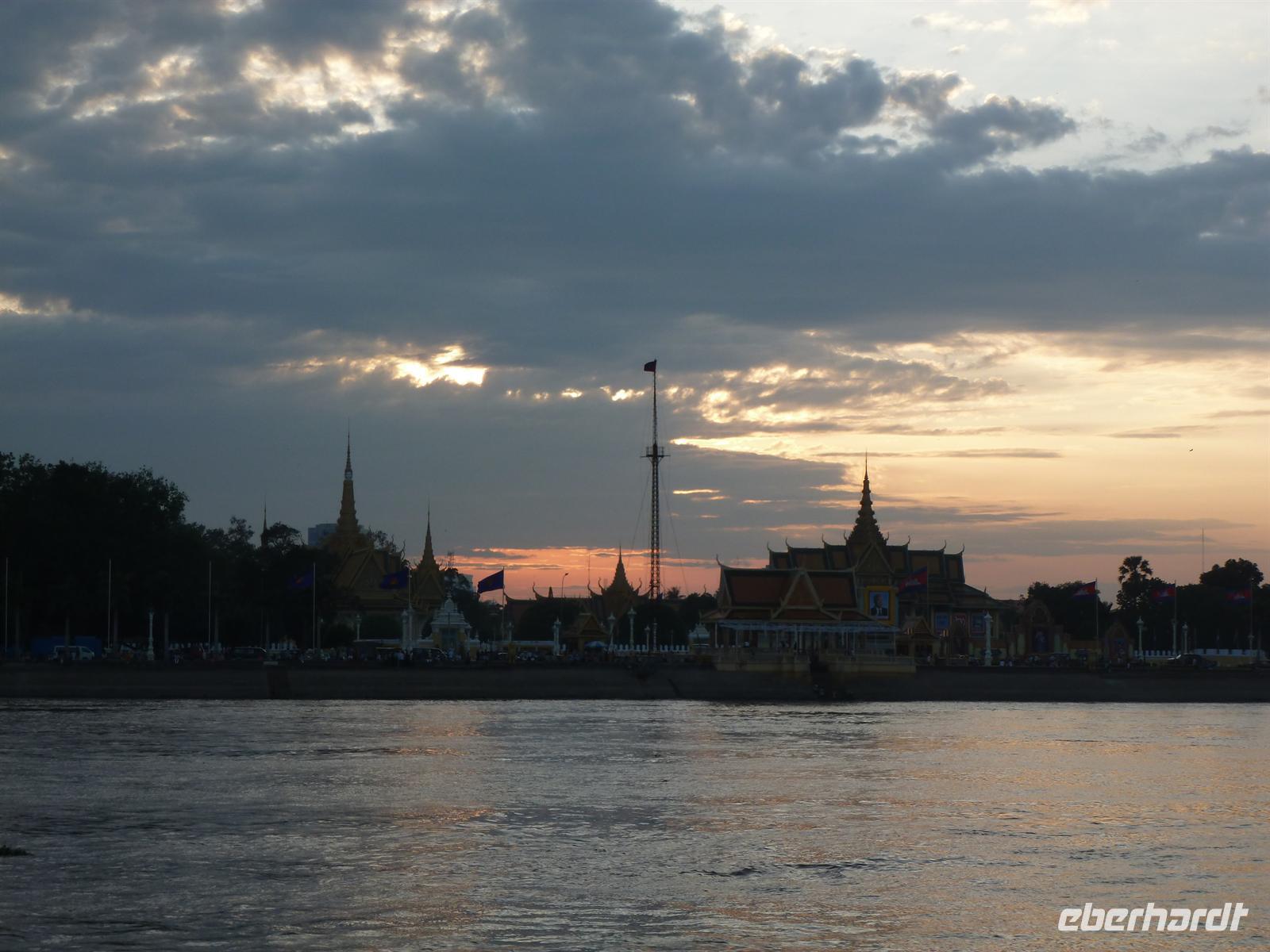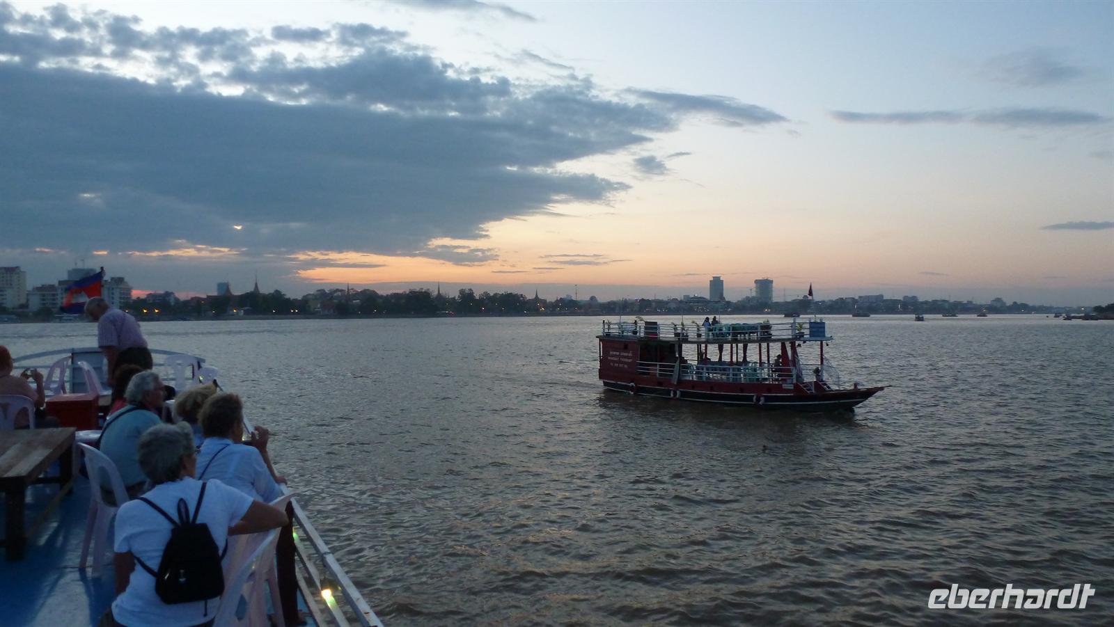 eröffnet wurde und über 5000 Ausstellungsstücke aus der Angkor/ Khmer-Zeit beherbergt, gibt uns einen guten Überblick über die religiösen und kulturellen Einflüsse der einzelnen Epochen. Weiter geht unsere Tour durch das moderne Phnom Penh, vorbei an im Bau befindlichen Hochhäusern, Schulen, Universitäten, Ministerien und breiten Boulevards. Uns erstaunt, dass wir eine relativ gepflegte Innenstadt mit breiten, guten Straßen und jede Menge großer Autos zu Gesicht bekommen, ist doch Kambodscha im Vergleich mit Vietnam ein weitaus ärmeres Land. Doch innerhalb der Grenzen der Hauptstadt ist davon gar nichts zu spüren. Sicherlich ist Phnom Penh lange nicht so prosperierend wie Shanghai, Saigon oder Bangkok, dafür ist es hier ein ganz klein wenig sauberer, ein bisschen weniger lärmend und fast „unchaotisch“. Aber es ist und bleibt natürlich eine südostasiatische Großstadt, mit allen Problemen, die man in einer solchen Stadt sucht und am Ende auch findet. Unsere letzte Besichtigung für diesen Vormittag gilt dem Wat Phnom Penh, einer Pagode inmitten einer Parkanlage, welche im Jahre 1372 durch Frau Penh, der Namensgeberin der Stadt, zu Ehren vierer von ihr gefundener Buddha-Statuen an dieser Stelle gegründet wurde. Nach der Besichtigung der Pagode und der Stupa fuhren wir nach einem kleinen Mittagessen zu unserem Hotel zurück, da es mittlerweile so heiß war, dass allen nach einer Abkühlung im Pool oder einfach nur nach Schatten zumute war. Am frühen Abend trafen wir uns alle wieder und gemeinsam machten wir uns zu einer weiteren Bootstour auf den Weg, dieses Mal zu einer Lichterfahrt auf dem Tonle-Sap-Fluss im Licht der letzten Strahlen der untergehenden Sonne. Wir waren die einzigen Gäste an Bord und genossen bei kalten Getränken und angenehmen Temperaturen um die 25 Grad den rotgetönten Himmel über dem Königspalast und die sich stetig ändernden Farben der kambodschanischen Hauptstadt. Nach einer Stunde Fahrt entlang der Uferpromenaden hatte sich Dunkelheit über die Stadt gelegt und das farbige Lichtspiel der Nacht begann in allen Schattierungen. Wir gingen augenseitig satt und zufrieden an Land und begaben uns zu einem Lokal in Hafennähe, um auch bauchseitig die innere Harmonie herzustellen. Begleitet von Live-Musik bekamen wir ein vorzügliches Abendessen kredenzte, welches geschmacklich bisher ganz oben auf der kulinarischen Richter-Skala anzusiedeln war.