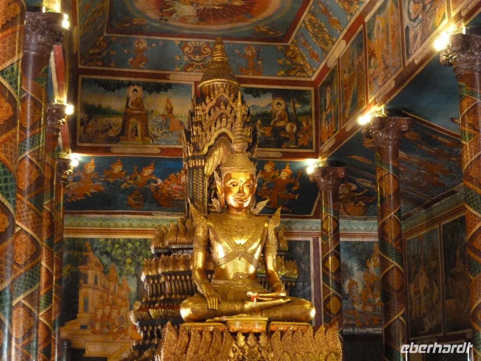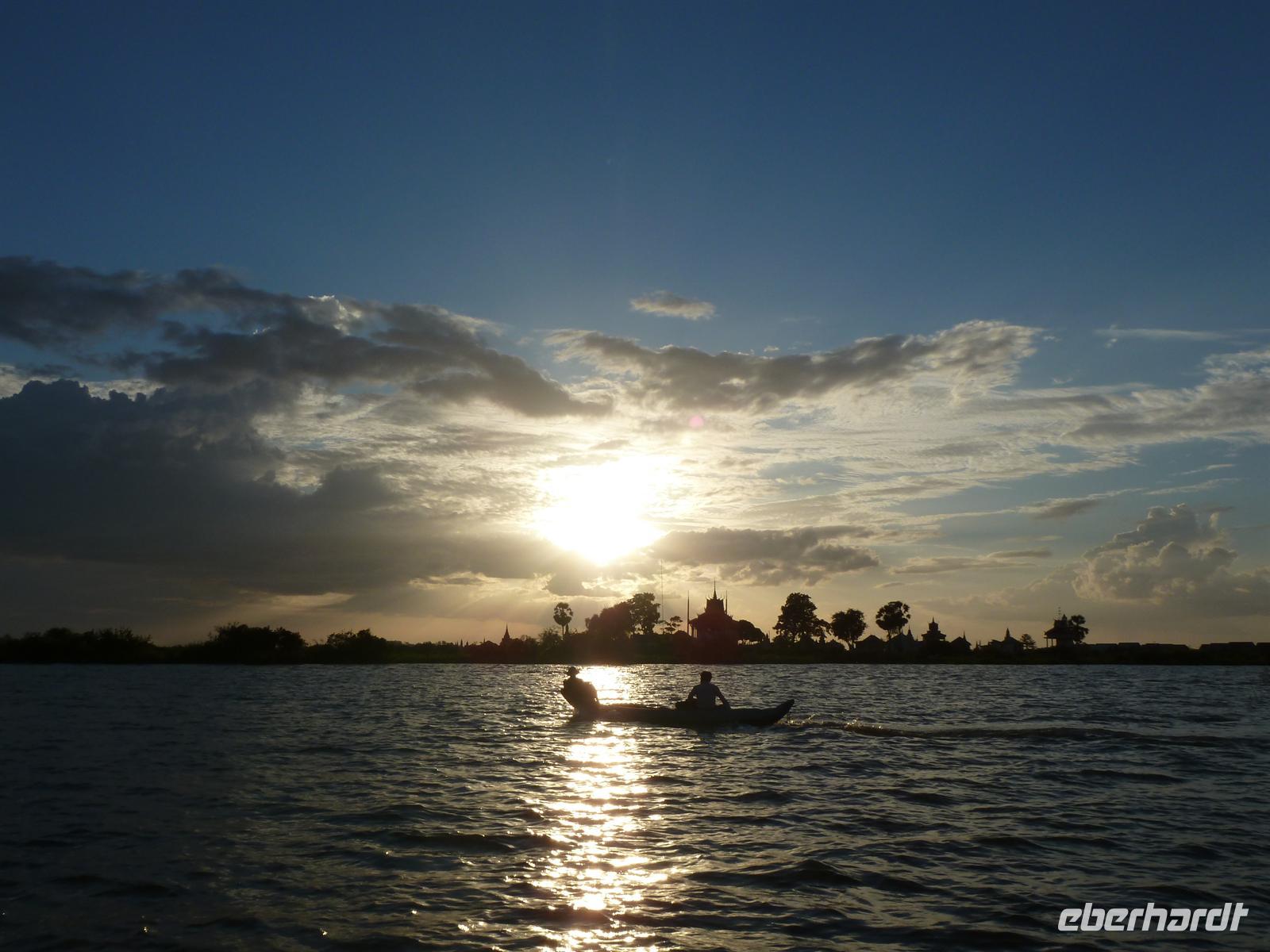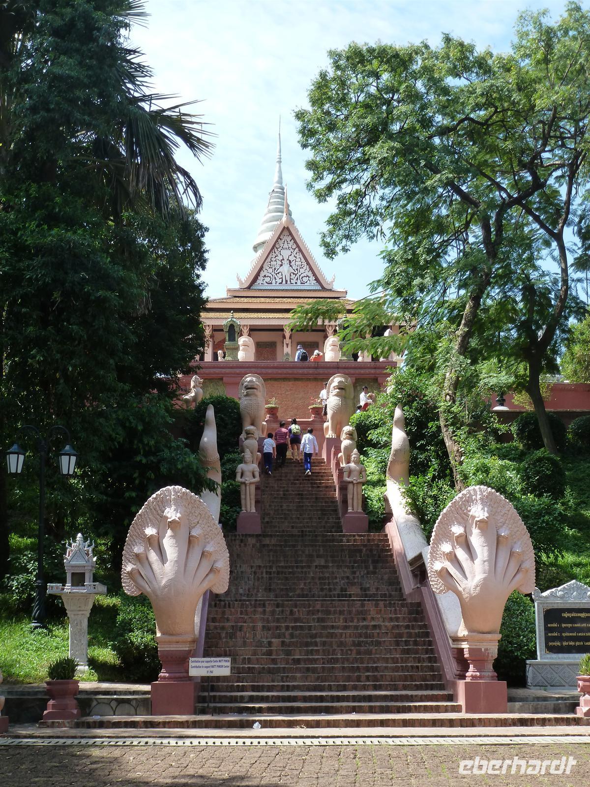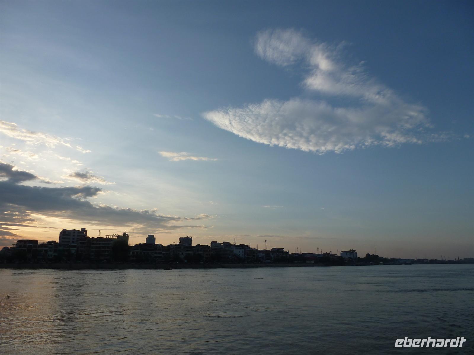 eröffnet wurde und über 5000 Ausstellungsstücke aus der Angkor/ Khmer-Zeit beherbergt, gibt uns einen guten Überblick über die religiösen und kulturellen Einflüsse der einzelnen Epochen. Weiter geht unsere Tour durch das moderne Phnom Penh, vorbei an im Bau befindlichen Hochhäusern, Schulen, Universitäten, Ministerien und breiten Boulevards. Uns erstaunt, dass wir eine relativ gepflegte Innenstadt mit breiten, guten Straßen und jede Menge großer Autos zu Gesicht bekommen, ist doch Kambodscha im Vergleich mit Vietnam ein weitaus ärmeres Land. Doch innerhalb der Grenzen der Hauptstadt ist davon gar nichts zu spüren. Sicherlich ist Phnom Penh lange nicht so prosperierend wie Shanghai, Saigon oder Bangkok, dafür ist es hier ein ganz klein wenig sauberer, ein bisschen weniger lärmend und fast „unchaotisch“. Aber es ist und bleibt natürlich eine südostasiatische Großstadt, mit allen Problemen, die man in einer solchen Stadt sucht und am Ende auch findet. Unsere letzte Besichtigung für diesen Vormittag gilt dem Wat Phnom Penh, einer Pagode inmitten einer Parkanlage, welche im Jahre 1372 durch Frau Penh, der Namensgeberin der Stadt, zu Ehren vierer von ihr gefundener Buddha-Statuen an dieser Stelle gegründet wurde. Nach der Besichtigung der Pagode und der Stupa fuhren wir nach einem kleinen Mittagessen zu unserem Hotel zurück, da es mittlerweile so heiß war, dass allen nach einer Abkühlung im Pool oder einfach nur nach Schatten zumute war. Am frühen Abend trafen wir uns alle wieder und gemeinsam machten wir uns zu einer weiteren Bootstour auf den Weg, dieses Mal zu einer Lichterfahrt auf dem Tonle-Sap-Fluss im Licht der letzten Strahlen der untergehenden Sonne. Wir waren die einzigen Gäste an Bord und genossen bei kalten Getränken und angenehmen Temperaturen um die 25 Grad den rotgetönten Himmel über dem Königspalast und die sich stetig ändernden Farben der kambodschanischen Hauptstadt. Nach einer Stunde Fahrt entlang der Uferpromenaden hatte sich Dunkelheit über die Stadt gelegt und das farbige Lichtspiel der Nacht begann in allen Schattierungen. Wir gingen augenseitig satt und zufrieden an Land und begaben uns zu einem Lokal in Hafennähe, um auch bauchseitig die innere Harmonie herzustellen. Begleitet von Live-Musik bekamen wir ein vorzügliches Abendessen kredenzte, welches geschmacklich bisher ganz oben auf der kulinarischen Richter-Skala anzusiedeln war.