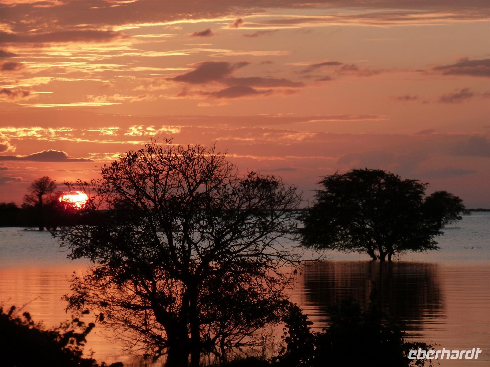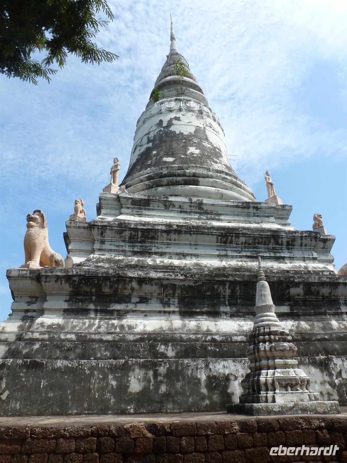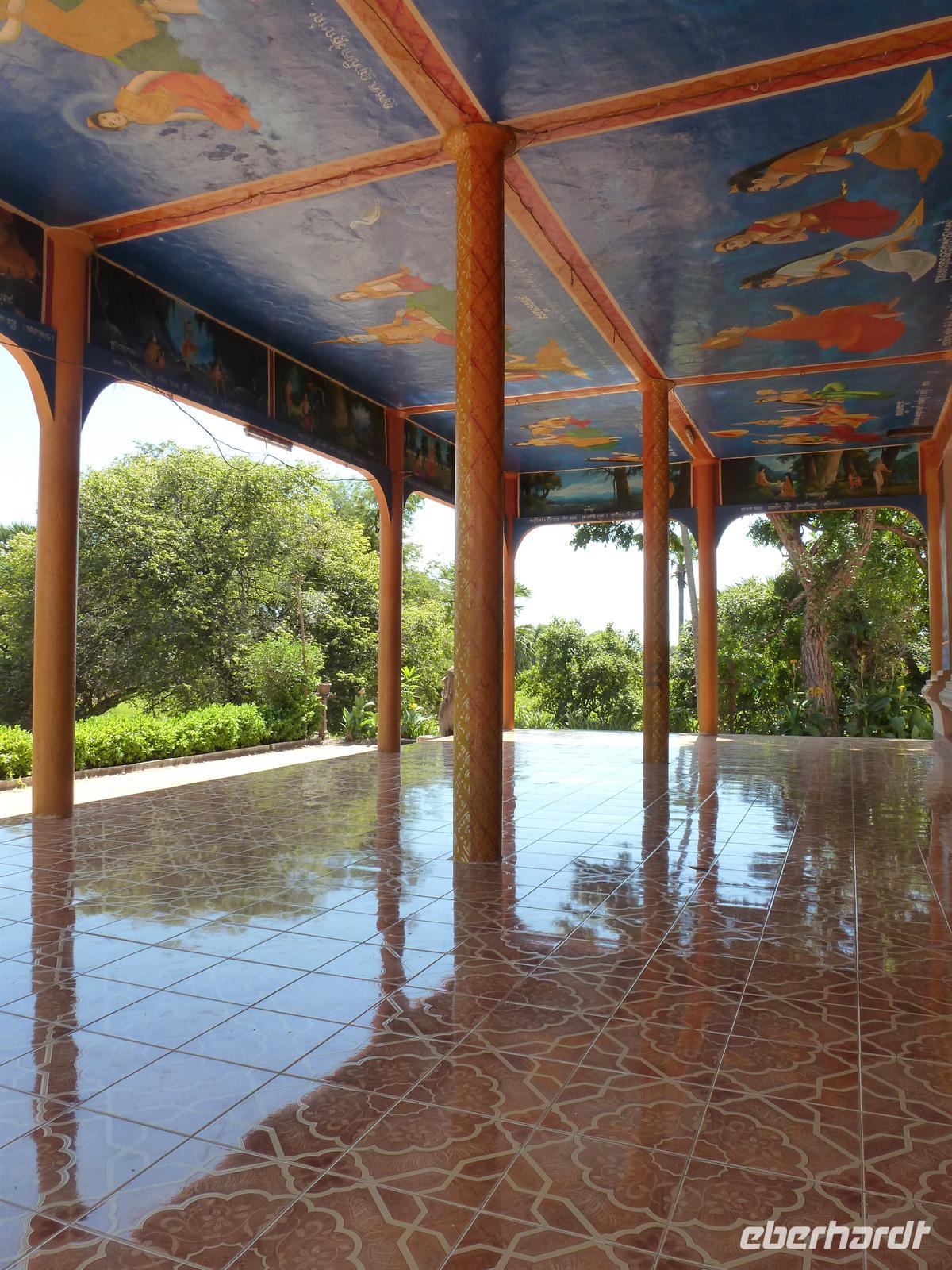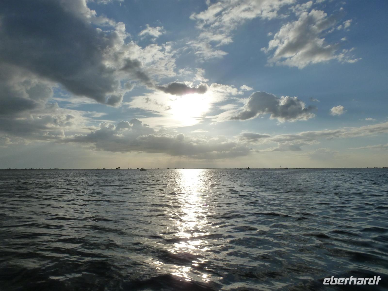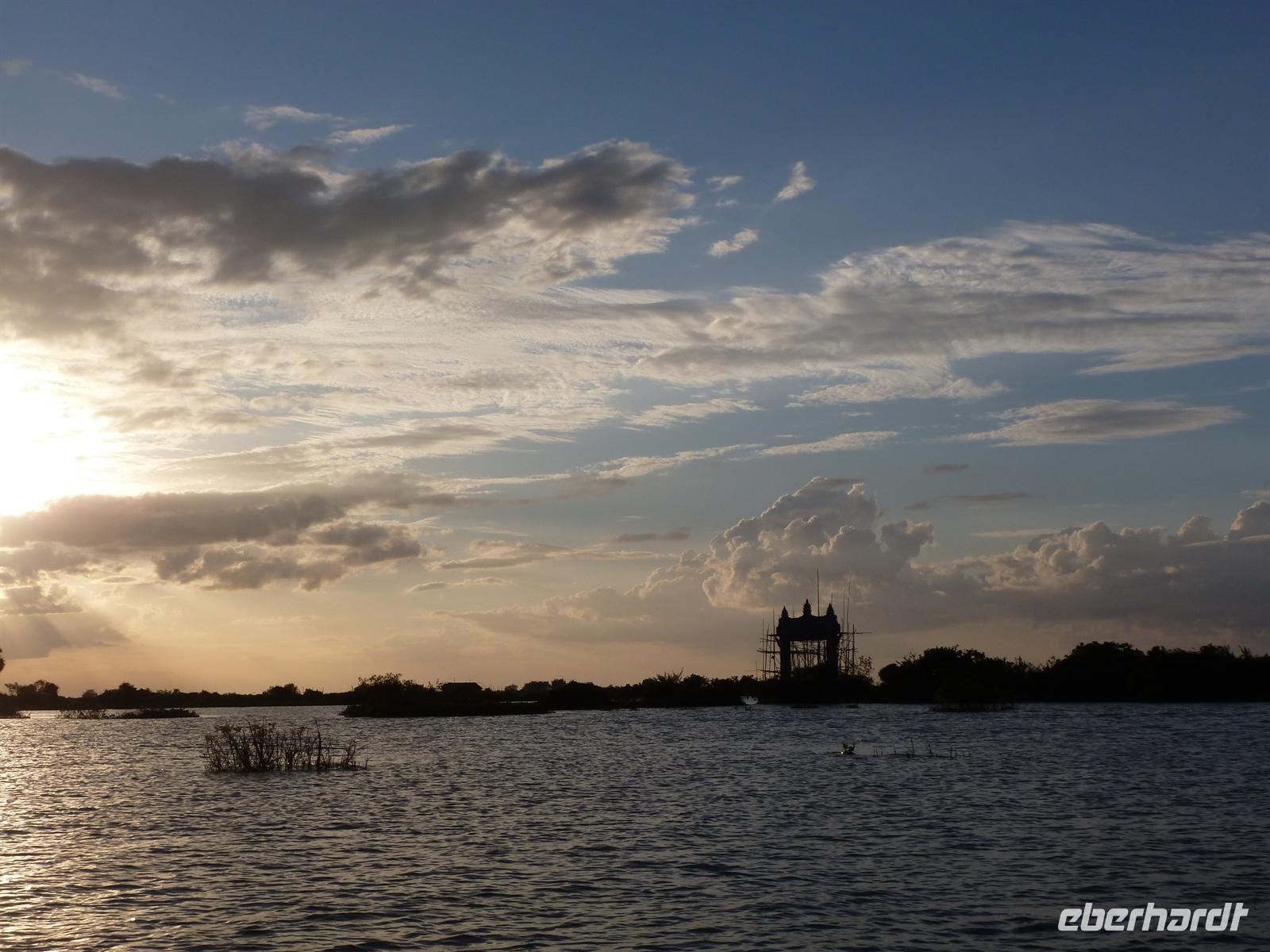 eröffnet wurde und über 5000 Ausstellungsstücke aus der Angkor/ Khmer-Zeit beherbergt, gibt uns einen guten Überblick über die religiösen und kulturellen Einflüsse der einzelnen Epochen. Weiter geht unsere Tour durch das moderne Phnom Penh, vorbei an im Bau befindlichen Hochhäusern, Schulen, Universitäten, Ministerien und breiten Boulevards. Uns erstaunt, dass wir eine relativ gepflegte Innenstadt mit breiten, guten Straßen und jede Menge großer Autos zu Gesicht bekommen, ist doch Kambodscha im Vergleich mit Vietnam ein weitaus ärmeres Land. Doch innerhalb der Grenzen der Hauptstadt ist davon gar nichts zu spüren. Sicherlich ist Phnom Penh lange nicht so prosperierend wie Shanghai, Saigon oder Bangkok, dafür ist es hier ein ganz klein wenig sauberer, ein bisschen weniger lärmend und fast „unchaotisch“. Aber es ist und bleibt natürlich eine südostasiatische Großstadt, mit allen Problemen, die man in einer solchen Stadt sucht und am Ende auch findet. Unsere letzte Besichtigung für diesen Vormittag gilt dem Wat Phnom Penh, einer Pagode inmitten einer Parkanlage, welche im Jahre 1372 durch Frau Penh, der Namensgeberin der Stadt, zu Ehren vierer von ihr gefundener Buddha-Statuen an dieser Stelle gegründet wurde. Nach der Besichtigung der Pagode und der Stupa fuhren wir nach einem kleinen Mittagessen zu unserem Hotel zurück, da es mittlerweile so heiß war, dass allen nach einer Abkühlung im Pool oder einfach nur nach Schatten zumute war. Am frühen Abend trafen wir uns alle wieder und gemeinsam machten wir uns zu einer weiteren Bootstour auf den Weg, dieses Mal zu einer Lichterfahrt auf dem Tonle-Sap-Fluss im Licht der letzten Strahlen der untergehenden Sonne. Wir waren die einzigen Gäste an Bord und genossen bei kalten Getränken und angenehmen Temperaturen um die 25 Grad den rotgetönten Himmel über dem Königspalast und die sich stetig ändernden Farben der kambodschanischen Hauptstadt. Nach einer Stunde Fahrt entlang der Uferpromenaden hatte sich Dunkelheit über die Stadt gelegt und das farbige Lichtspiel der Nacht begann in allen Schattierungen. Wir gingen augenseitig satt und zufrieden an Land und begaben uns zu einem Lokal in Hafennähe, um auch bauchseitig die innere Harmonie herzustellen. Begleitet von Live-Musik bekamen wir ein vorzügliches Abendessen kredenzte, welches geschmacklich bisher ganz oben auf der kulinarischen Richter-Skala anzusiedeln war.