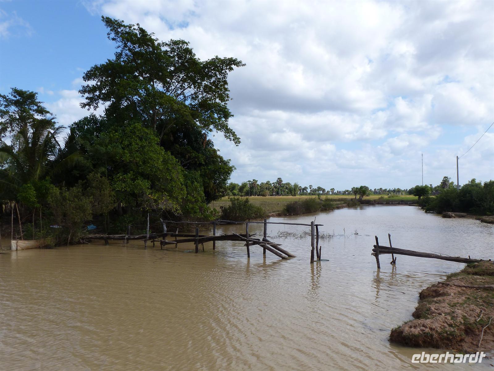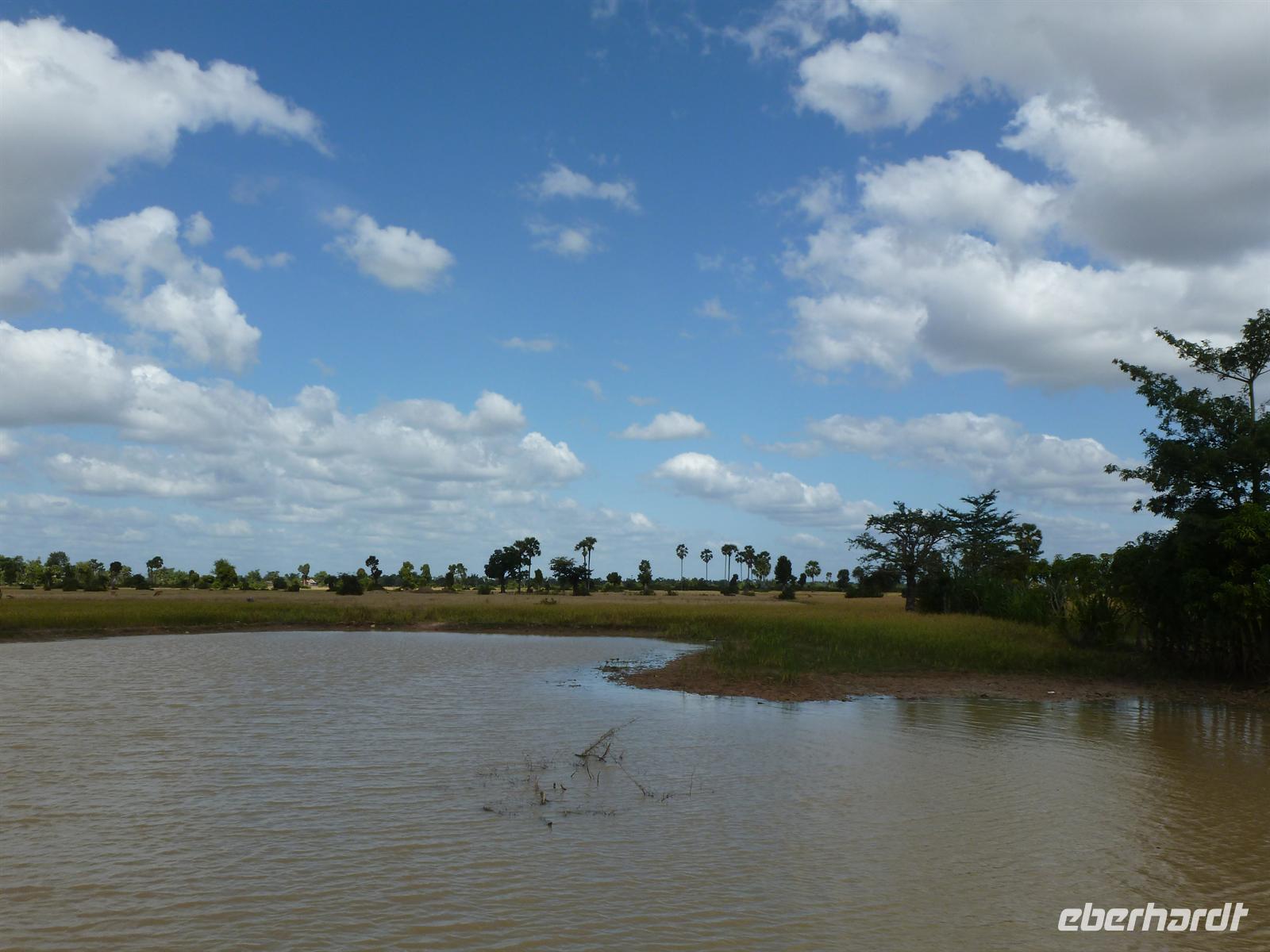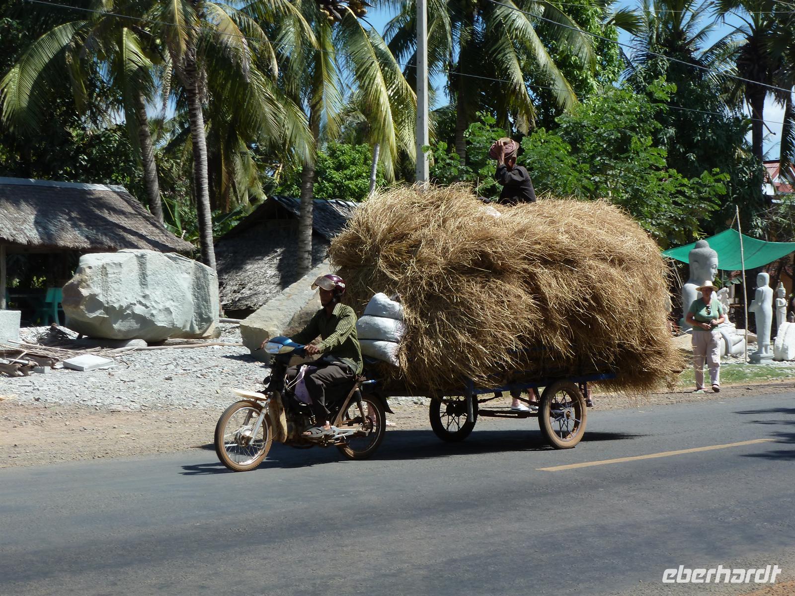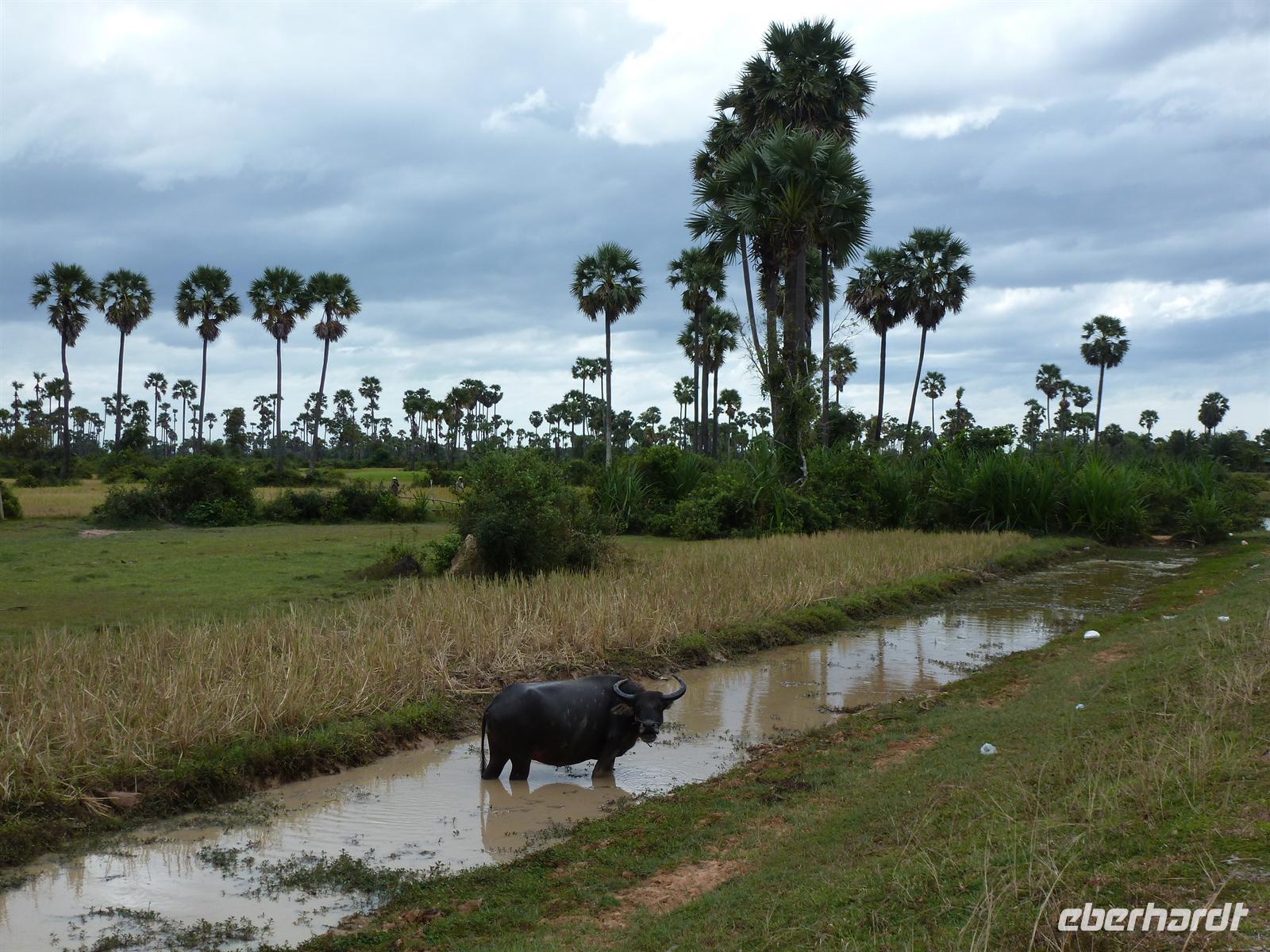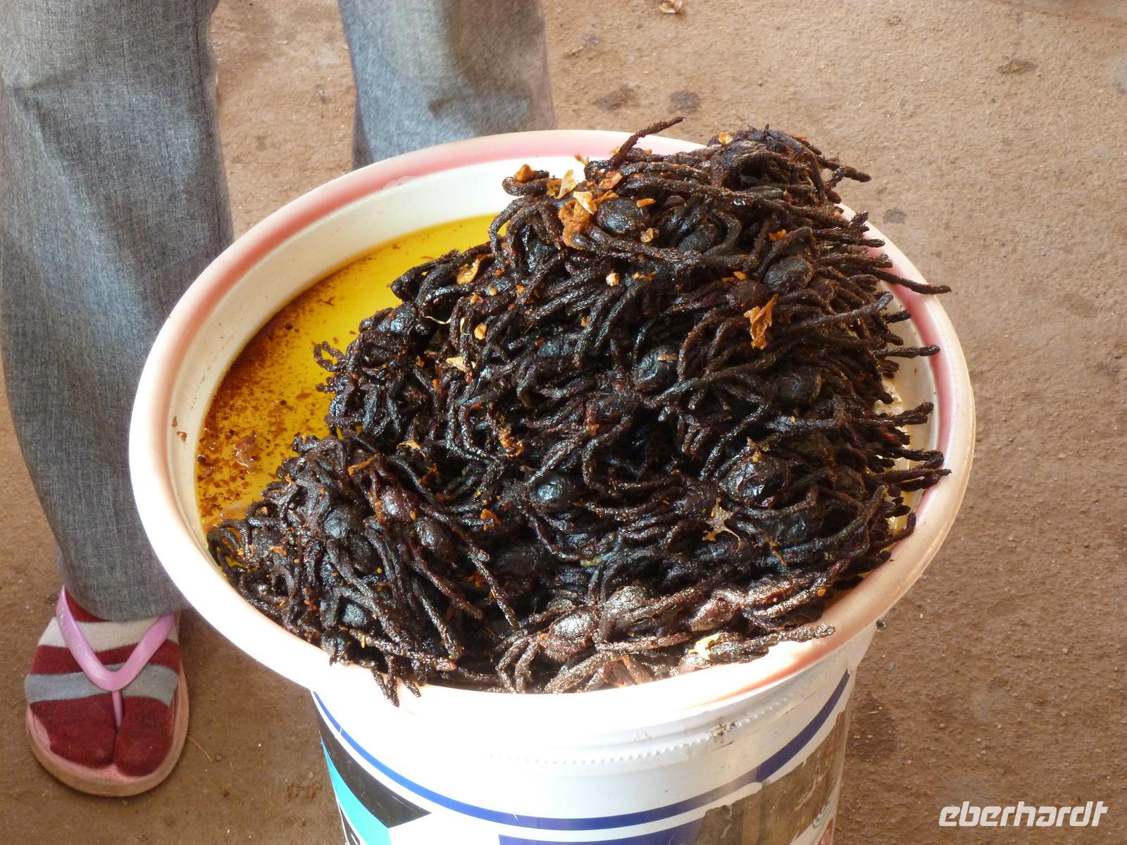 Heute wartete eine weitere Prüfung auf uns, die 320 Kilometer lange Strecke zwischen Phnom Penh und Siem Reap. Was zu Hause vergleichsweise als Katzensprung durchgehen könnte, ist in Kambodscha trotz einer bestehenden Schnellstraßenverbindung eine etwas langwierigere Sache, da die Oberflächenbeschaffenheit einen zügigen Fahrstil nur selten unterstützt. Erschwerend kamen noch die Schäden aus den Überschwemmungen des Mekong und Tonle Sap der letzten Wochen hinzu, so dass an manchen Stellen nur noch eine Schotterpiste durch überflutete Reisefelder führte. Großer Vorteil ist dafür, dass es relativ wenig Verkehrsaufkommen gibt und man nur auf Mopeds, Ochsenkarren und die Straßenränder bevölkernde Menschen und Tiere achten muss. Was generell mit einer guten, lauten Hupe zu bewerkstelligen war. Nachdem wir uns früh an einer Bäckerei mit dem Nötigsten versorgt hatten, machten wir einen ersten, kurzen Stopp an einer Raststätte mit einheimischen Spezereien. Gegrillte Spinnen, Heuschrecken,