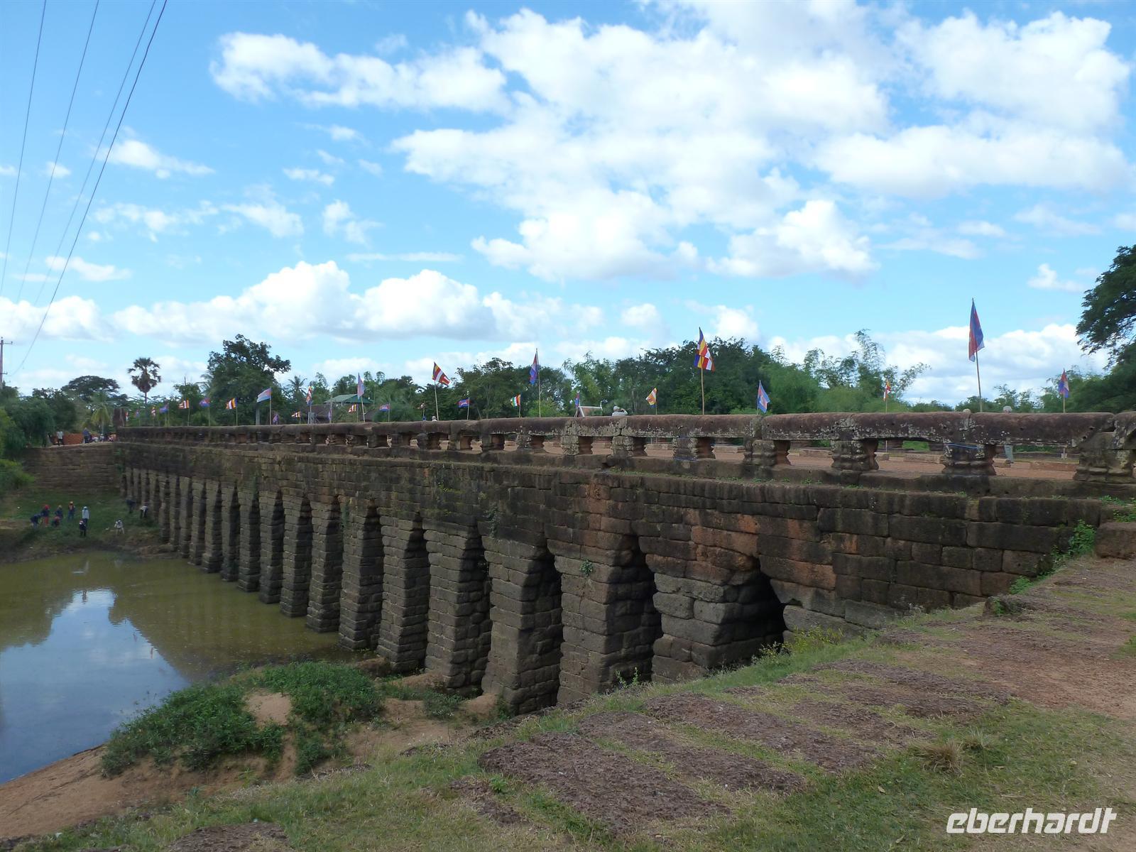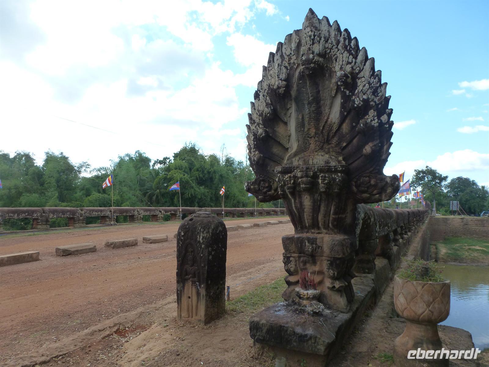 Frösche und kleine Vögel können hier neben Obst und Getränken käuflich erworben werden. Da wir ja schon Erfahrungen mit exotischem Essen gesammelt hatten, nahmen wir das Angebot unseres Reiseleiters Chan Thou zwar zögerlich, dann aber doch mit großer Neugier an und kosteten seine mitgebrachten Spinnen. Diese waren etwa Vogelspinnengroß, gegrillt, unbehaart und sahen eigentlich nicht sehr appetitlich aus, schmeckten dafür wider Erwarten aber ganz gut. Zur Sicherheit haben wir, wie in allen Fällen vorher, einen Reisschnaps zum desinfizieren und akklimatisieren nachgeschüttet. Und siehe da, unsere Körper haben die uns fremde Speise nicht abgestoßen. Weiter ging die Fahrt entlang des Tonle Sap. Wir fotografierten Wasserbüffel, Lotosfelder, Steinmetzarbeiten in einem Khmer-Dorf sowie andere Dorfbewohner beim Fang von Aalfischen bzw. bei der Reisernte. Am Nachmittag besichtigten wir die aus dem 11. Jahrhundert stammende Naga-Brücke in Kompong Kdei, bevor wir uns bei Kompong Khleang in ein Boot begaben und schöne schwimmende Dörfer auf dem Tonle Sap besuchten, Sonnenuntergang inbegriffen. Am Abend erreichen wir unser Hotel in Siem Reap, müde, geschafft, aber auch mit einigen tollen Bildern im Kopf und auf unseren Speicherkarten.