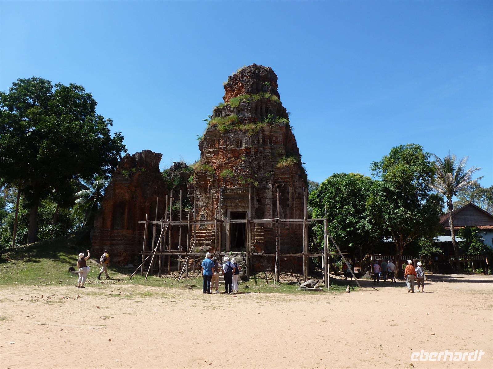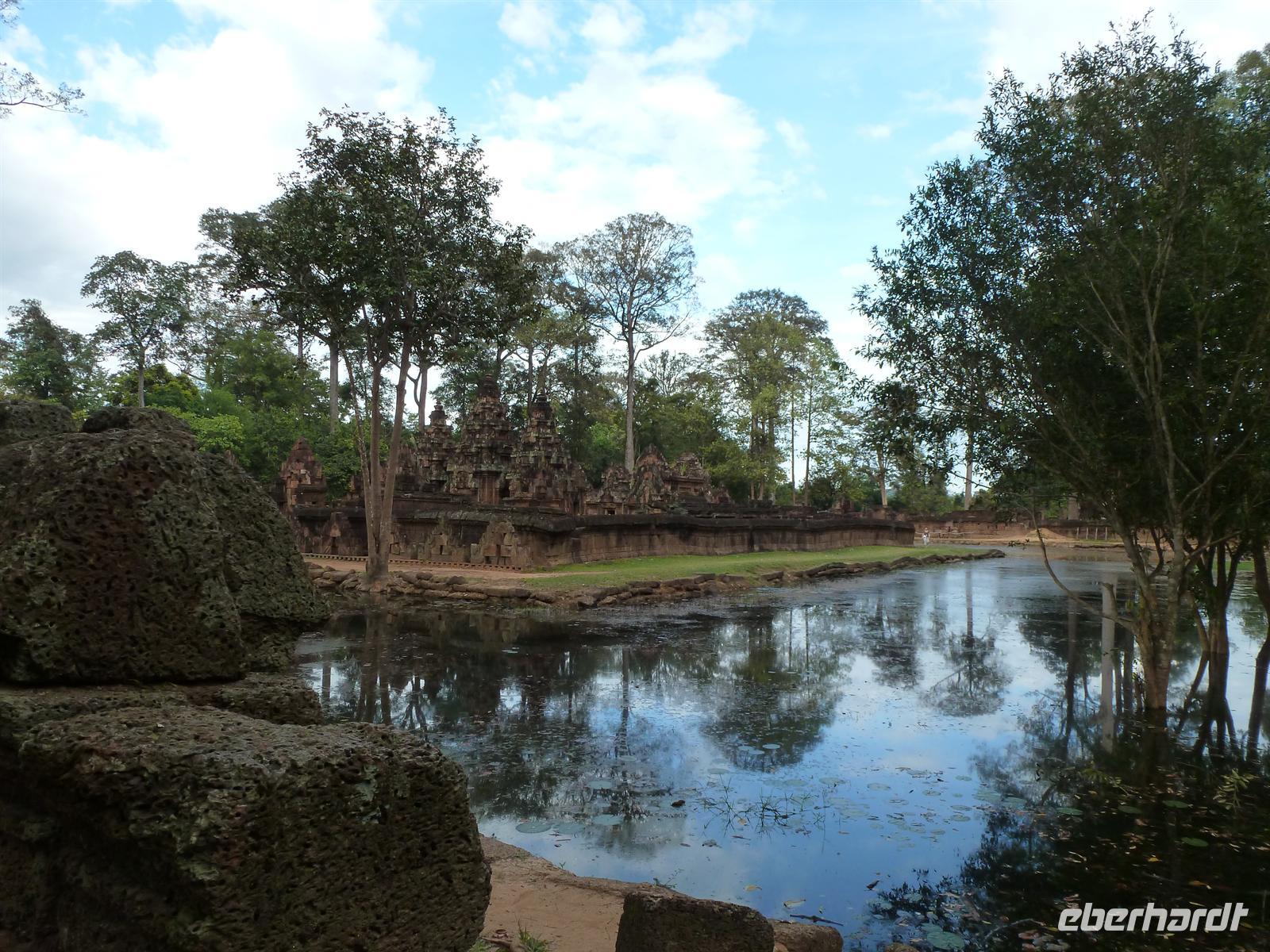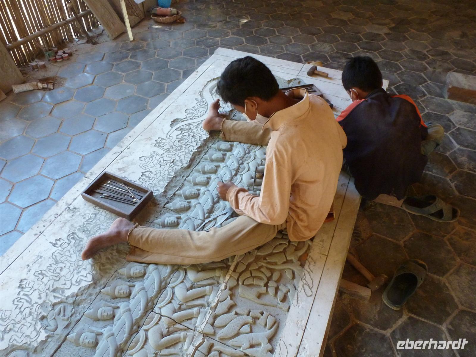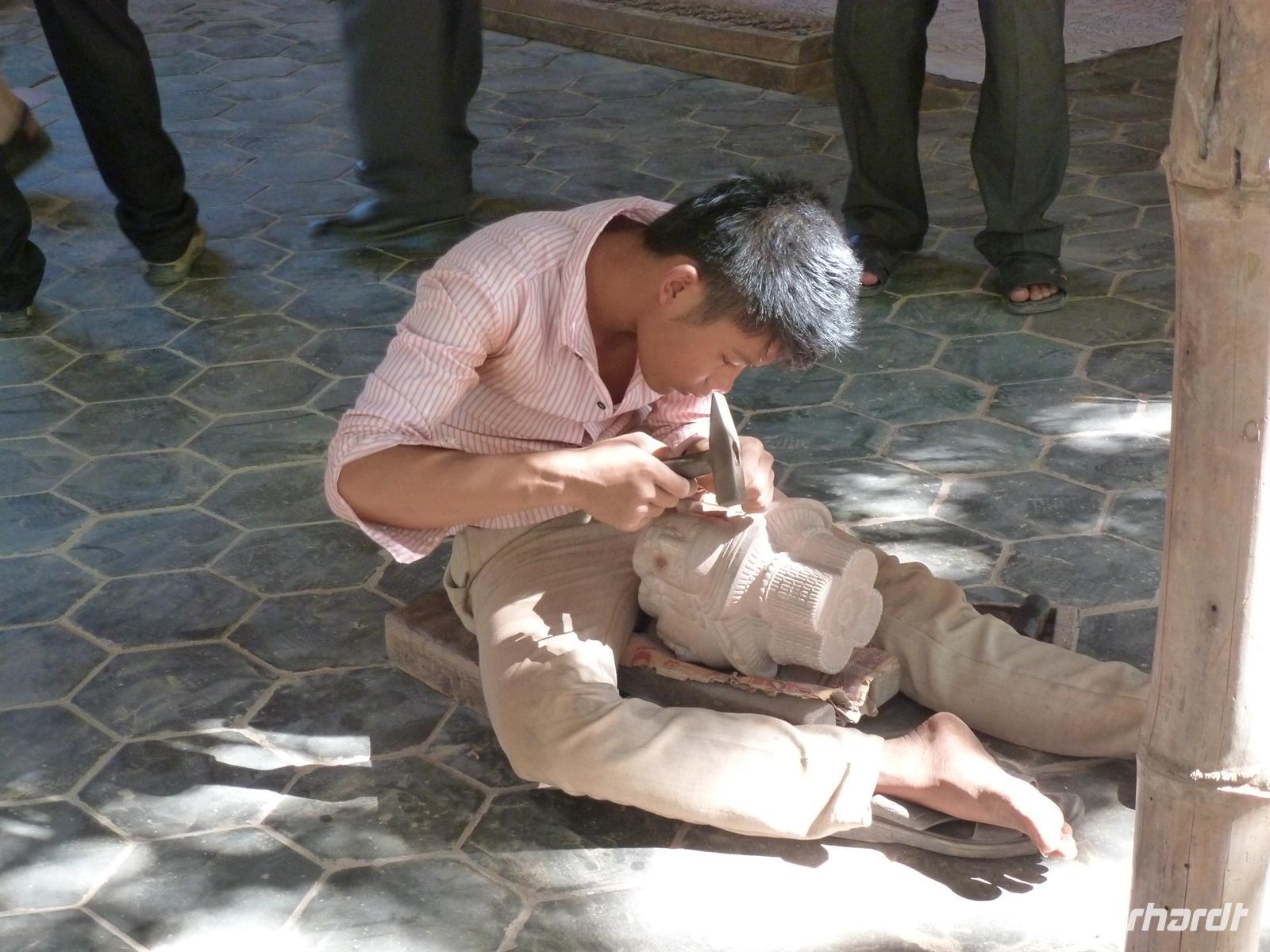 gewidmet war. Eine dem Tempel gegenüberliegende Steinmetzschule für Kinder erregte unsere Aufmerksamkeit und wir erfuhren mehr über die Hintergründe und die Dauer ihrer Ausbildung. Nächster in der Reihe der Roluos-Tempel war Bakong, im 9. Jahrhundert fertiggebauter Staatstempel, welcher den Berg Meru darstellt und außen komplett mit Sandstein verkleidet war. Dritter im Bunde und nächstes Ziel unserer Tempeltour war der 893 von Yasovarman 1. eingeweihte Lolei-Tempel, der ursprünglich inmitten einer Teichanlage stand und heute in einer Wat-Anlage integriert ist. Eine kurze Mittagspause im Schatten von Angkor Wat frischt unsere Kräfte wieder auf und hält die Mittagshitze von unseren Körpern fern. Krönender Abschluss des heutigen Tempeltages ist die Anlage von Banteay Srei, der Zitadelle der Frauen. Dieser im 10. Jahrhundert errichtete Hindu-Tempel gilt als einer der schönsten und feinst-dekorierten Tempel von Angkor. Bereits Anfang des 20. Jahrhunderts fanden hier Restaurationsarbeiten statt, was der Anlage sichtlich gut getan hat. Nach soviel alten Steinen haben wir uns noch die Herstellung von Palmzucker angesehen, bevor es ins Hotel zurück ging. Am Abend genossen wir bei einer fantastischen Apsara-Tanzvorführung ein schönes Dinner-Buffet, bevor ein weiterer Tag unserer Indochina-Rundreise zu Ende ging.
