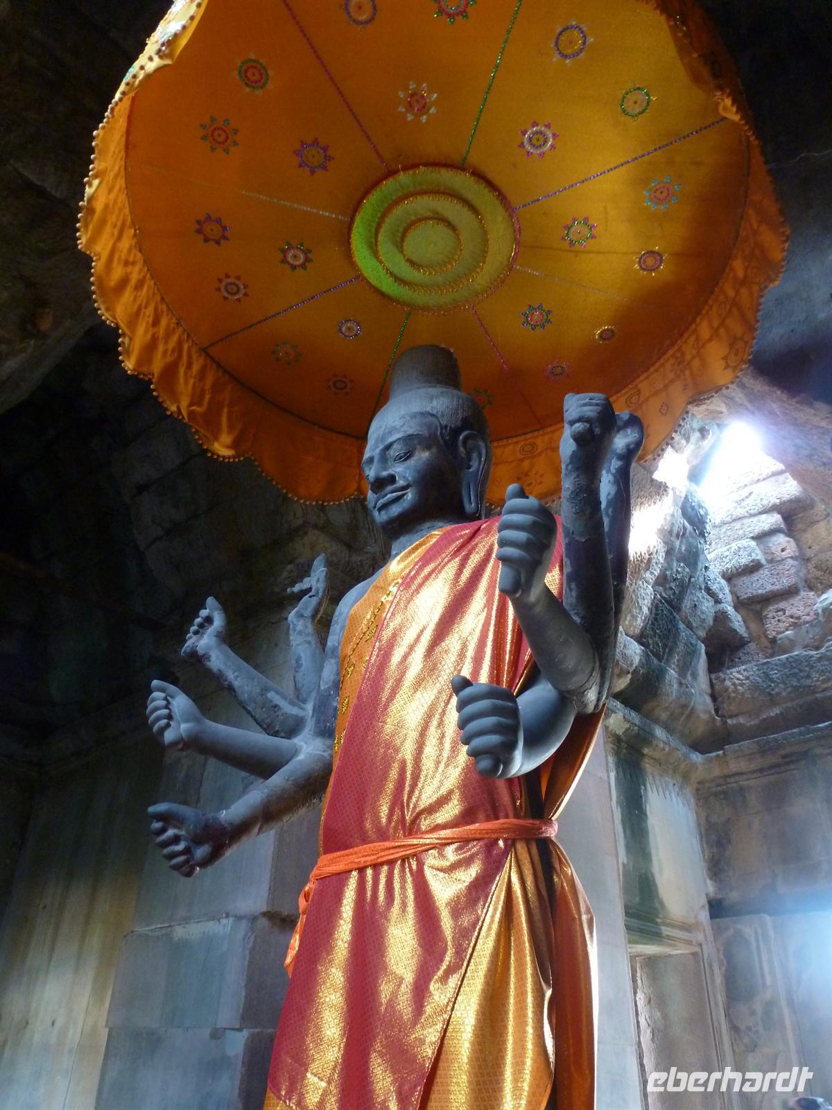 Nachdem wir uns ausgeschlafen hatten, stand heute der erste Tag unseres Angkor-Programmes auf dem Plan. Zu allererst fährt man zum Haupteingang der Anlage, um dort ein personalisiertes, weil mit dem Inhaberfoto versehenes Eintrittsticket zu bekommen. Derartig vorbereitet, hat man nun Zugang zu fast allen Tempelanlagen im Angkor-Areal. Natürlich immer mit Gesichtskontrolle. Soviel Ordnung muss sein. Bevor wir uns am morgigen Tag mit den vermeintlichen Hauptattraktionen Angkor Wat und Ta Prohm beschäftigen, statteten wir jetzt der alten Hauptstadt von Angkor, der Roluos Gruppe, einen Besuch ab. Wir hielten zuerst am Tempel Preah Ko, der 880 als erster Tempel der Roluos Gruppe fertiggestellt wurde und Shiva und Parvati