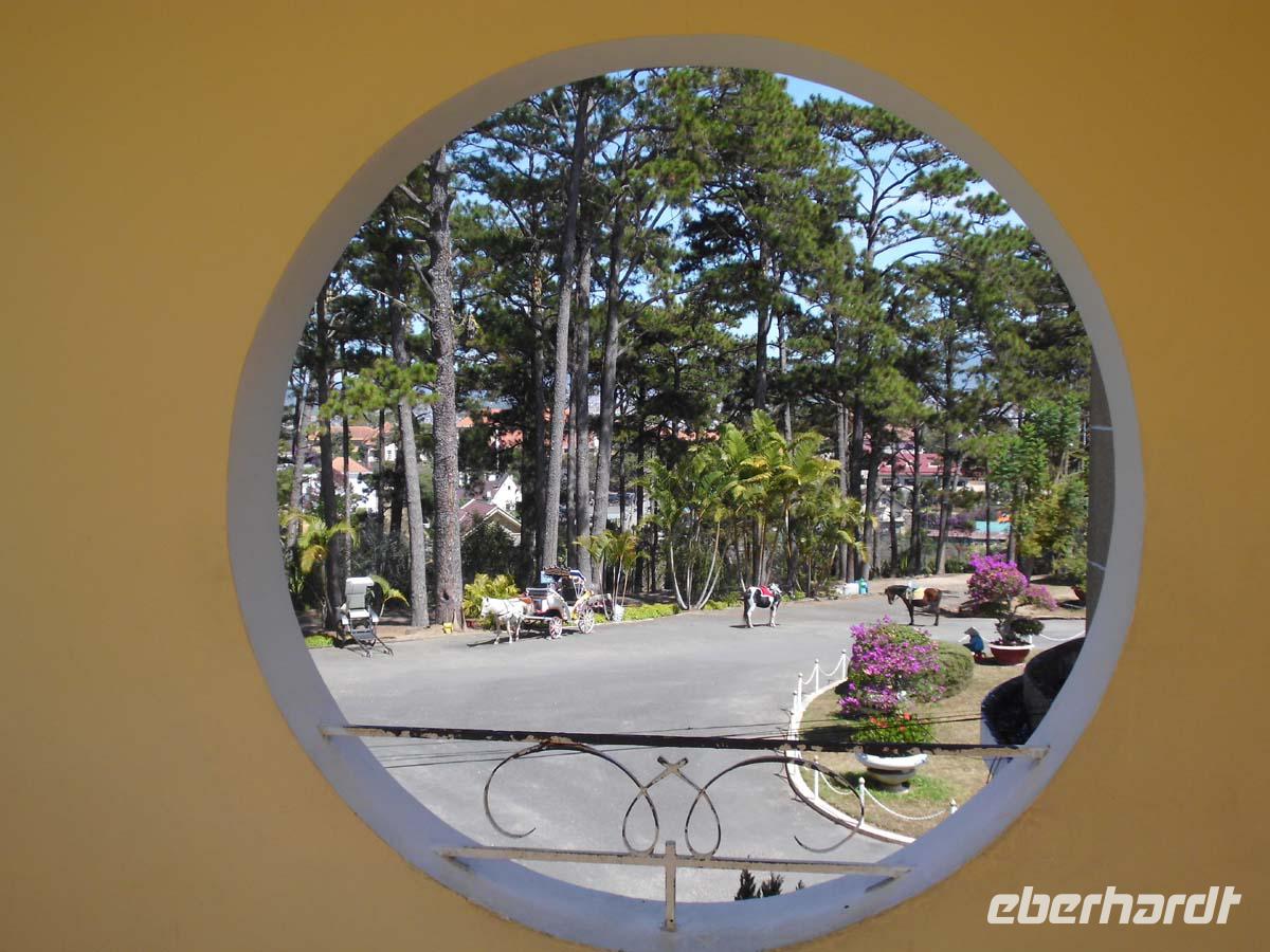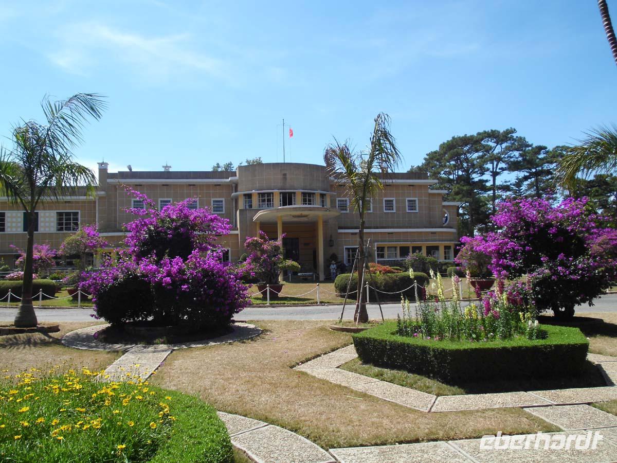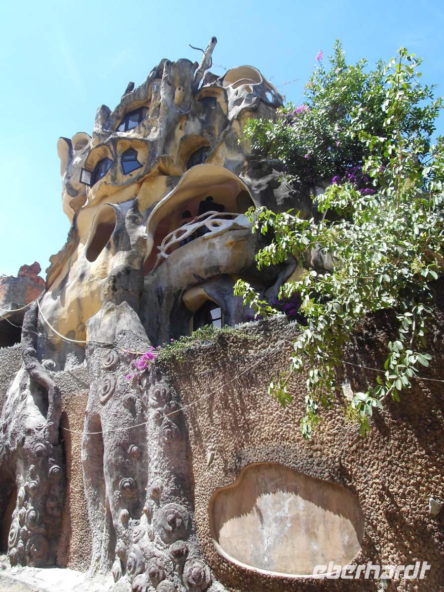 Nach dem Frühstück beginnt der Tag mit einem Besuch des ausgedehnten Blumengartens, der Gartenfreunden die Herzen höher schlagen lässt. Über der Stadt, wo noch viele Villen aus der französischen Kolonialzeit vorhanden sind, liegt auch der Sommerpalast des Präsidenten. Der Stil geht in Richtung Art Deko und erinnert stark an den Bauhausstil. Ot gibt hier frisch gepressten Zuckerrohrsaft zum probieren aus. Anschließend schlage ich noch vor, dem Crazy House einen Besuch abzustatten. Weil alle mitkommen wird das natürlich von Eberhardt-travel bezahlt. Hier hat die Architektin Hang-Nga ihrer Phantasie freien Lauf gelassen und ein skurriles Ensemble aus Brücken und Baumhäuschen geschaffen. Anklänge an Hundertwasser oder Gaudi sind nicht zu leugnen. Eine gelungene Überraschung erwartet uns beim Abendessen im Art Cafe. Der Künstler Bien, in Vietnam recht bekannt, bedient hier selbst und malt in einer eigenen Technik nur mit Handrücken und Fingern für jeden ein kleines Bild.
