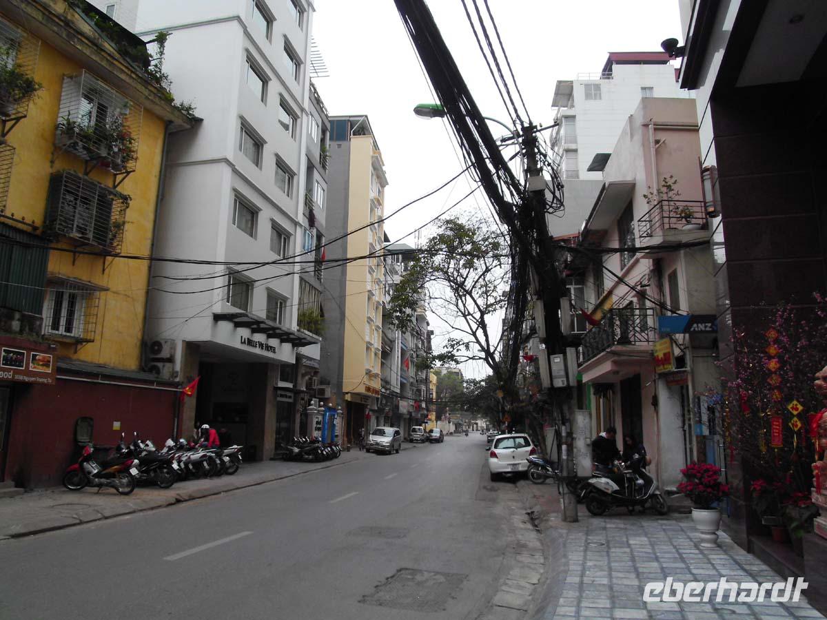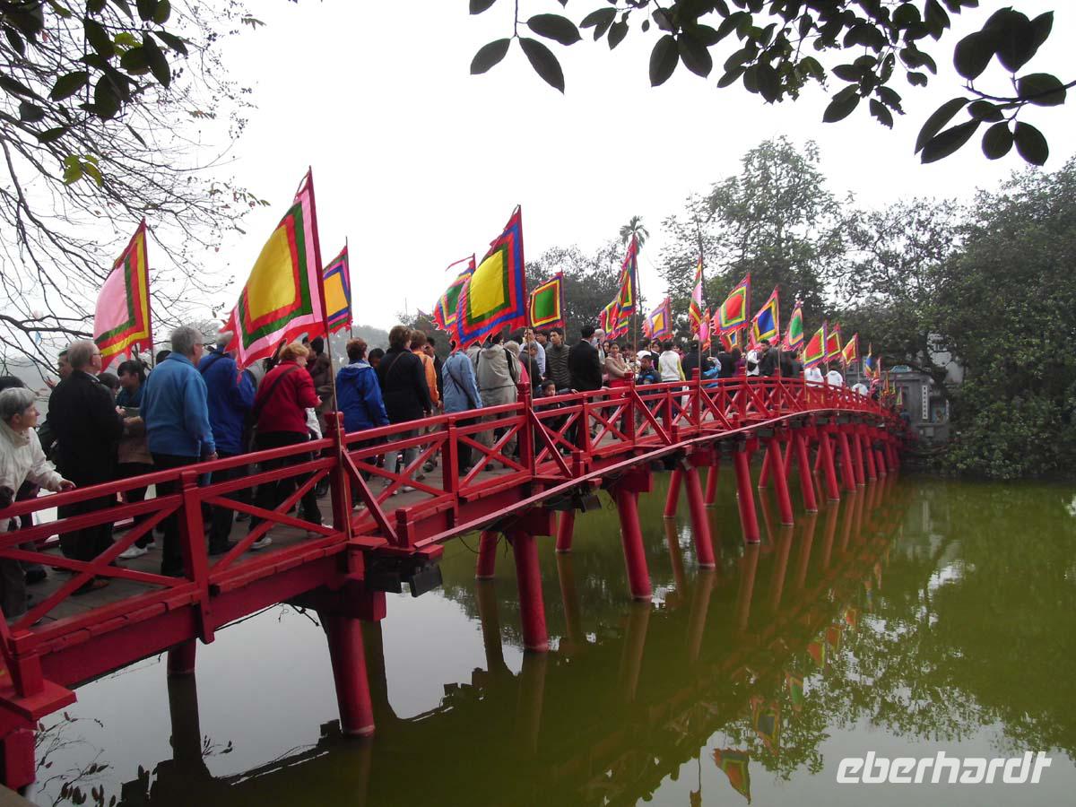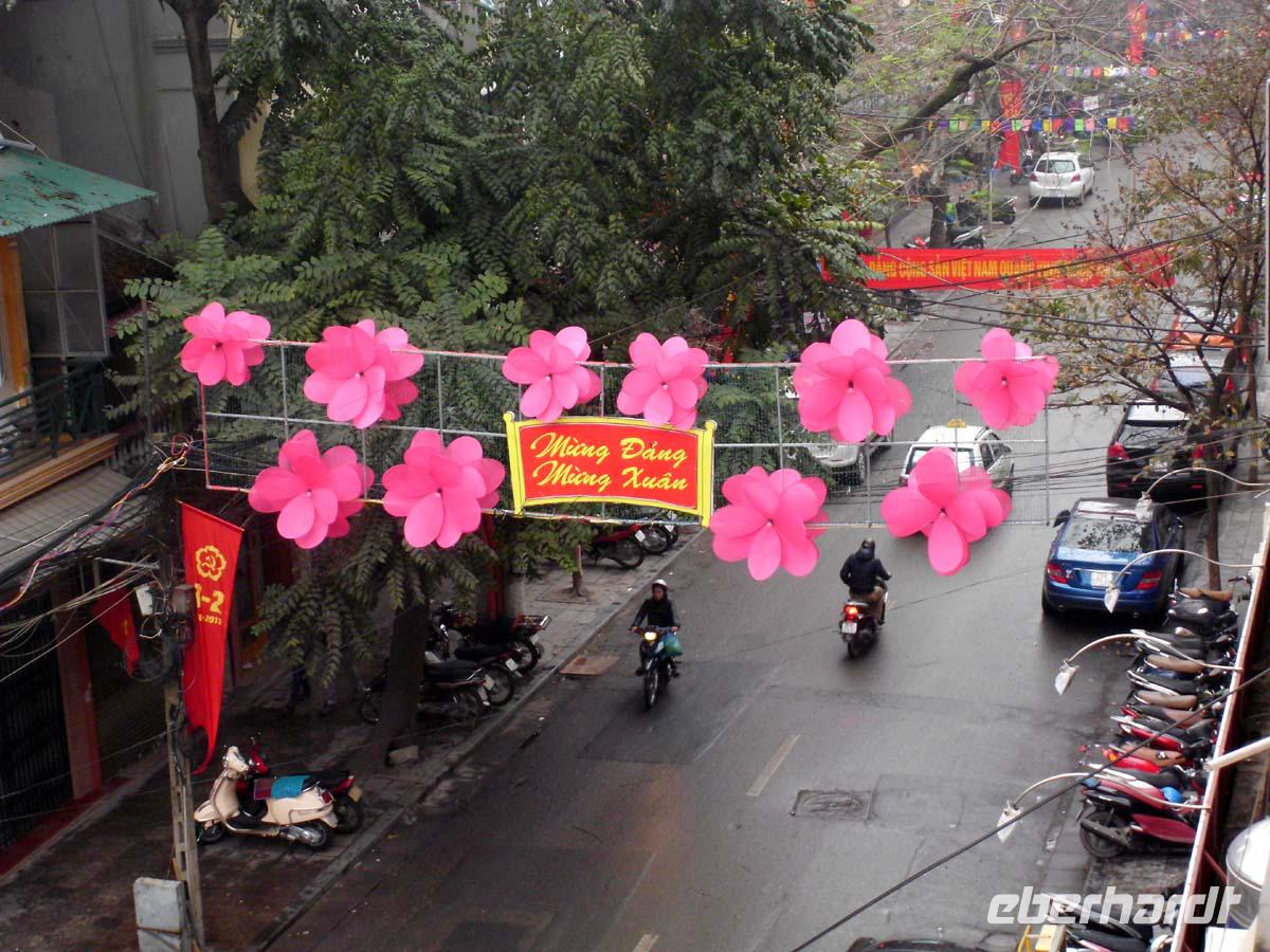 Es ist Tet-Fest, das Neujahrsfest in Vietnam, das sich nach dem Mondkalender richtet. Alle Straßen Hanois sind bunt geschmückt, doch relativ leer. Es hat alles zu und die meisten Menschen haben Urlaub. Wir erleben das bei einem ersten Rundgang in der Nähe unseres Hotels. Wir unternehmen einen kleinen Spaziergang rund um den Truc Bach See, auf dem wir auch einen Abstecher in den Quan Than Tempel aus dem 17. Jh. machen, weil dieser nicht im Programm steht. Durch den intensiven Geruch von Räucherstäbchen werden Erinnerungen an frühere Ostasienaufenthalte wieder wach. Doch so leer die Strassen sind, der Tempel platzt vor Menschen aus allen Nähten. Anscheinend will jeder heute seine Opfergaben loswerden und für Glück im neuen Jahr bitten. Nach zwei Stunden kehren wir mit ersten Eindrücken von z. T. recht unvertrauten Lebenswelten ins Hotel zurück, wo wir beim Abendessen im 7. Stock mit Blick auf die Stadt den ersten Tag in Vietnam beschließen.