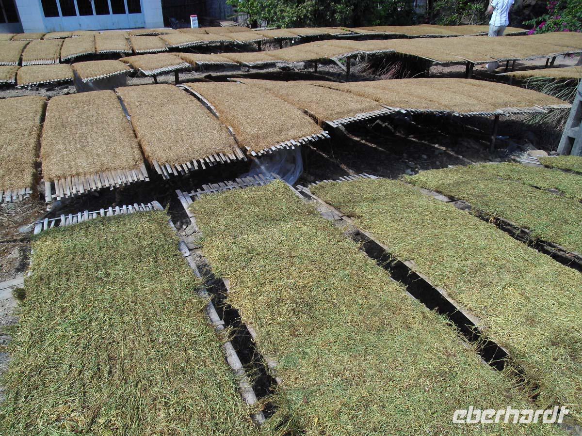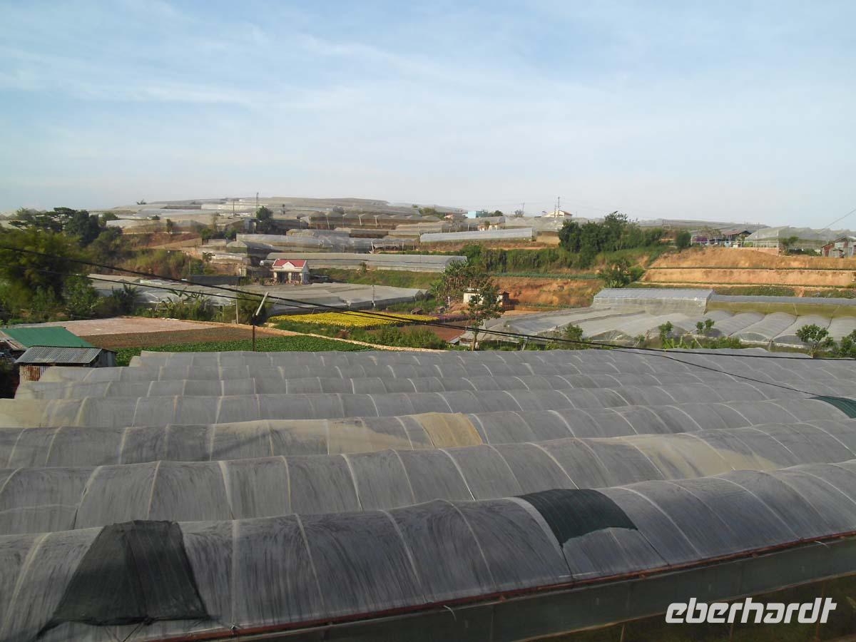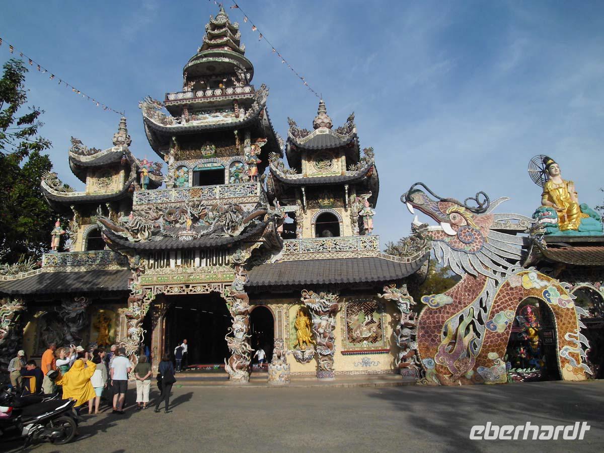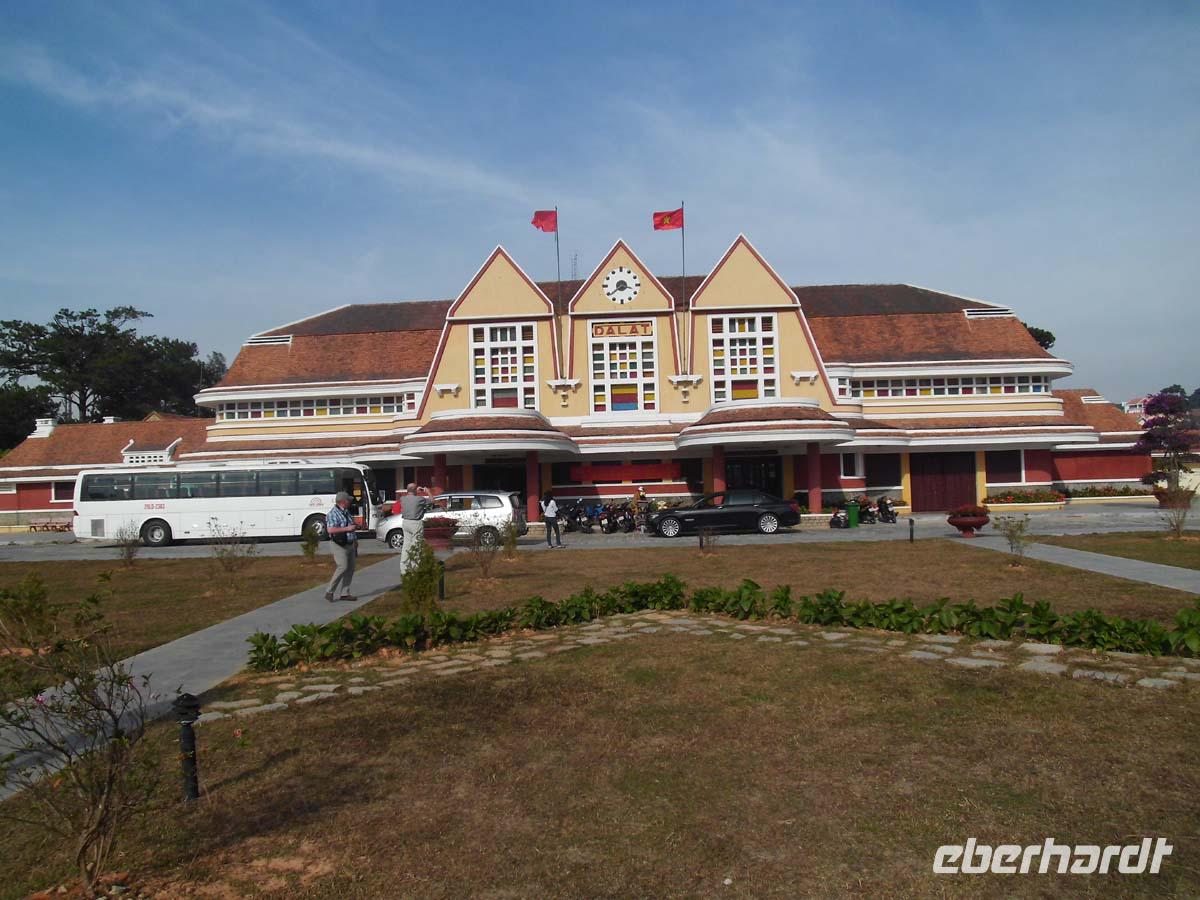 Die Reise führt uns heute ins zentrale Hochland, wo das Volk der Lat zu Hause ist. Bis auf 1600 m geht es hinauf. Schöne Aussichten bieten sich im Bergland allenthalben. Die Vegetation wird waldreicher und das Klima angenehmer. Kaffeebohnen, Tabak und Pfeffer liegen zum Trocknen direkt an der Strasse aus. Die Architektur ändert sich von Steinbauweise in bunt bemalte Holzhäuser. Der Kaffee in den Pausen ist stark, schwarz und harmoniert gut mit einer an Vanillepudding erinnernden, sehr süßen Kondensmilch. Die Nähe der „Stadt des ewigen Frühlings" kündigt sich schon Kilometer weit vorher durch endlose Gewächshäuser an. Da Lat ist ein Zentrum für Blumen- und Gemüseanbau. Uns führt der Weg zunächst zum alten Bahnhof, von wo aus wir eine Bahnfahrt in historischen Waggons bis zur Station Trai Mat unternehmen. Von hier aus sind es nur ein paar Schritte zu Fuß zur Linh Phuoc Pagode. Die stammt zwar erst aus den 60er Jahren, beeindruckt jedoch durch ihre schier überbordende Ornamentik. Und es wird immer noch weiter an ihr gebaut. Nach ein wenig Freizeit werden beim Abendessen Bananen so eindrucksvoll am Tisch flambiert, das der Feueralarm losgeht. Bis man nach 10 min den Aus-Knopf gefunden hat, ließ sich keine Feuerwahr blicken. Den Verdauungsspaziergang zum Tagesabschluss unternehmen wir über den Nachtmarkt mit seinen vielfältigen Gerüchen und Angeboten.