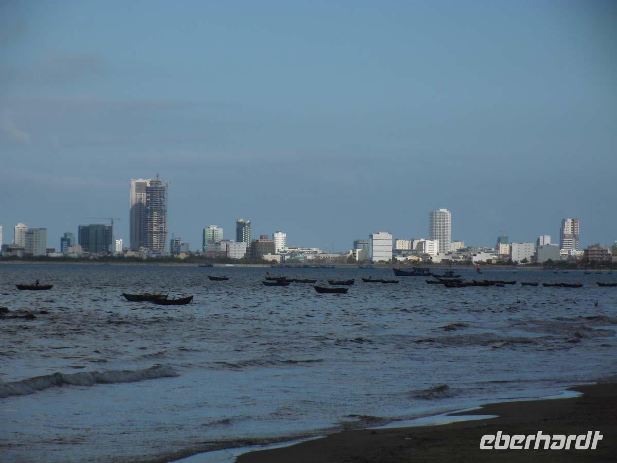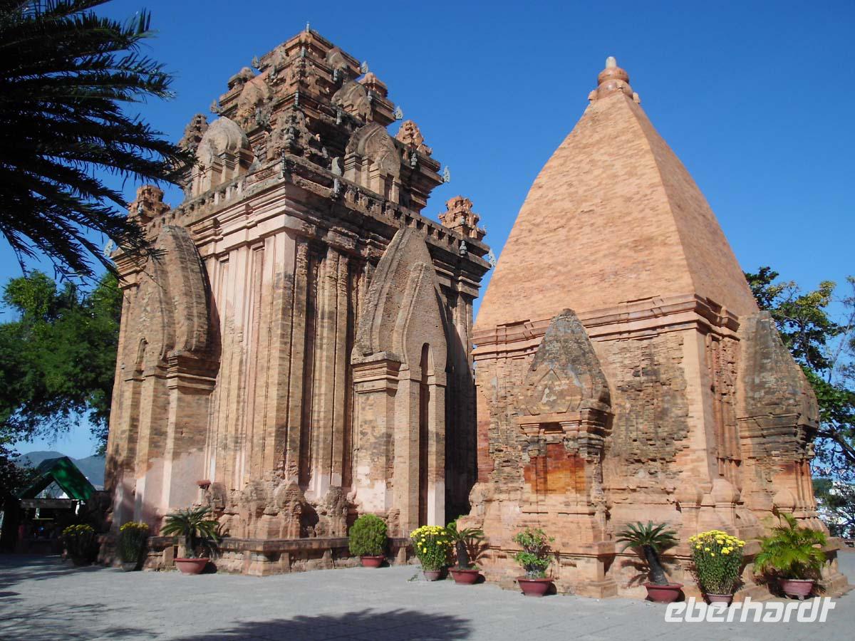 Heute fliegen wir in den Süden, von Da Nang nach Nha Trang. Dort liegt unser Hotel nur eine Querstrasse vom Strand, und 10 Gehminuten vom Zentralmarkt entfernt. Doch zunächst besichtigen wir die Türme von Po Nagar. Wir befinden uns im Gebiet des Volksstammes der Cham, und Po Nagar ist deren Muttergöttin. Im Hinduistischen Tempel blickt uns in allen Türmen der Gott Shiva an, zu dessen Gattin Po Nagar während der Kulthandlungen wird. Interessant ist auch die Vorführung von Brettchenweberei auf dem Gelände. Über der alten Long-Son-Pagode thront ein riesiger weißer Buddha. Viele stufen führen zu dem 1963 errichteten, buddhistischen Denkmal, von dem man einen gute Aussicht auf die Stadt und die Küste hat. Nach dem Mittag, wo es auch Gelegenheit zum Frosch- und Aalprobieren gibt, nutzen viele die Freizeit am restlichen Tag zu einem Bad im südchinesischen Meer.
