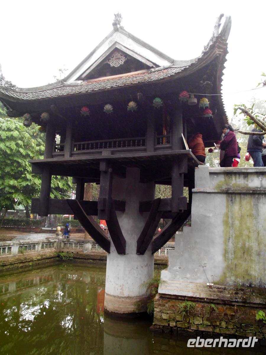 Heute lernen wir die alte und neue Hauptstadt (seit 1010 n. Chr.) Vietnams eingehender kennen. Zunächst fallen uns die schmalen Röhrenhäuser auf, die auf den schmalen Parzellen nicht selten über 60 m weit nach hinten gehen, und oft an den Seiten keine Fenster haben, weil die Nachbargrundstücke anderen Besitzern gehören. Die mitunter nur 7 m breiten Parzellen hemmen jedoch nicht das Höhenwachstum der Bebauung, die 5-6 Stockwerke oft noch überschreitet. Es wird fröhlich aufgestockt! Unser Weg führt uns natürlich am Präsidentenpalast, dem Ho Chi Minh Mausoleum und dem Wohnhaus von Onkel Ho vorbei, der in Vietnam tatsächlich hohes Ansehen genießt und entsprechend verehrt wird - nicht nur von Parteigenossen. Unweit davon nehmen wir die Ein-Säulen-Pagode in Augenschein: Auf einer Säule stehend, und so die Lotosblüte als buddhistische Versinnbildlichung der Erleuchtung symbolisierend wurde die im 11. Jh. entstandene Pagode im 20. Jh. zerstört und auf Anweisung von Ho Chi Minh wieder errichtet.