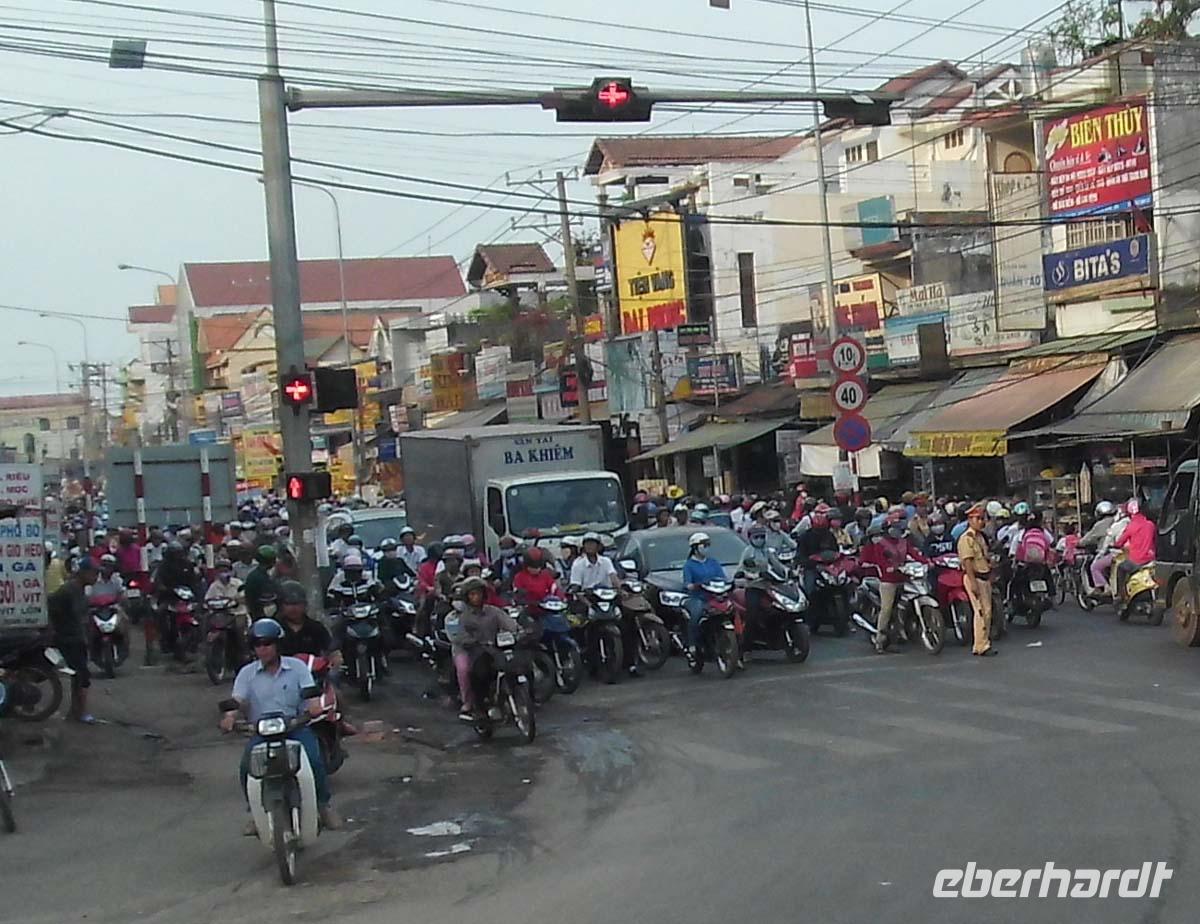Aus dem Bergland hinaus, begeben wir uns nach Ho Chi Minh Stadt, alias Saigon. Wir sind den ganzen Tag mit dem Bus unterwegs und können so die Land- und Ortschaften genau betrachten, die an uns vorüber ziehen. Ausreichend Pausen bieten sich u.a. Bei Photostops auf Teeplantagen, Kautschukbäumen, Cashewnussbäumen, beim Teakholzanbau oder an Pfefferbäumen, alles Gewächse, die wir aus unseren Gärten nicht kennen. Ot lässt uns auch von den riesigen Jackfrüchten kosten, die sehr schmackhaft sind. Ab Bien Hoa verdichtet sich der Verkehr merklich und bald geht es nur noch im Schritttempo vorwärts. In der Ferne wird schon die Silhouette des Zentrums der riesigen Stadt sichtbar und gegen Abend erreichen wir unser Hotel, und begeben uns zum Ende des Tages zum Abendessen, dass wie immer aus 5 - 6 Gängen besteht.