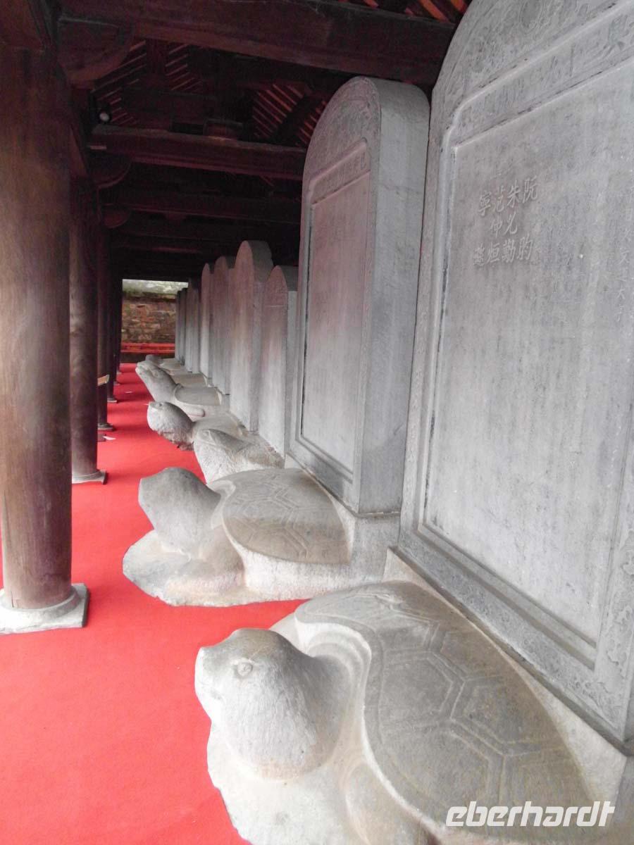 Als wir am Hoan Kiem See Mittag essen sehe ich wieder Menschenmassen. Bei meiner Pho-Suppe, dem Nationalgericht zumindest im Norden Vietnams ahne ich, was gleich auf uns zukommt am Jadebergtempel. Ich habe Bedenken, das die Brücke, „Der Ort, wo sich die Morgensonne ausruht" alle hält. Es umfängt uns ein beängstigendes Gerdränge und Geschubse. Es ist immer noch Tet-Fest, und um gut zu opfern, setzt man schon einmal die Ellenbogen ein. Auch Ot hat dem Küchen- und Hausgott Tao Quan am Morgen noch echten Honig um den Mund geschmiert, damit dieser beim Berichten vor dem göttlichen Jadekaiser nur Gutes von seiner Familie erzählt. Wir werden Zeuge einer traditionellen Tempelzeremonie eines Vereins in traditionellen Gewändern. Alle sind sich bewusst, dass man dies nur heute miterleben kann. Es ist keine Folklore; man meint es ernst, auch wenn die Touristen wie wild photographieren. Wer kanns verdenken, bekommt man so etwas doch eher selten zu Gesicht.. Auch eine Rikschafahrt wird unternommen, die uns durch die Gassen der Altstadt führt.
