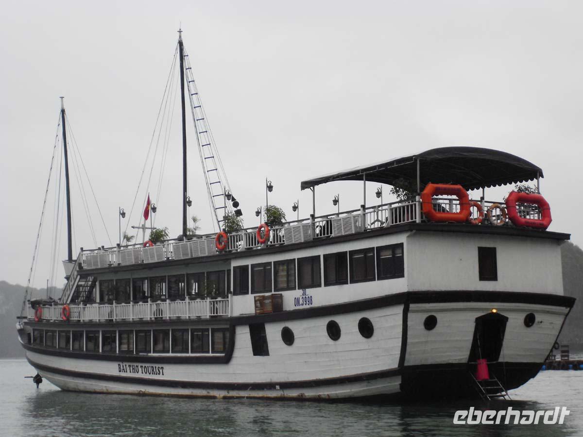 Wackelig geht es auf Shuttleboote zur Sung Sot Höhle. Eine riesige Karsthöhle, bunt illuminiert. Die dort gefundenen prähistorischen Steinwerkzeuge, die auf Stelltafeln zu bewundern sind, haben massive Ähnlichkeit mit mitteleuropäischen Artefakten. Uns umgibt uns eine farblich gut illuminierte Höhlenlandschaft, in welche die Barbarossahöhle 20 mal hinein passt. Überwältigend. Weiter schippern wir zur Titop-Insel mit Aussichtspunkt und Onkel Hos Badestrand. Zum Baden ist es jedoch noch etwas frisch. Danach schmecken uns die Nao- und Do Hai Muscheln köstlich und natürlich müssen wir noch mit dem obligatorischen Reiswein anstoßen. Das kann nur auf dem Oberdeck geschehen, damit das Restaurant nix davon mitbekommt. Wir kriegen das hin!