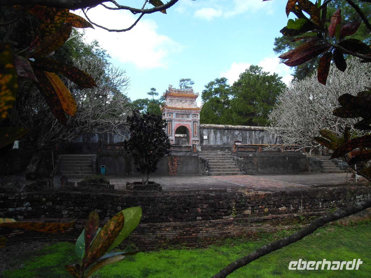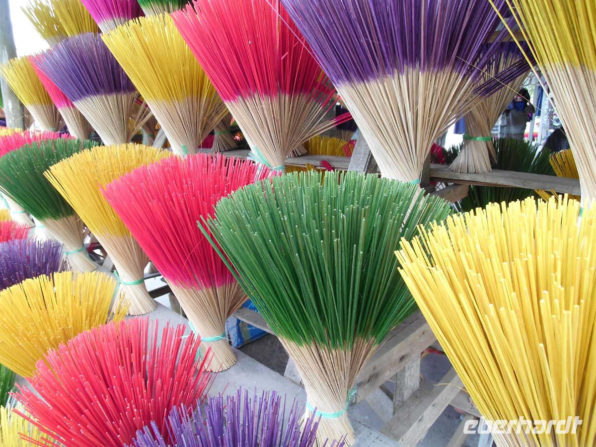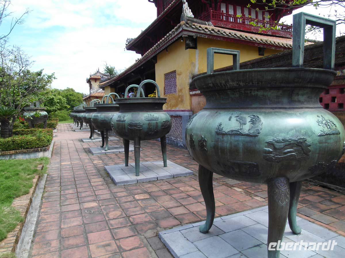 30 Grad im Schatten. Wir besuchen die riesige Begräbnisstadt des Kaisers Tu Duc und halten danach an Räucherstäbchen- und Kegelhutstand. Diese Hüte werden in Vietnam noch sehr oft getragen, schützen gut vor der Sonne und sind sehr leicht.