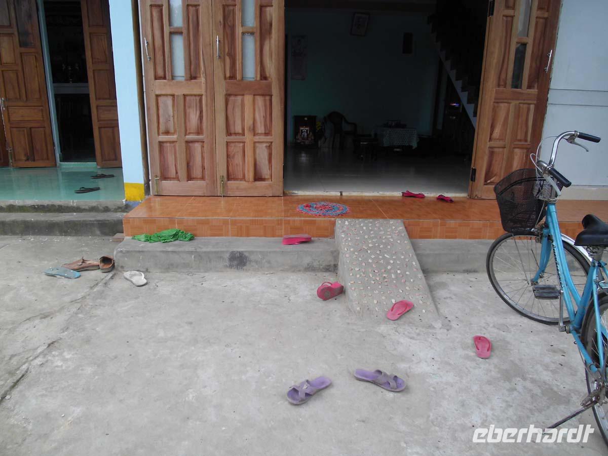 Irgendwie ist dass Wetter trüb. Für Europäer aber angenehme 24Grad. Ot findet es kalt und hat eine Jacke an. Vorbei an Reisfeldern tuckern wir nach Osten zur Halong-Bucht. Alle wollen Wasserbüffel knipsen, die aber immer zu weit weg sind. Statt dessen fällt mir auf, dass die kleinen langen Reisparzellen im Grunde die Struktur der Röhrenhäuser in Hanoi wiedergeben. Statt langgestrecktem Reisfeld, heute Röhrenhaus, denke ich. Klar, wenn sich eine Metropole in die Umgebung ausdehnt und sich die Besitzverhältnisse am Grund und Boden nicht ändern. Wir müssen uns daran gewöhnen, dass es auf vietnamesischen Strassen nicht so schnell vorwärts geht, wie in Europa. Man kann je nach Kurvenlage die 2-3-fache Zeit einrechnen, zumal es fast ausschließlich durch geschlossene Ortschaften geht. In Vietnam siedelt man an den Verkehrslinien, nicht unbedingt im Grünen.