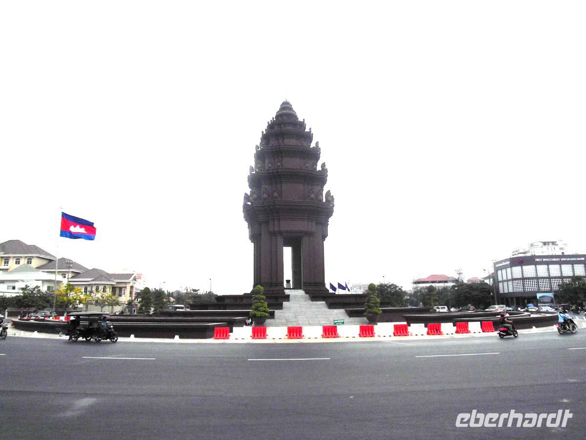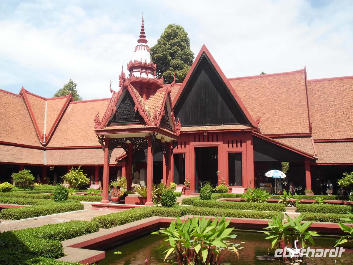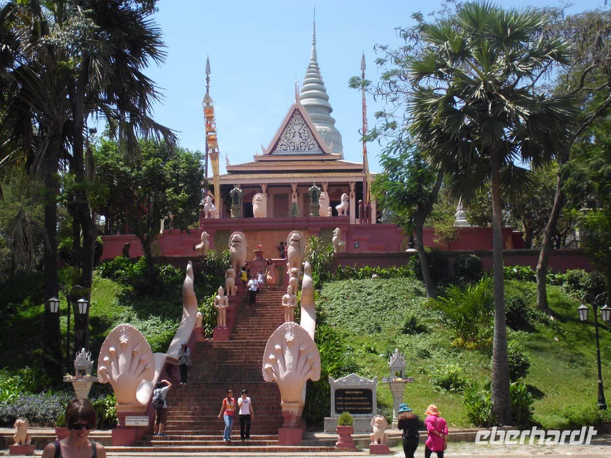 In Phnom Penh geht alles recht diszipliniert zu. Auch im Straßenverkehr. Die vielen Motorroller Vietnams sind mehr Personenwagen gewichen. Wir besuchen zunächst den Königspalast auf dessen Gelände sich auch die Silberpagode befindet. Der Fußboden ist komplett aus Silberplatten gemacht. Die Dachlandschaft der vielen Gebäude beeindruckt mit ihren vielen verzierten, goldenen Dächern. Nicht weniger wertvoll sind die Exponate im Nationalmuseum, viele davon aus dem Angkorgebiet. Auch ein Besuch des Zentralmarktes ist lohneswert. Unter dem riesigen Hallendach gibt es schwere Rubine für nur 35 Dollar. Darauf sollte man natürlich nicht herein fallen. Den Programmabschluss bildet ein Besuch des Wat Phnom Penh. Die Pagode ist eng mit der Gründungslegende der Stadt verbunden, als die Dame Penh in eniem angeschwemmten Baustamm mehrere Buddhastatuen entdeckte. Für alle, die spaß an Sonnenuntergängen haben, unternehmen wir am späten Nachmittag noch eine Bootsfahrt an der Mündung des Tonle Sap in den Mekong. Der Stadt gegenüber liegen am Ufer ärmliche Hütten, illegal errichtet. Reichtum und Armut liegen in ganz Südostasien nicht selten eng beieinander.
