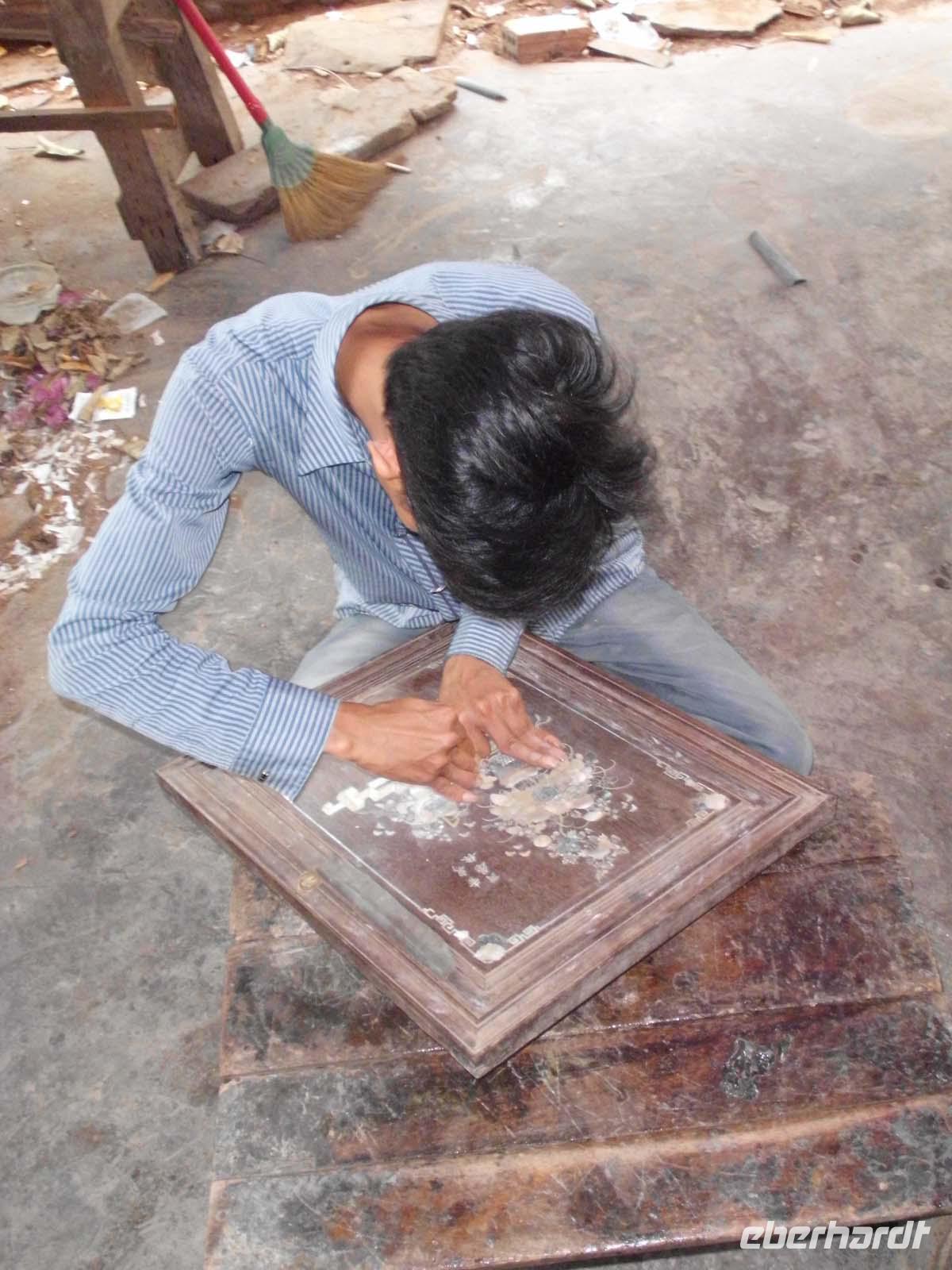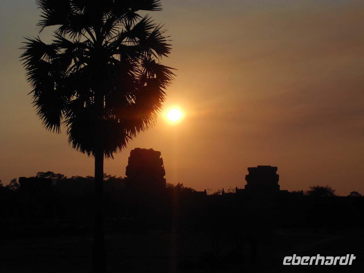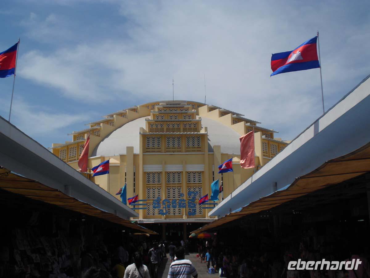 In Phnom Penh geht alles recht diszipliniert zu. Auch im Straßenverkehr. Die vielen Motorroller Vietnams sind mehr Personenwagen gewichen. Wir besuchen zunächst den Königspalast auf dessen Gelände sich auch die Silberpagode befindet. Der Fußboden ist komplett aus Silberplatten gemacht. Die Dachlandschaft der vielen Gebäude beeindruckt mit ihren vielen verzierten, goldenen Dächern. Nicht weniger wertvoll sind die Exponate im Nationalmuseum, viele davon aus dem Angkorgebiet. Auch ein Besuch des Zentralmarktes ist lohneswert. Unter dem riesigen Hallendach gibt es schwere Rubine für nur 35 Dollar. Darauf sollte man natürlich nicht herein fallen. Den Programmabschluss bildet ein Besuch des Wat Phnom Penh. Die Pagode ist eng mit der Gründungslegende der Stadt verbunden, als die Dame Penh in eniem angeschwemmten Baustamm mehrere Buddhastatuen entdeckte. Für alle, die spaß an Sonnenuntergängen haben, unternehmen wir am späten Nachmittag noch eine Bootsfahrt an der Mündung des Tonle Sap in den Mekong. Der Stadt gegenüber liegen am Ufer ärmliche Hütten, illegal errichtet. Reichtum und Armut liegen in ganz Südostasien nicht selten eng beieinander.