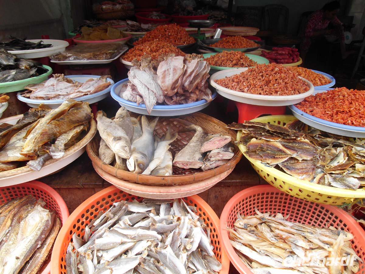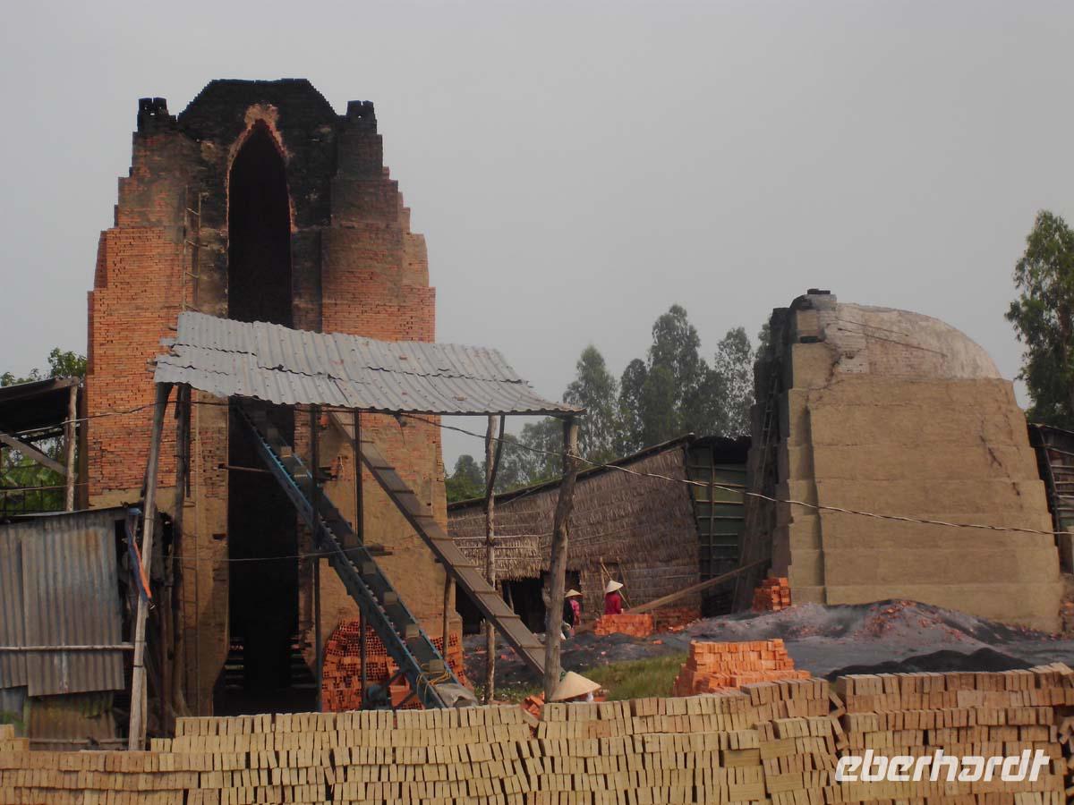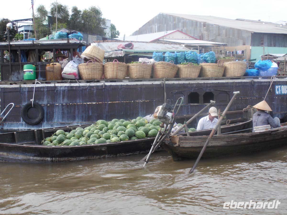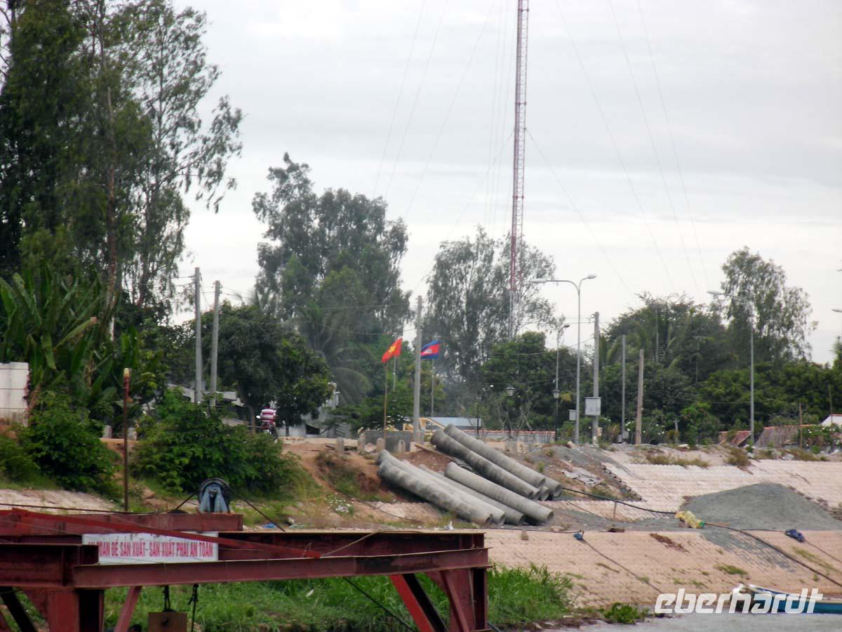 Morgens begeben wir uns zu den schwimmenden Märkten. Reges Treiben auf dem Wasser und dichtes Gewusel von kleinen Booten bis zu großen Schiffen, die alle voll beladen mit den unterschiedlichsten Lebensmitteln sind. Auch Restaurants und Händler decken sich hier mit Waren ein. Es ist irgendwie mit unseren Großmärkten zu vergleichen. Bloß eben auf dem Wasser. Unsere folgende Reise zur kambodschanischen Grenze wird durch Photostops aufgelockert bei denen Auberginenfelder, Erdnusspflanzungen und die schönen, blütenbesetzten Lotosteiche zu sehen sind. Kurz vor Chau Doc sind riesige Ziegelöfen zu bestaunen. Rauch zeigt an, welche davon gerade befeuert sind. Bei einer rast besorgt Ot für jene, die es möchten auch Hund in verschiedenen Zubereitungsformen. Natürlich gibt es auch die immer vorhandene reiche Auswahl an Suppen und Nudelgerichten. Der Tag neigt sich bei einem kleinen Spaziergang durch Chau Doc dem Ende zu. Die Stadt lebt zum einen von der Fischzucht und hat dem Pangasius am Fluss ein großes Denkmal gesetzt. Sie ist aber auch letzter Stop für alle, die morgen die Grenze nach Kambodscha passieren werden.
