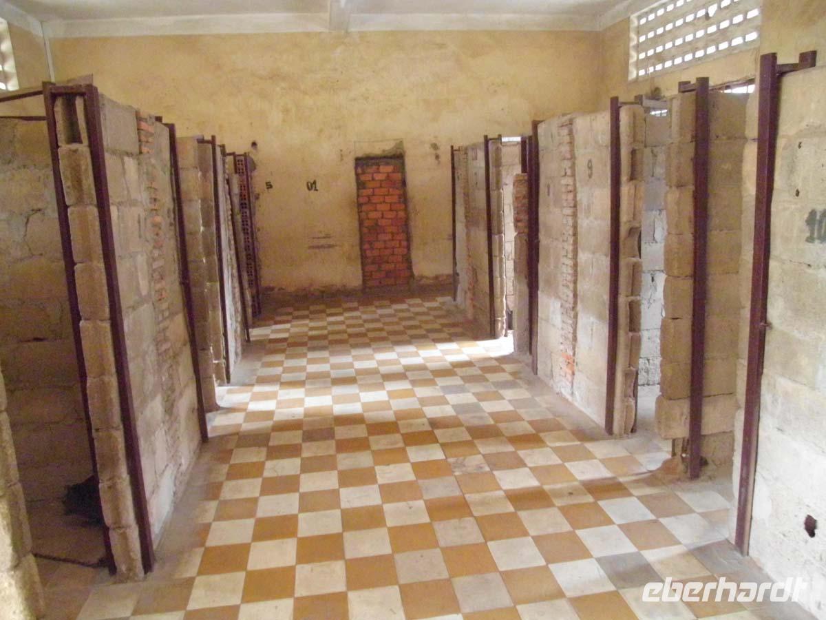 Wir verabschieden uns von Ot und haben eine zweistündige Prozedur an der vietnamesisch-kambodschanischen Grenze vor uns. Doch alles ist vergessen, als wir mit dem Schnellboot den Mekong hinauf in Richtung Phnom Penh reisen. Die Landschaft ist nun weniger dicht besiedelt. Hin und wieder sieht man am Ufer Bauern und Kinder mit ihren Kühen zusammen baden. Nach gut 3 Stunden kommt die Silhouette der kambodschanischen Hauptstadt in Sicht und am Ufer erwartet uns schon unser neuer Reiseleiter Chan Tou. Unser luxuriöses Hotel ist bezogen und der Nachmittag ist frei. Wer icht gleich in der Poollandschaft entspannen will, kommt mit uns in das berüchtigte Tuol Sleng Gefängnis, in dem die Schreckensherrschaft der roten Khmer eindrücklich dokumentiert ist. Noch heute hat das Land sich noch nicht von den wirtschaftliche Folgen des so genannten „Steinzeitkommunismus" erholt, geschweige denn, ist das politisch völlig aufgearbeitet. Allein unser Reiseleiter hat zu der Zeit 42 Verwandte verloren, so erzählt er uns.
