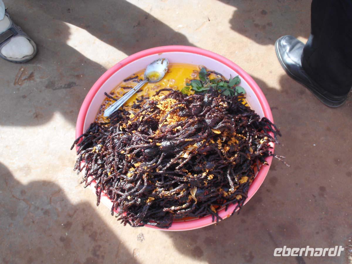 Chan Tou haben wir gestern verabschiedet und heute nimmt uns unser dritter Reiseleiter, Min Thol in Empfang. Auf unserem langen Weg durch das Land erfahren wir von ihm allumfänglich alles über die Wirtschaft, Geschichte, das Sozialwesen, die Bevölkerung und das Klima Kambodschas. Wir stoppen an einem Spinnenmarkt, wo man alles mögliche Getier angeboten bekommt, jedoch auch Obst und Gemüse. Mancher Gast probiert das eine oder andere Krabbeltier. Vor Siem Reap grüßt und Angkor schon mit der 700 Jahre alten Nagabrücke, die heute noch für Zweiräder und Fußgänger nutzbar ist. Ihre Geländer bestehen aus riesigen steinernen Nagas, den siebenköpfigen Kobras, die Buddha einst beim vor Störungen beim Erreichen der Erleuchtung schützten. Vor dem Abendessen nach Bezug unseres Hotels kann man es sich noch am Pool gemütlich machen.