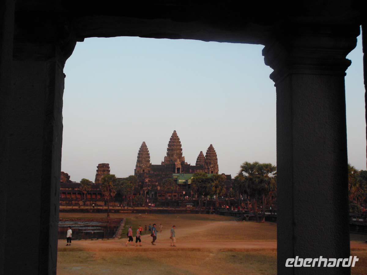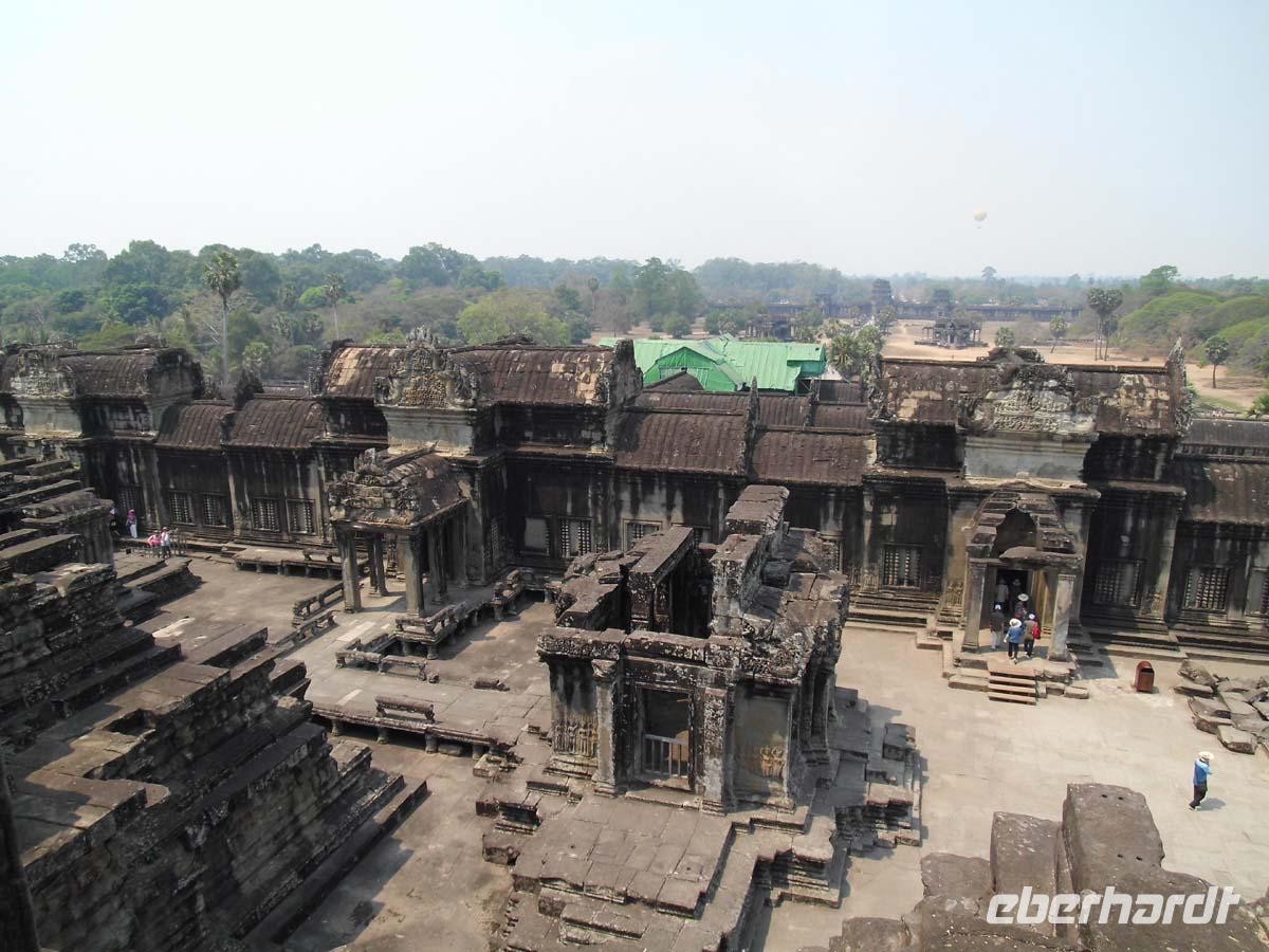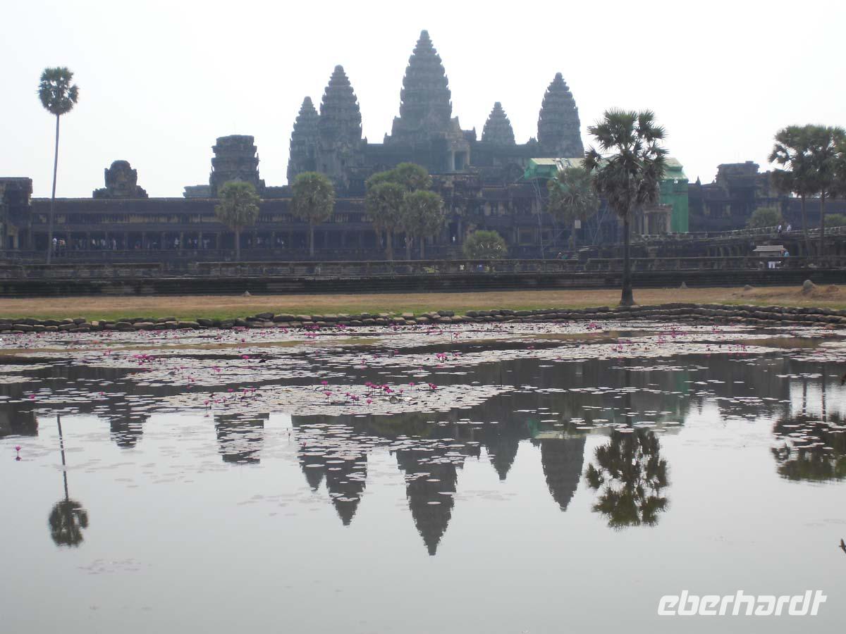 Mit unserem Besuch von Angkor Wat, dem größten Sakralbauwerk der Welt strebt die Reise einem weiteren Höhepunkt entgegen. Beim ersten Eintritt in das riesige Areal mit über 350 Tempeln müssen sich alle photographieren lassen. Diese Bild erscheint dann in dem Besucherpass, den man bei sich tragen, und vor jedem Tempel vorzeigen muss. Die Kontrollen sind sehr streng. Jeder Tempel der Khmer ist Ausdruck ihrer komplexen kosmologischen Anschauungen. Jeder Tempelbezirk war auch eine Stadt und der Tempel deren Mittelpunkt. Angkor Wat als einziger hat alle Zeiten als buddhistisches Kloster und Heiligtum überdauert. Und so begegnen uns auf dem Gelände auch die orange gekleideten Mönche. Umgeben von Umfassungsmauern, welche die Randgebirge des Universums darstellen sollen, ragen in der Mitte, weit entfernt, die 5 großen Zentraltürme des Tempels in den Morgendunst, die wie Lotosknospen geformt sind. Mehr als drei Stunden dauert unsere intensive Führung durch die riesigen, reliefierten Galerien bis hinauf auf die dritte Ebene, zu denen steilste Treppen zu bewältigen sind.