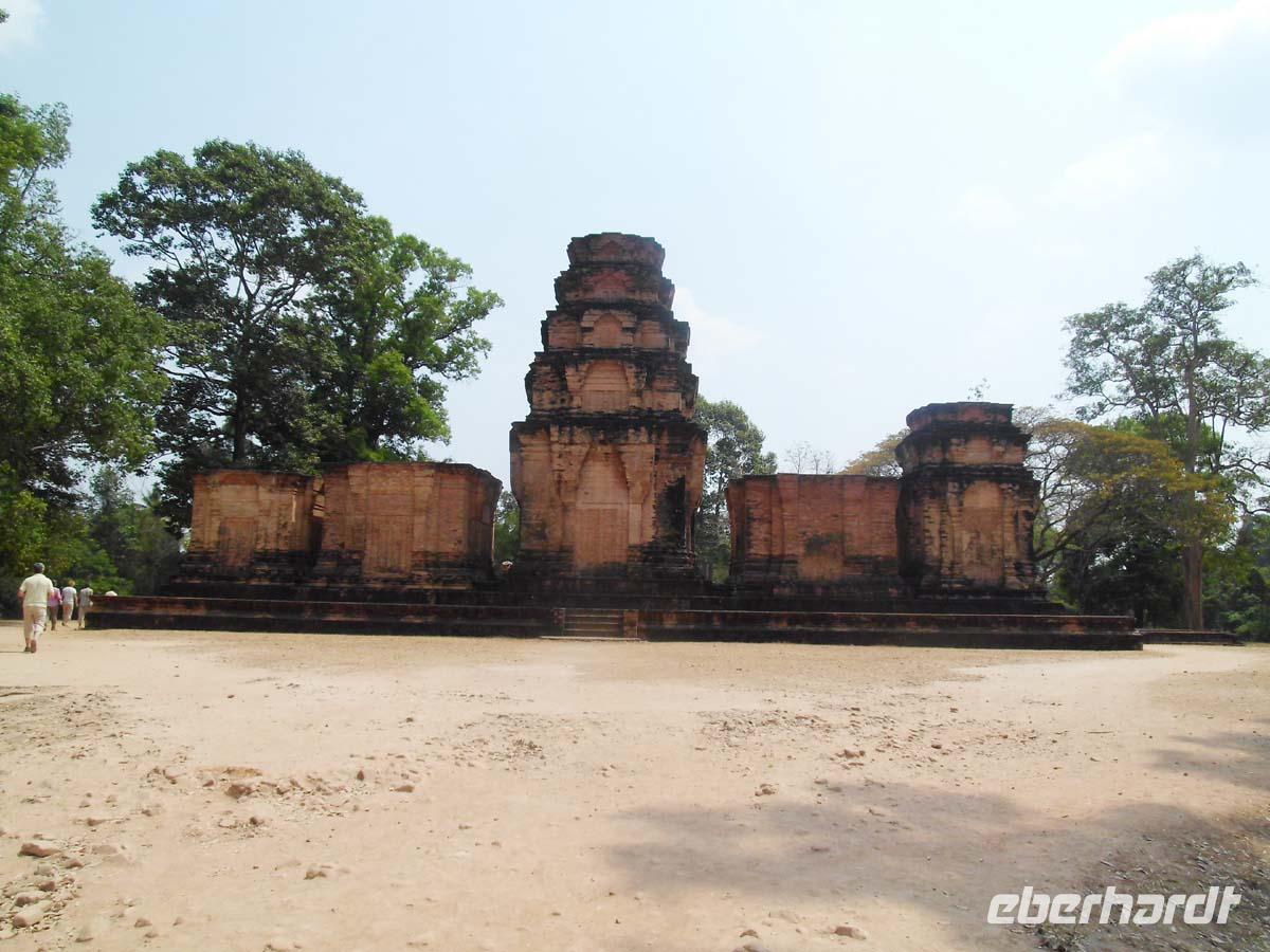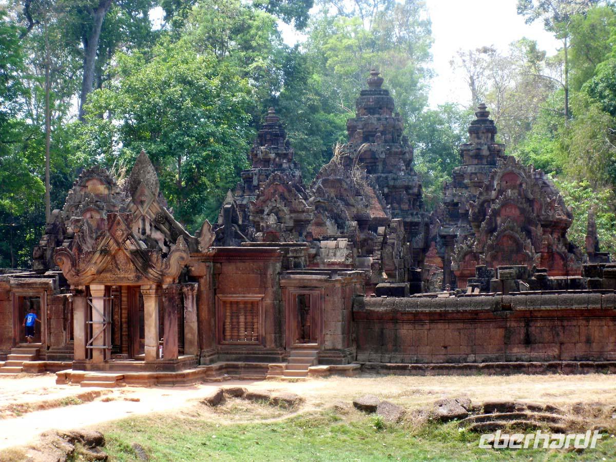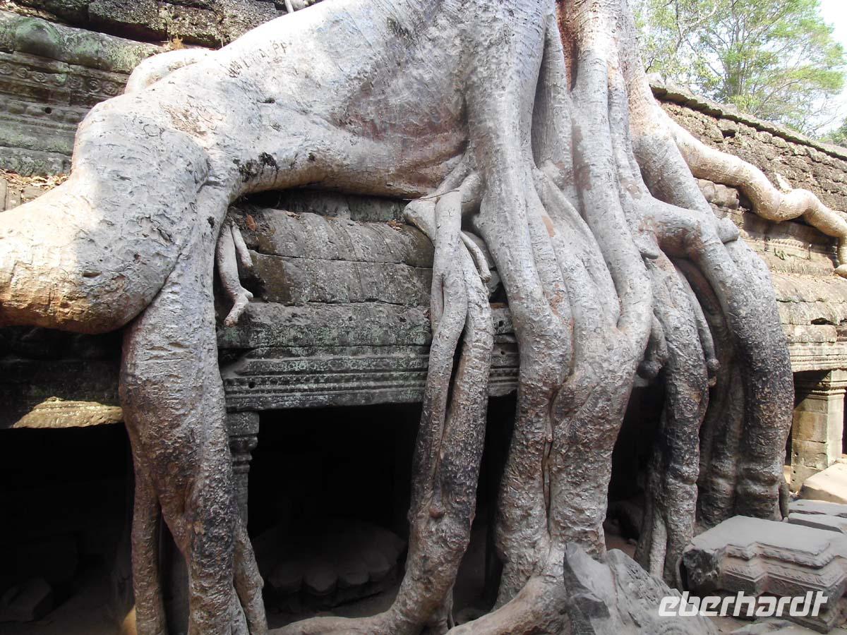 Wir können zwar nicht alle 350 Tempel schaffen, doch zumindest vier der wichtigsten schauen wir uns heute noch an. Zunächst Ta Prohm. Dieser ist bekannt für seine von großen Baumwurzeln überwucherten Tempelanlagen. Manche Bäume lässt man bewusst stehen, weil die Wurzeln heute das Mauerwerk mehr stützen als zerstören. Behutsam versucht man zu restaurieren. Unser Reiseleiter versteht es ausgezeichnet, uns von den Touristenmassen fernzuhalten, und ist mit uns gerade immer dort, wo es recht leer ist. So gelingen tatsächlich auch Bilder, wo keine Menschen vor den Tempeln stehen. So kennt er auch den direkten Weg durch das Gelände zum Banteay Kdei, wie Angkor Thom ebenfalls im 12. Jh. erbaut, jedoch als buddhistischer Flachtempel. Nach nur kurzer fahrt stehen wir später vor einem der ältesten Anlagen, dem Prasat Kravan aus dem frühen 10. Jh. der noch in Ziegelsteintechnik errichtet wurde. Letztes Objekt ist in 7 km Entfernung der Banteay Srei, für viele der am schönsten verzierte Tempel. Min Thol hat es wieder verstanden, genau zu dem Zeitpunkt hier zu sein, wo alle anderen zum Mittagessen sind.Hervorragend. Die filigranen Steinmetzarbeiten im Sandstein machen die Bauwerke aus der 2. Hälfte des 210. Jh. zu einem architektonischen Kleinod. Nach einem späten Mittagessen machen wir uns im Hotel zunächst frisch und schauen uns danach den Sonnenuntergang über Angkor Wat an. Unser Abendessen nutze ich zum Überreichen eines kleinen Abschiedsgeschenkes, weil es unser letzter gemeinsamer Abend zu Tisch ist. Glocken mit Apsarafiguren. Die Apsaras, himmlische Tänzerinnen, sind aus dem kosmischen Milchmeer hervorgegangen, als Geister und Dämonen es zu Butter schlugen. Wir kennen sie nun hinreichend aus den Galerien der Tempel und ihrer Darstellung in Tänzen.