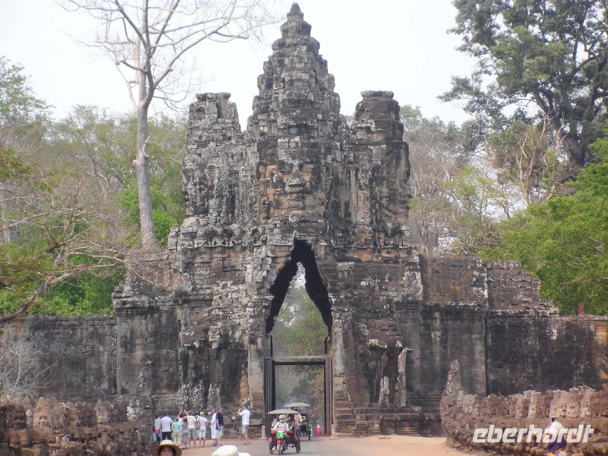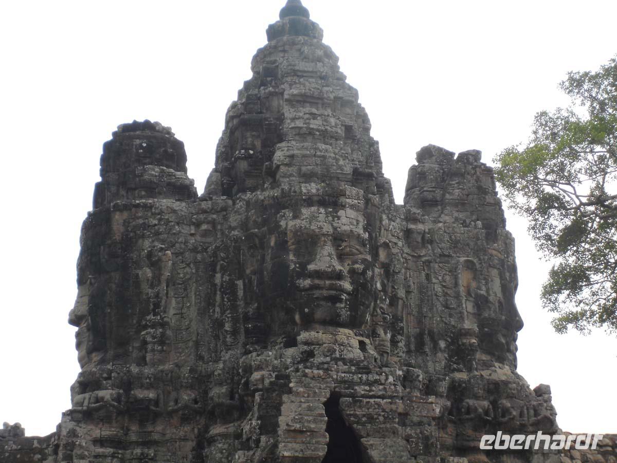 Nach unserem Mittag vor dem Areal begeben wir uns nach Angkor Thom, vormals eine eigene Tempelstadt mit mehr als 20000 Einwohnern. Hier müssen wir in einen kleinen Bus umsteigen, weil die großen nicht durch die Stadttore passen. Erstmals begegnen uns hier die Gesichtertürme mit dem geheimnisvollen Lächeln von Angkor. Auch dieses Gelände ist riesig, und so sind wir am Nachmittag nach Temperaturen bei fast 40 Grad und einer hohen Luftfeuchtigkeit doch recht erschöpft. Den Tag beschließen wir mit einem Buffet, zu dem folkloristische Tänze in z. T. prächtigen Kostümen dargeboten werden.