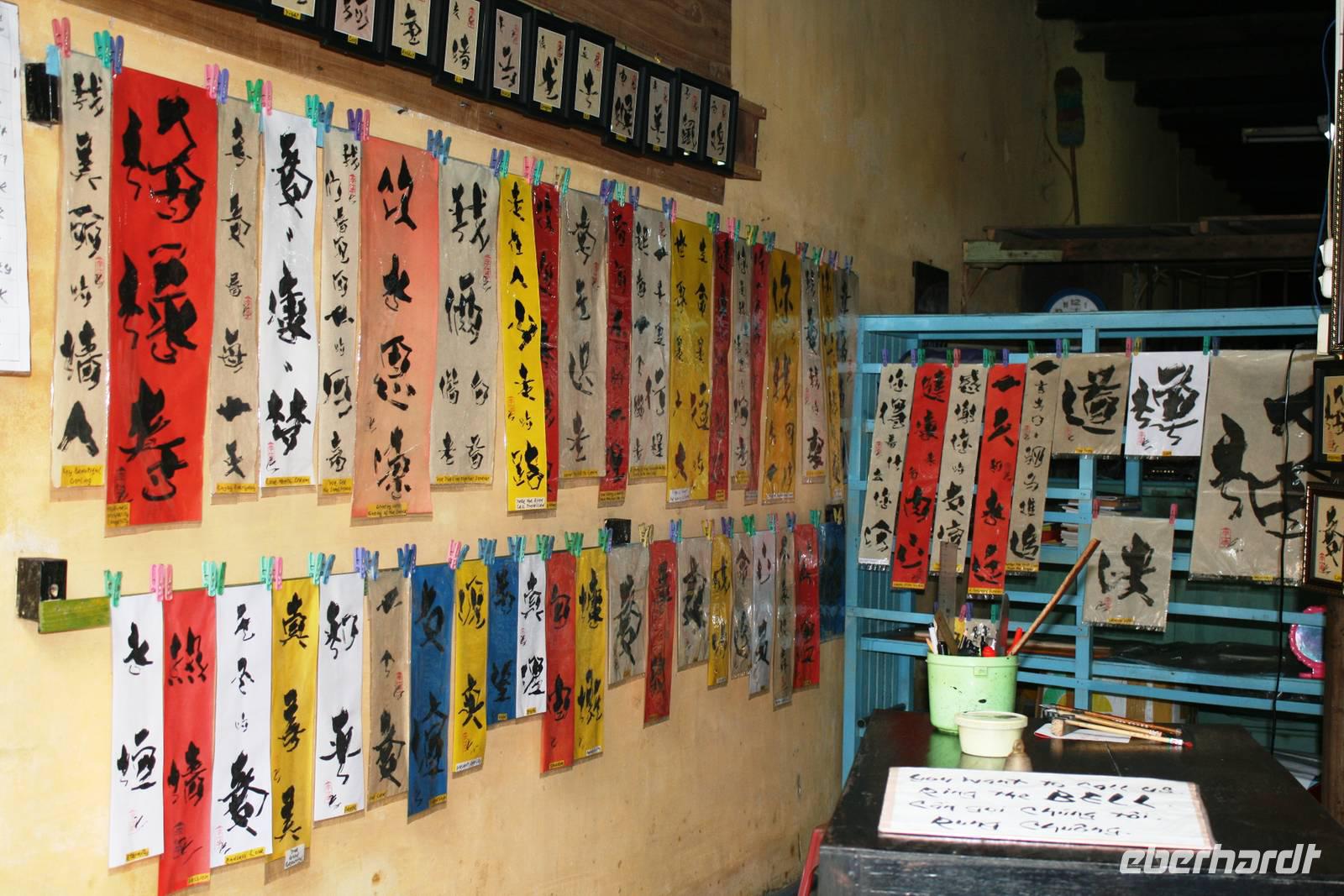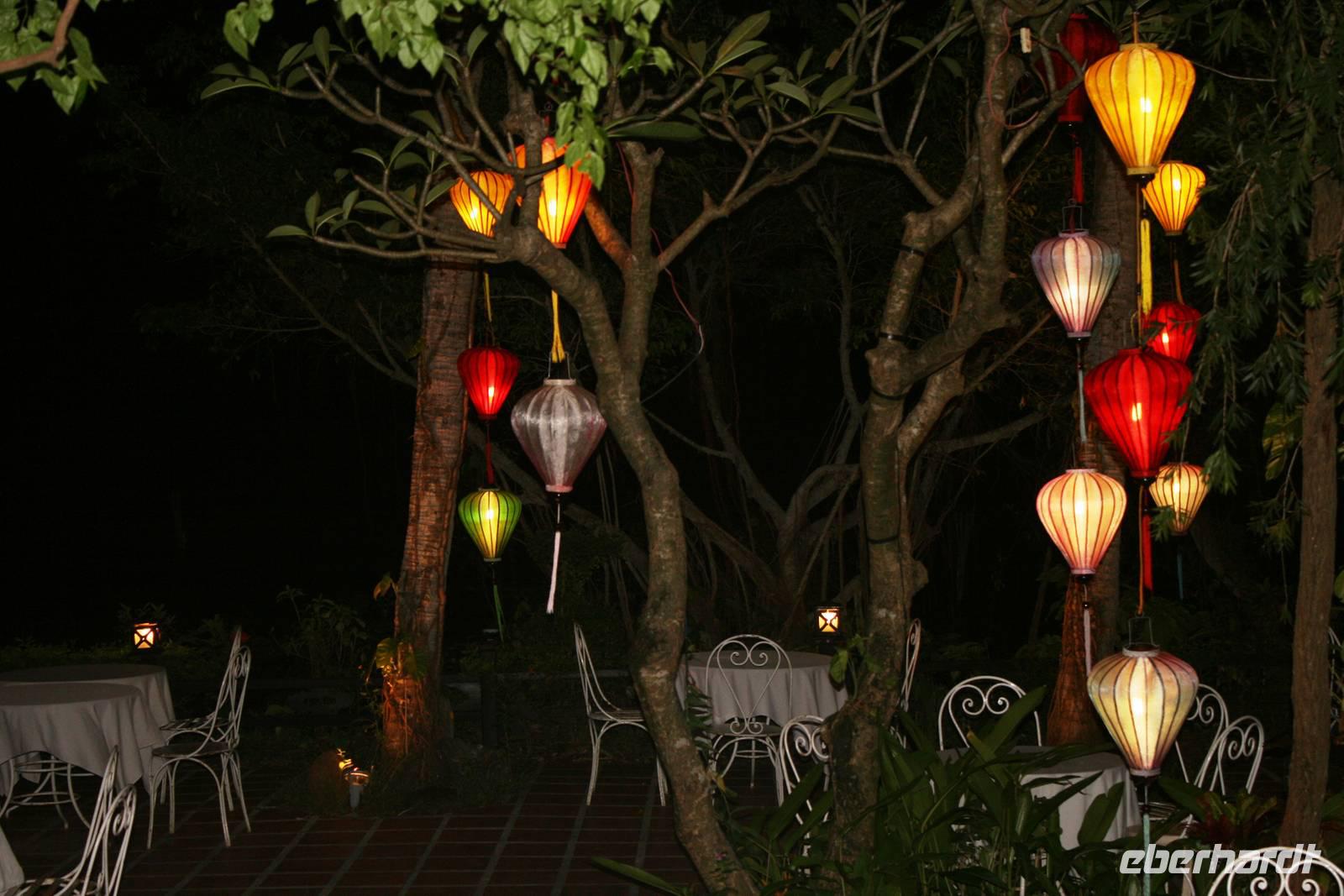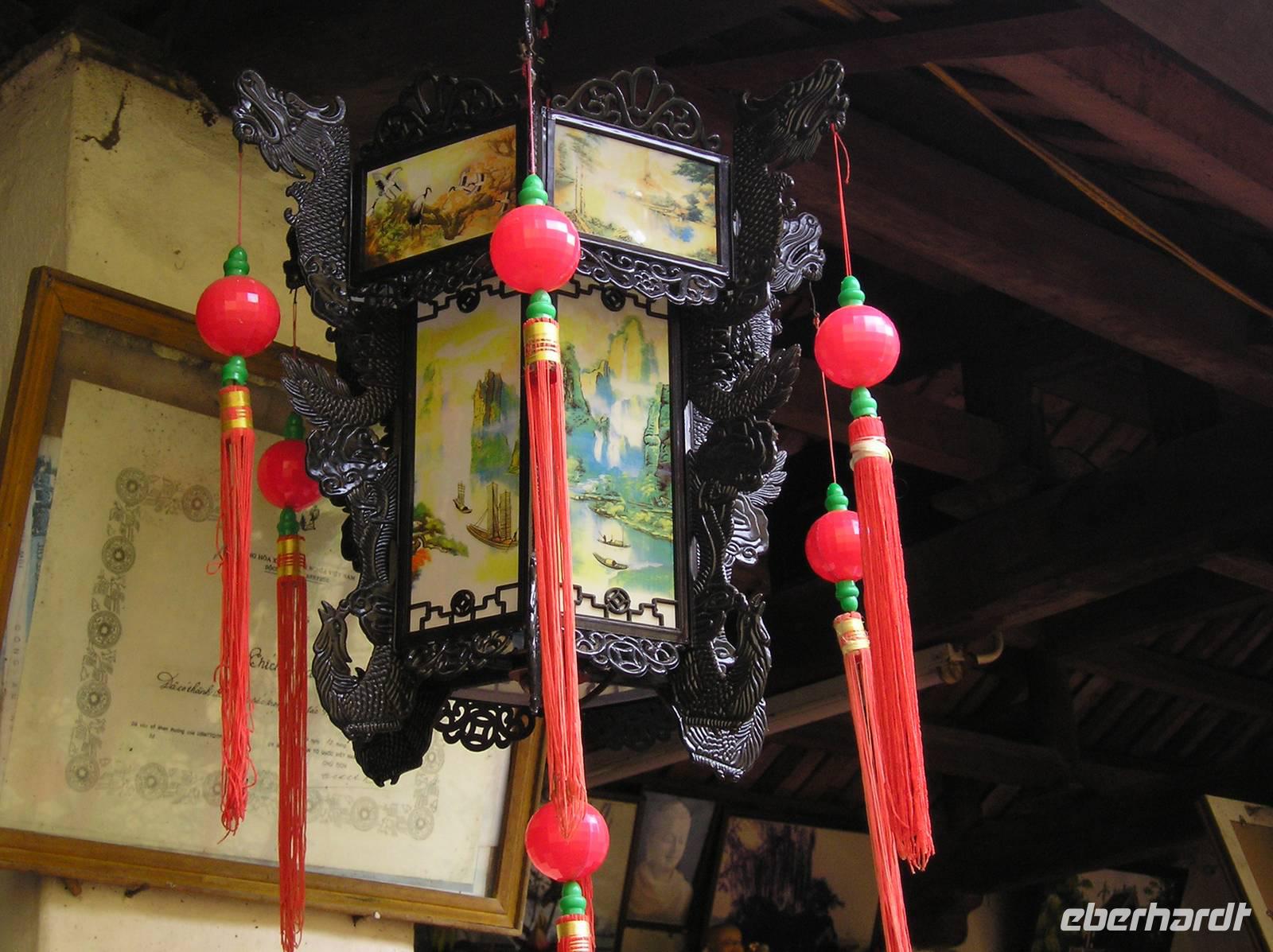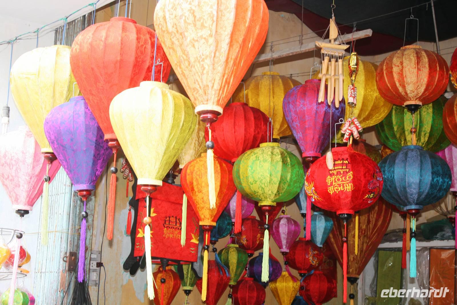 Unser Weg führte uns zur Versammlungshalle der Chinesen von Fujian. Im Inneren stieg uns sofort Weihrauchduft in die Nasen. Viele Räucherspiralen mit Wunschzetteln hingen an der Decke der Pagode. Man glaubt, dass der Weihrauch die Wünsche hinauf zur Himmelsgöttin trägt und so in Erfüllung gehen. Wir glaubten auch daran und verfassten unsere Wünsche auf einer gelben Tafel, die an einer riesigen Weihrauchspirale befestigt wurde und nun räuchert. Anschließend besuchten wir das Handelshaus Le Loi. Eine nette Mitarbeiterin erklärte uns traditionelle Gewerke wie die filigrane Seidenstickerei und - weberei sowie die Bastmattenherstellung. Auch erfuhren wir Interessantes zur Seideraupenzucht und Gewinnung der seidigen Fäden sowie zur deren Verarbeitung. Später spazierten wir zur Japanischen Brücke, die damals das japanische und chinesische Viertel trennte. Der Legende nach baute man die Brücke, als Japan mehrfach von verheerenden Erdbeben heimgesucht wurde, für die man ein Ungeheuer verantwortlich machte. Man glaubte, dass dessen Kopf in Indien, dessen Schwanz in Japan und dessen Herz in Hoi An lag. Mit dem Bau einer Brücke bezweckte man, dass sich Steinpfeiler wie ein "Schwert" in das Herz rammen sollten und so das Ungeheuer bezwingen. Wir spazierten weiter zu einem der ältesten Häuser von Hoi An, dem Handelshaus Tan Ky. Hier wurden wir mit Tee bewirtet und bestaunten die kunstvollen Holzgebälke im Inneren. Gleichzeitig erfuhren wir wie sich die Einwohner der Stadt gegen das ständige Hochwasser versuchen zu schützen. Und auch an diesen Tagen führte der Fluss wieder enorme Wassermassen, so dass der Bootsverkehr aus Sicherheitsgründen eingestellt wurde. Der Besuch des lokalen Marktes durfte natürlich auch nicht fehlen. Ngoc zeigte uns exotische Früchte wie Durian, Drachenaugen und Rambutan, die wir auch verkosteten. Mittlerweile hatte es angefangen, stark zu regnen und auch die Nachricht des herannahenden Taifuns Haiyan erreichte uns. Nach dem gemeinsamen Mittagessen gingen wir zum Hotel zurück. Auf dem Rückweg beobachteten wir, wie die Bewohner Hoi Ans über Funk über den Taifun informiert wurden und sich vorbereiteten: Verkaufsstände wurden geräumt, Häuser gesichert und Bäume gefällt. Später verabschiedeten wir Ngoc, der zu seiner Familie nach Da Nang fuhr. Auch in unserem Hotel waren bereits Sicherheitsvorkehrungen getroffen und Balkone und Terrassentüren der Zimmer dicht gemacht. Wir erfuhren, dass alle Zufahrtsstraßen nach Hoi An und Da Nang gesperrt waren, auch der Flughafen in Da Nang war bis auf Weiteres geschlossen. Ehrlich gesagt, es war schon ein beklemmendes Gefühl, wenn man die aktuelle Situation auf den Philippinen verfolgte. Dennoch fühlten wir uns gut betreut und relativ sicher. Die Mitarbeiter des Hotel wirkten beruhigend, informierten aktuell und ermöglichten einen halbwegs normalen Hotelbetrieb. Auch der ständige Kontakt zu unserer örtlichen Agentur war gegeben. Annett informierte die Gruppe regelmäßig und der Reisschnaps am Abend hatte eine beruhigende Wirkung, zu mal für diesen Abend noch keine Gefahr bestand. Der Taifun wurde erst für den nächsten Tag zwischen 10 und 11 Uhr an der Küste von Da Nang erwartet. Erst ab 21 Uhr wurde Ausgangssperre im Hotel verhängt, doch bis dahin war noch Zeit. Also zog es doch noch einige Gäste in die fast leere Altstadt.
