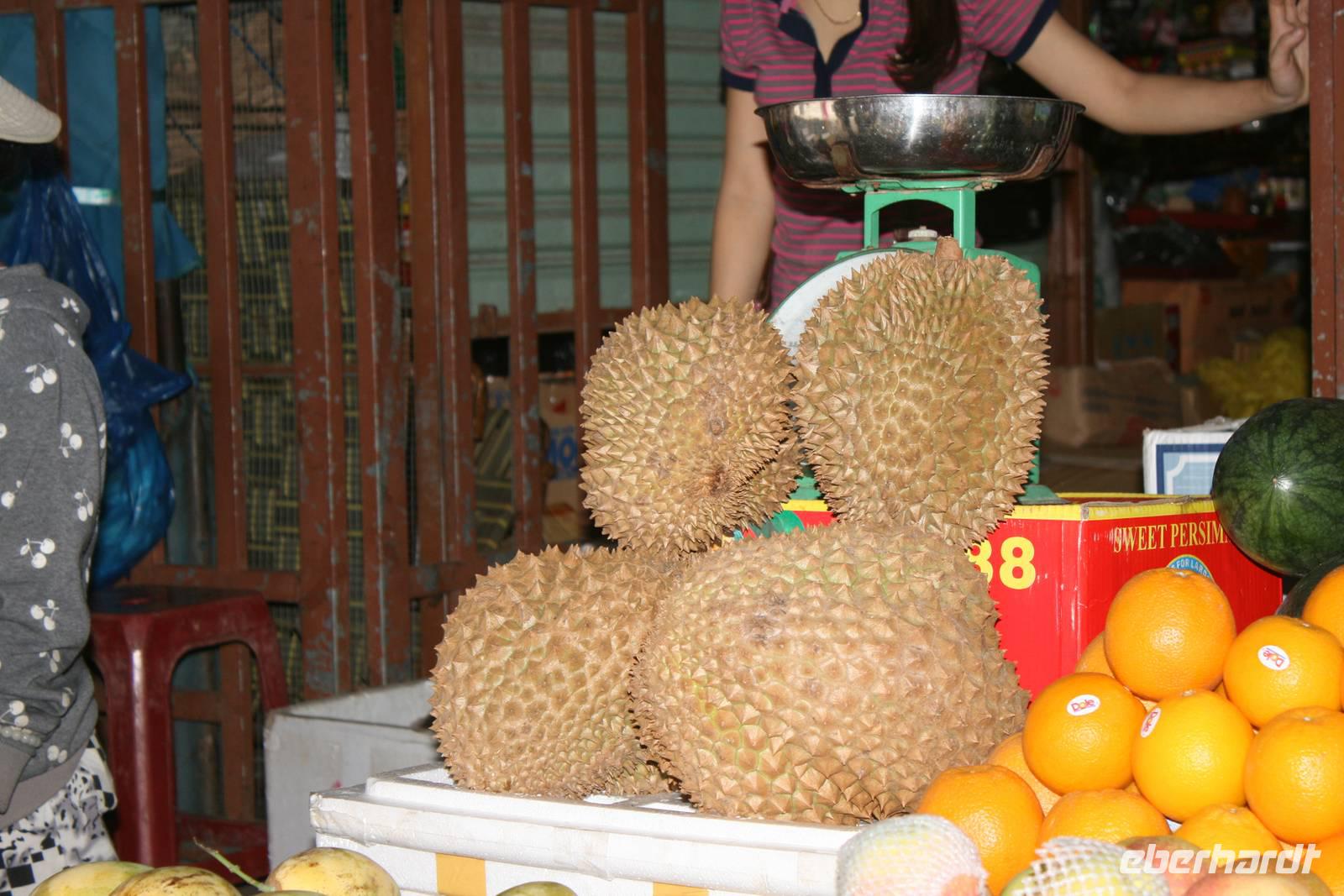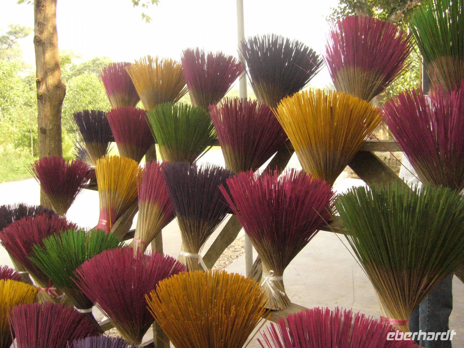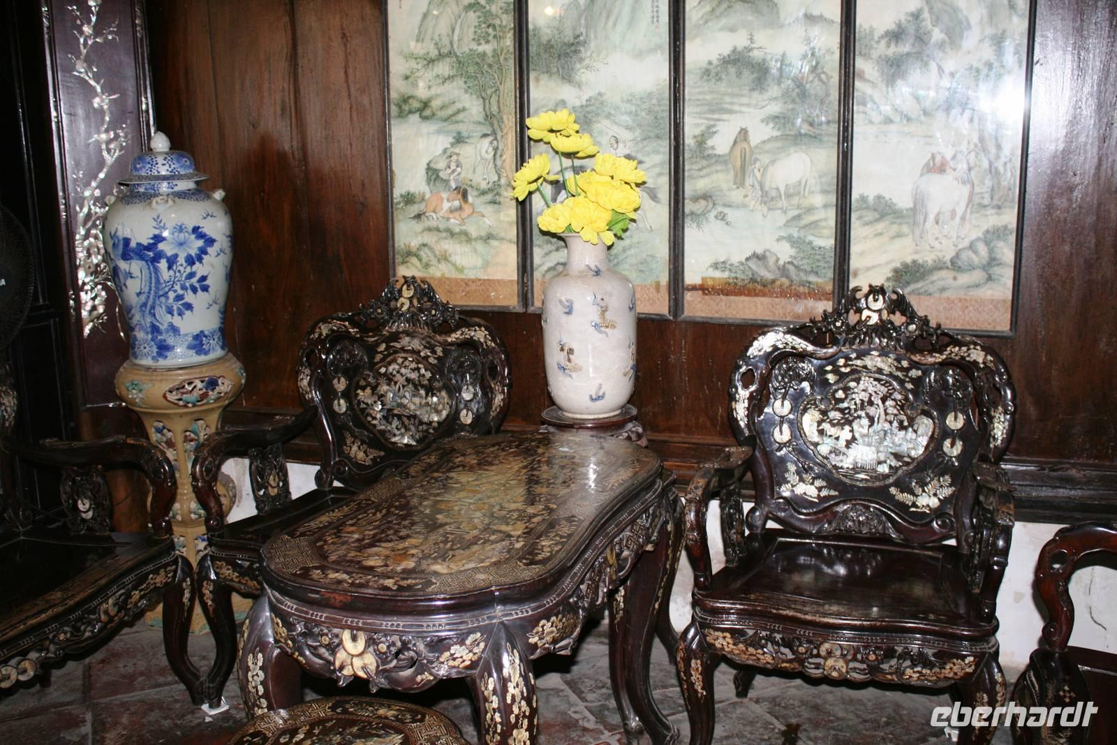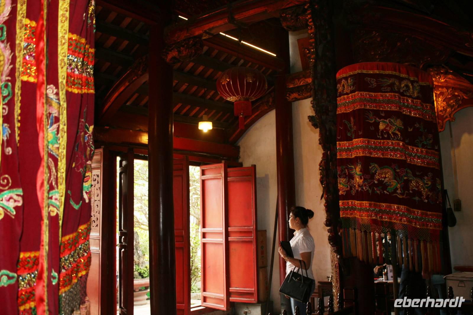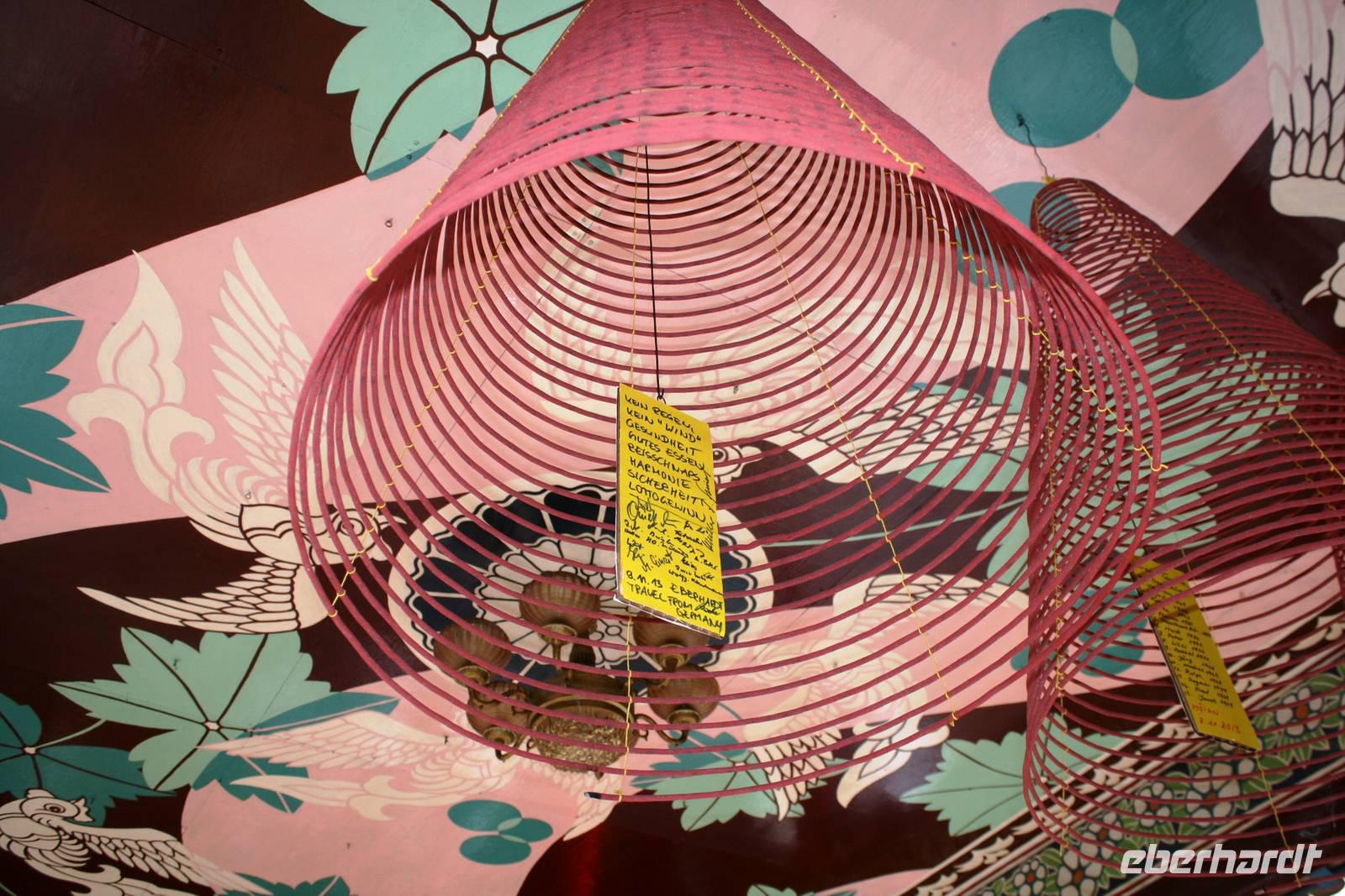 Unser Weg führte uns zur Versammlungshalle der Chinesen von Fujian. Im Inneren stieg uns sofort Weihrauchduft in die Nasen. Viele Räucherspiralen mit Wunschzetteln hingen an der Decke der Pagode. Man glaubt, dass der Weihrauch die Wünsche hinauf zur Himmelsgöttin trägt und so in Erfüllung gehen. Wir glaubten auch daran und verfassten unsere Wünsche auf einer gelben Tafel, die an einer riesigen Weihrauchspirale befestigt wurde und nun räuchert. Anschließend besuchten wir das Handelshaus Le Loi. Eine nette Mitarbeiterin erklärte uns traditionelle Gewerke wie die filigrane Seidenstickerei und - weberei sowie die Bastmattenherstellung. Auch erfuhren wir Interessantes zur Seideraupenzucht und Gewinnung der seidigen Fäden sowie zur deren Verarbeitung. Später spazierten wir zur Japanischen Brücke, die damals das japanische und chinesische Viertel trennte. Der Legende nach baute man die Brücke, als Japan mehrfach von verheerenden Erdbeben heimgesucht wurde, für die man ein Ungeheuer verantwortlich machte. Man glaubte, dass dessen Kopf in Indien, dessen Schwanz in Japan und dessen Herz in Hoi An lag. Mit dem Bau einer Brücke bezweckte man, dass sich Steinpfeiler wie ein "Schwert" in das Herz rammen sollten und so das Ungeheuer bezwingen. Wir spazierten weiter zu einem der ältesten Häuser von Hoi An, dem Handelshaus Tan Ky. Hier wurden wir mit Tee bewirtet und bestaunten die kunstvollen Holzgebälke im Inneren. Gleichzeitig erfuhren wir wie sich die Einwohner der Stadt gegen das ständige Hochwasser versuchen zu schützen. Und auch an diesen Tagen führte der Fluss wieder enorme Wassermassen, so dass der Bootsverkehr aus Sicherheitsgründen eingestellt wurde. Der Besuch des lokalen Marktes durfte natürlich auch nicht fehlen. Ngoc zeigte uns exotische Früchte wie Durian, Drachenaugen und Rambutan, die wir auch verkosteten. Mittlerweile hatte es angefangen, stark zu regnen und auch die Nachricht des herannahenden Taifuns Haiyan erreichte uns. Nach dem gemeinsamen Mittagessen gingen wir zum Hotel zurück. Auf dem Rückweg beobachteten wir, wie die Bewohner Hoi Ans über Funk über den Taifun informiert wurden und sich vorbereiteten: Verkaufsstände wurden geräumt, Häuser gesichert und Bäume gefällt. Später verabschiedeten wir Ngoc, der zu seiner Familie nach Da Nang fuhr. Auch in unserem Hotel waren bereits Sicherheitsvorkehrungen getroffen und Balkone und Terrassentüren der Zimmer dicht gemacht. Wir erfuhren, dass alle Zufahrtsstraßen nach Hoi An und Da Nang gesperrt waren, auch der Flughafen in Da Nang war bis auf Weiteres geschlossen. Ehrlich gesagt, es war schon ein beklemmendes Gefühl, wenn man die aktuelle Situation auf den Philippinen verfolgte. Dennoch fühlten wir uns gut betreut und relativ sicher. Die Mitarbeiter des Hotel wirkten beruhigend, informierten aktuell und ermöglichten einen halbwegs normalen Hotelbetrieb. Auch der ständige Kontakt zu unserer örtlichen Agentur war gegeben. Annett informierte die Gruppe regelmäßig und der Reisschnaps am Abend hatte eine beruhigende Wirkung, zu mal für diesen Abend noch keine Gefahr bestand. Der Taifun wurde erst für den nächsten Tag zwischen 10 und 11 Uhr an der Küste von Da Nang erwartet. Erst ab 21 Uhr wurde Ausgangssperre im Hotel verhängt, doch bis dahin war noch Zeit. Also zog es doch noch einige Gäste in die fast leere Altstadt.
