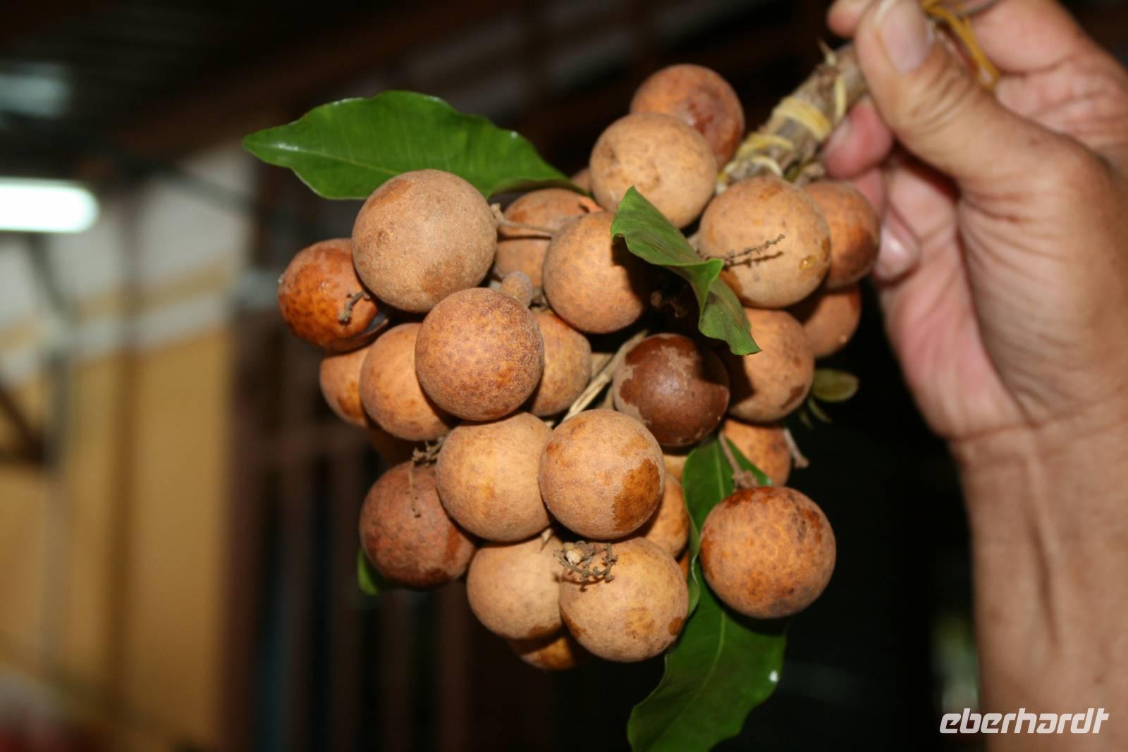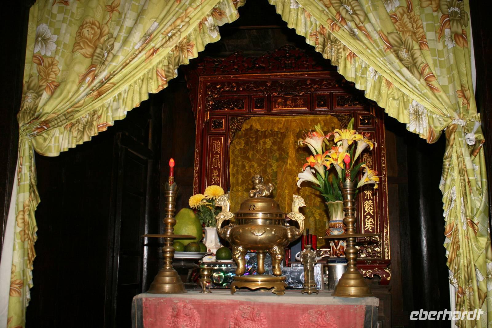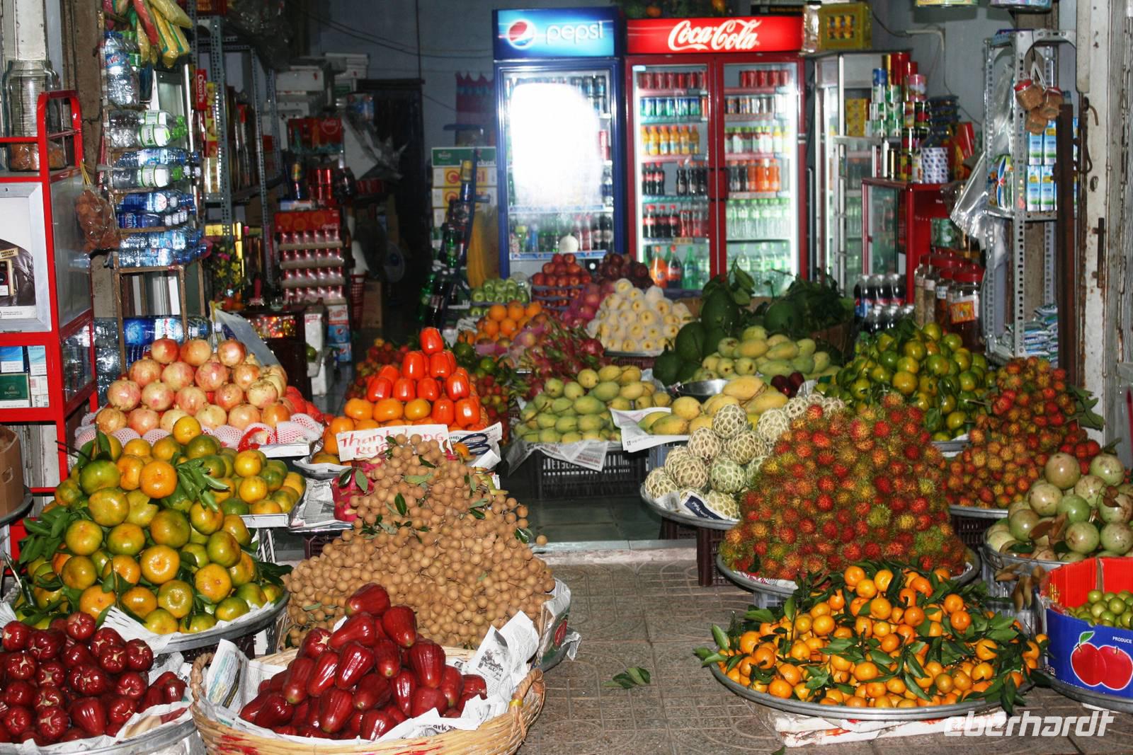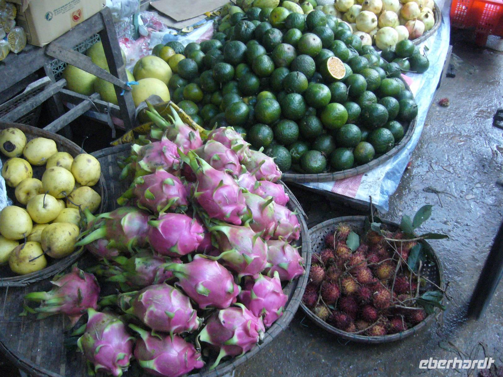 Unser Weg führte uns zur Versammlungshalle der Chinesen von Fujian. Im Inneren stieg uns sofort Weihrauchduft in die Nasen. Viele Räucherspiralen mit Wunschzetteln hingen an der Decke der Pagode. Man glaubt, dass der Weihrauch die Wünsche hinauf zur Himmelsgöttin trägt und so in Erfüllung gehen. Wir glaubten auch daran und verfassten unsere Wünsche auf einer gelben Tafel, die an einer riesigen Weihrauchspirale befestigt wurde und nun räuchert. Anschließend besuchten wir das Handelshaus Le Loi. Eine nette Mitarbeiterin erklärte uns traditionelle Gewerke wie die filigrane Seidenstickerei und - weberei sowie die Bastmattenherstellung. Auch erfuhren wir Interessantes zur Seideraupenzucht und Gewinnung der seidigen Fäden sowie zur deren Verarbeitung. Später spazierten wir zur Japanischen Brücke, die damals das japanische und chinesische Viertel trennte. Der Legende nach baute man die Brücke, als Japan mehrfach von verheerenden Erdbeben heimgesucht wurde, für die man ein Ungeheuer verantwortlich machte. Man glaubte, dass dessen Kopf in Indien, dessen Schwanz in Japan und dessen Herz in Hoi An lag. Mit dem Bau einer Brücke bezweckte man, dass sich Steinpfeiler wie ein "Schwert" in das Herz rammen sollten und so das Ungeheuer bezwingen. Wir spazierten weiter zu einem der ältesten Häuser von Hoi An, dem Handelshaus Tan Ky. Hier wurden wir mit Tee bewirtet und bestaunten die kunstvollen Holzgebälke im Inneren. Gleichzeitig erfuhren wir wie sich die Einwohner der Stadt gegen das ständige Hochwasser versuchen zu schützen. Und auch an diesen Tagen führte der Fluss wieder enorme Wassermassen, so dass der Bootsverkehr aus Sicherheitsgründen eingestellt wurde. Der Besuch des lokalen Marktes durfte natürlich auch nicht fehlen. Ngoc zeigte uns exotische Früchte wie Durian, Drachenaugen und Rambutan, die wir auch verkosteten. Mittlerweile hatte es angefangen, stark zu regnen und auch die Nachricht des herannahenden Taifuns Haiyan erreichte uns. Nach dem gemeinsamen Mittagessen gingen wir zum Hotel zurück. Auf dem Rückweg beobachteten wir, wie die Bewohner Hoi Ans über Funk über den Taifun informiert wurden und sich vorbereiteten: Verkaufsstände wurden geräumt, Häuser gesichert und Bäume gefällt. Später verabschiedeten wir Ngoc, der zu seiner Familie nach Da Nang fuhr. Auch in unserem Hotel waren bereits Sicherheitsvorkehrungen getroffen und Balkone und Terrassentüren der Zimmer dicht gemacht. Wir erfuhren, dass alle Zufahrtsstraßen nach Hoi An und Da Nang gesperrt waren, auch der Flughafen in Da Nang war bis auf Weiteres geschlossen. Ehrlich gesagt, es war schon ein beklemmendes Gefühl, wenn man die aktuelle Situation auf den Philippinen verfolgte. Dennoch fühlten wir uns gut betreut und relativ sicher. Die Mitarbeiter des Hotel wirkten beruhigend, informierten aktuell und ermöglichten einen halbwegs normalen Hotelbetrieb. Auch der ständige Kontakt zu unserer örtlichen Agentur war gegeben. Annett informierte die Gruppe regelmäßig und der Reisschnaps am Abend hatte eine beruhigende Wirkung, zu mal für diesen Abend noch keine Gefahr bestand. Der Taifun wurde erst für den nächsten Tag zwischen 10 und 11 Uhr an der Küste von Da Nang erwartet. Erst ab 21 Uhr wurde Ausgangssperre im Hotel verhängt, doch bis dahin war noch Zeit. Also zog es doch noch einige Gäste in die fast leere Altstadt.