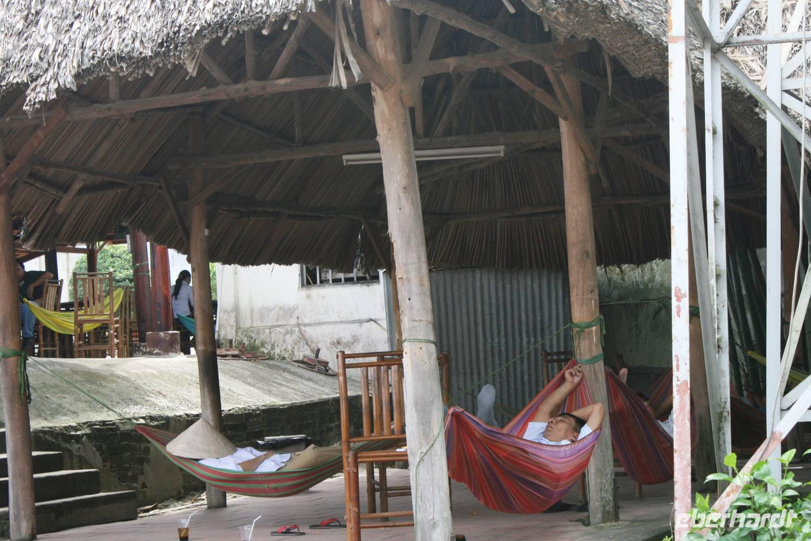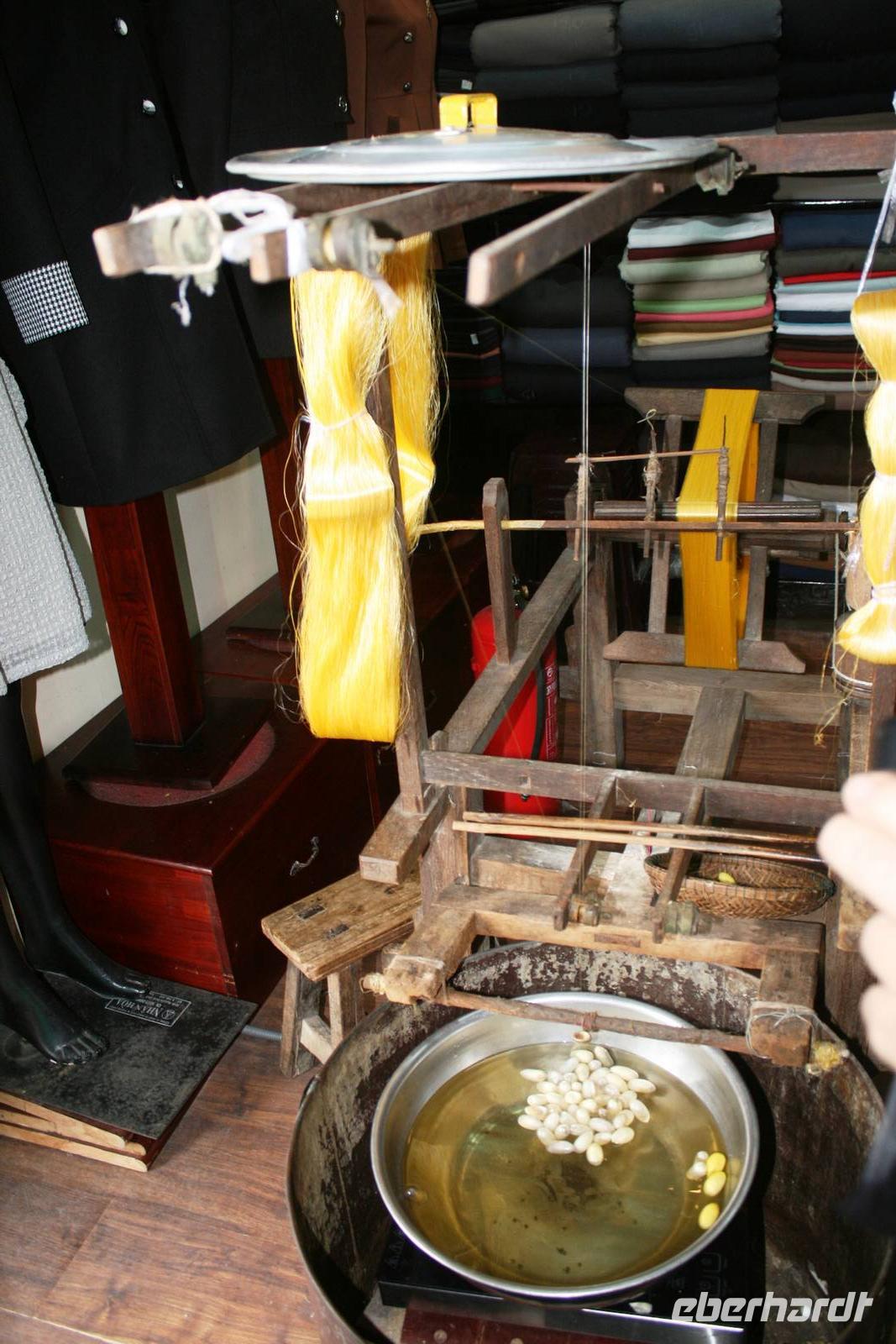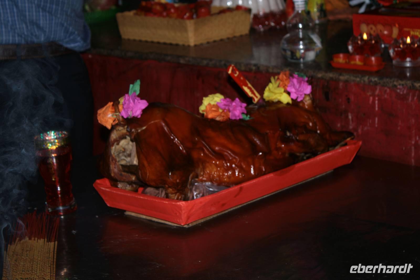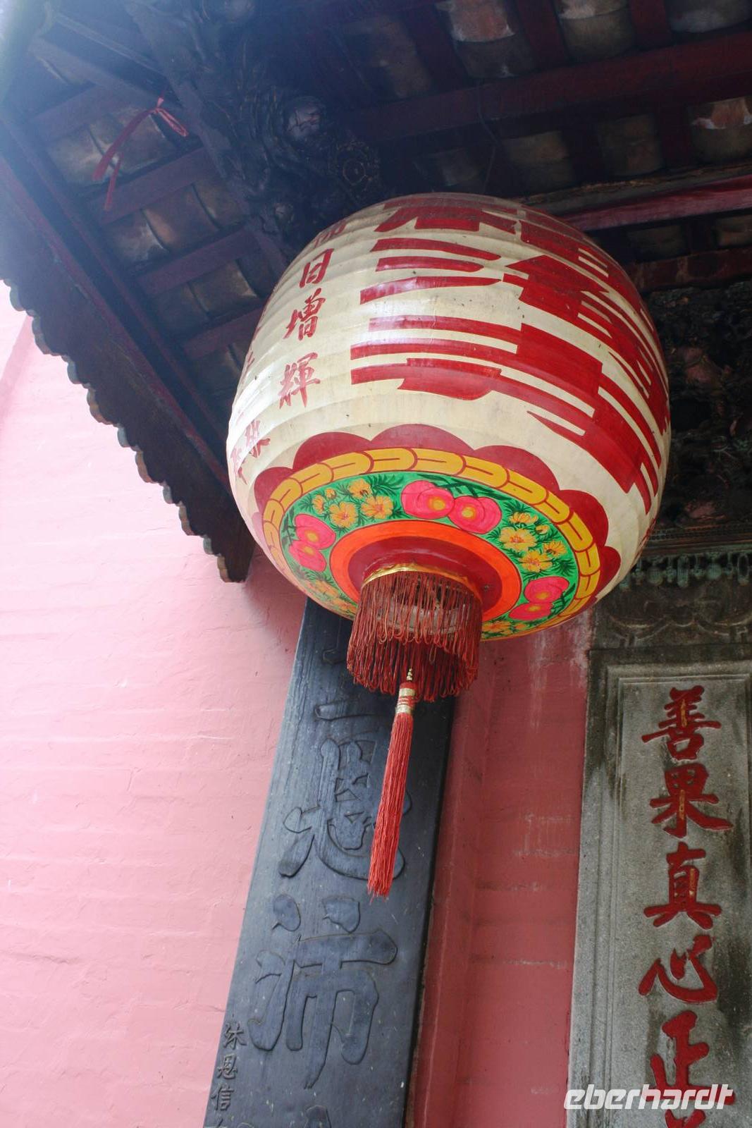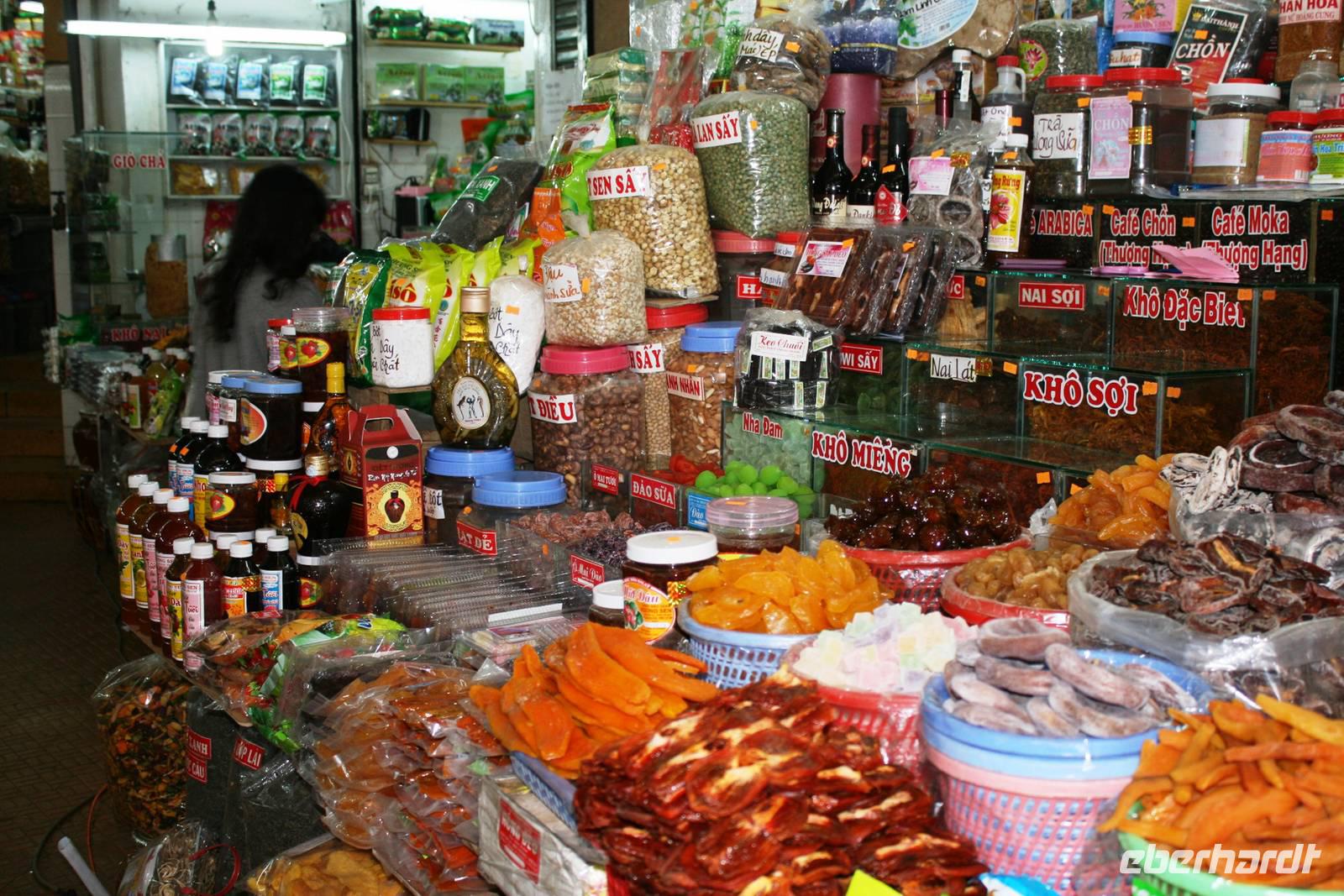 Unser Weg führte uns zur Versammlungshalle der Chinesen von Fujian. Im Inneren stieg uns sofort Weihrauchduft in die Nasen. Viele Räucherspiralen mit Wunschzetteln hingen an der Decke der Pagode. Man glaubt, dass der Weihrauch die Wünsche hinauf zur Himmelsgöttin trägt und so in Erfüllung gehen. Wir glaubten auch daran und verfassten unsere Wünsche auf einer gelben Tafel, die an einer riesigen Weihrauchspirale befestigt wurde und nun räuchert. Anschließend besuchten wir das Handelshaus Le Loi. Eine nette Mitarbeiterin erklärte uns traditionelle Gewerke wie die filigrane Seidenstickerei und - weberei sowie die Bastmattenherstellung. Auch erfuhren wir Interessantes zur Seideraupenzucht und Gewinnung der seidigen Fäden sowie zur deren Verarbeitung. Später spazierten wir zur Japanischen Brücke, die damals das japanische und chinesische Viertel trennte. Der Legende nach baute man die Brücke, als Japan mehrfach von verheerenden Erdbeben heimgesucht wurde, für die man ein Ungeheuer verantwortlich machte. Man glaubte, dass dessen Kopf in Indien, dessen Schwanz in Japan und dessen Herz in Hoi An lag. Mit dem Bau einer Brücke bezweckte man, dass sich Steinpfeiler wie ein "Schwert" in das Herz rammen sollten und so das Ungeheuer bezwingen. Wir spazierten weiter zu einem der ältesten Häuser von Hoi An, dem Handelshaus Tan Ky. Hier wurden wir mit Tee bewirtet und bestaunten die kunstvollen Holzgebälke im Inneren. Gleichzeitig erfuhren wir wie sich die Einwohner der Stadt gegen das ständige Hochwasser versuchen zu schützen. Und auch an diesen Tagen führte der Fluss wieder enorme Wassermassen, so dass der Bootsverkehr aus Sicherheitsgründen eingestellt wurde. Der Besuch des lokalen Marktes durfte natürlich auch nicht fehlen. Ngoc zeigte uns exotische Früchte wie Durian, Drachenaugen und Rambutan, die wir auch verkosteten. Mittlerweile hatte es angefangen, stark zu regnen und auch die Nachricht des herannahenden Taifuns Haiyan erreichte uns. Nach dem gemeinsamen Mittagessen gingen wir zum Hotel zurück. Auf dem Rückweg beobachteten wir, wie die Bewohner Hoi Ans über Funk über den Taifun informiert wurden und sich vorbereiteten: Verkaufsstände wurden geräumt, Häuser gesichert und Bäume gefällt. Später verabschiedeten wir Ngoc, der zu seiner Familie nach Da Nang fuhr. Auch in unserem Hotel waren bereits Sicherheitsvorkehrungen getroffen und Balkone und Terrassentüren der Zimmer dicht gemacht. Wir erfuhren, dass alle Zufahrtsstraßen nach Hoi An und Da Nang gesperrt waren, auch der Flughafen in Da Nang war bis auf Weiteres geschlossen. Ehrlich gesagt, es war schon ein beklemmendes Gefühl, wenn man die aktuelle Situation auf den Philippinen verfolgte. Dennoch fühlten wir uns gut betreut und relativ sicher. Die Mitarbeiter des Hotel wirkten beruhigend, informierten aktuell und ermöglichten einen halbwegs normalen Hotelbetrieb. Auch der ständige Kontakt zu unserer örtlichen Agentur war gegeben. Annett informierte die Gruppe regelmäßig und der Reisschnaps am Abend hatte eine beruhigende Wirkung, zu mal für diesen Abend noch keine Gefahr bestand. Der Taifun wurde erst für den nächsten Tag zwischen 10 und 11 Uhr an der Küste von Da Nang erwartet. Erst ab 21 Uhr wurde Ausgangssperre im Hotel verhängt, doch bis dahin war noch Zeit. Also zog es doch noch einige Gäste in die fast leere Altstadt.