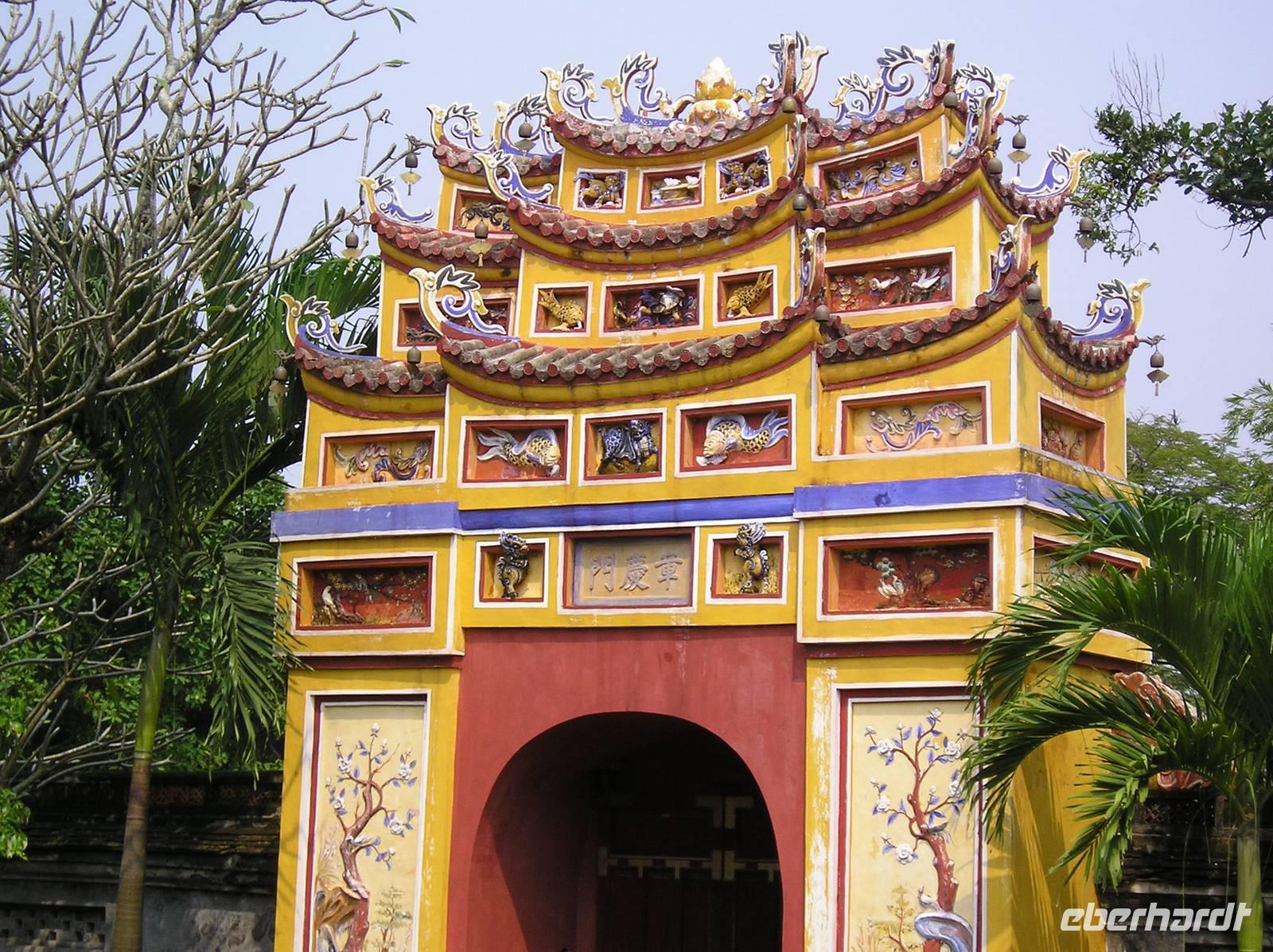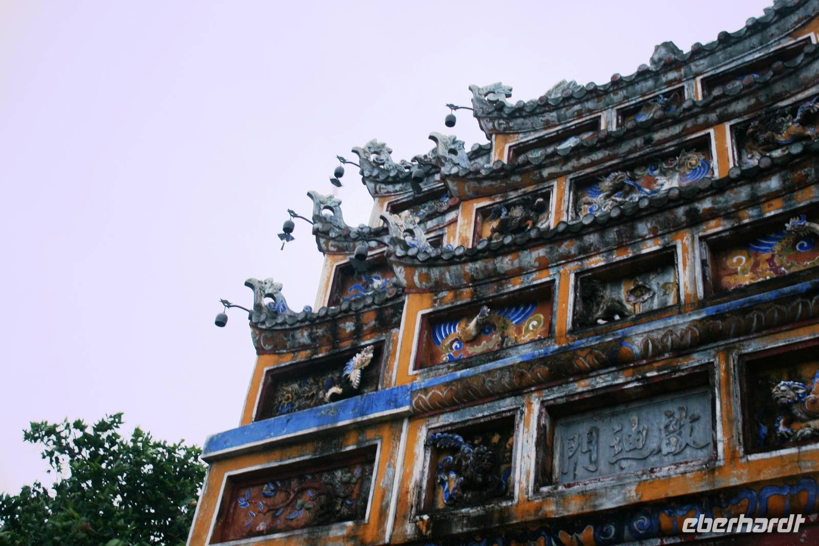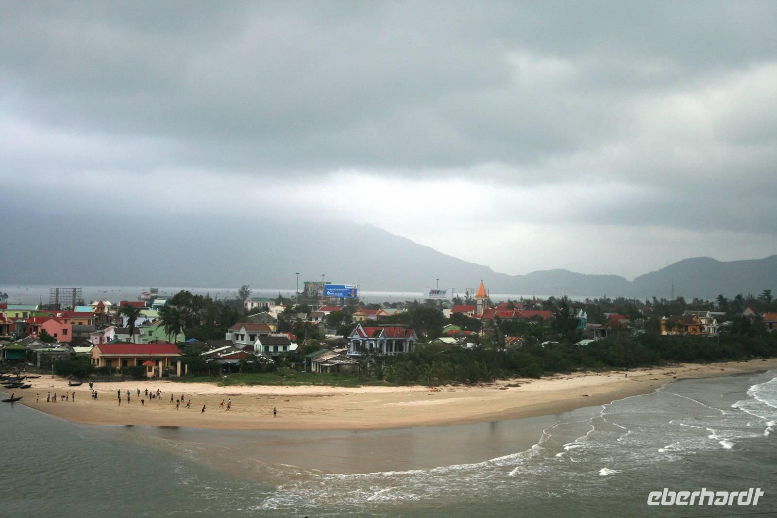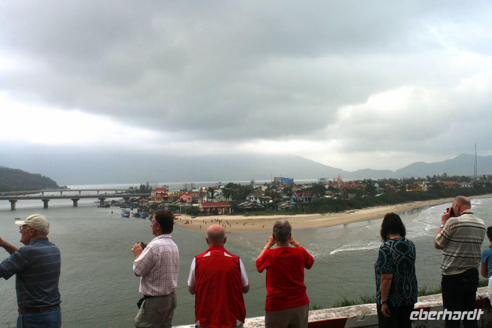 Da der Parfümfluss (Fluss der Wohlgerüche) zu viel Wasser führte, fuhren wir das kurze Stück zur Thien Mu Pagode nicht mit dem Boot, sondern mit dem Bus. Die älteste Pagode Hues wurde 1601 erbaut und der Himmelsgöttin geweiht. Unser Reiseleiter Ngoc erzählte uns viel Interessantes zur Entstehungsgeschichte und über den Buddhismus. Er besitzt ein umfangreiches Wissen und mittlerweile verstanden wir sein etwas eigenwilliges Deutsch. Der 21 m hohe, achteckige Turm mit sieben Stockwerken ragt wie ein Leuchtturm empor. Jedes der Stockwerke symbolisiert eine Inkarnation Buddhas. Fasziniert waren wir von der ca. 2 Tonnen schweren Bronzeglocke, deren Klang über 10 km weit zu hören sein soll. Die grimmig schauenden Wächter am Eingang bereiteten uns keine Angst und so betraten wir die gepflegte Anlage mit anhängendem aktiven Kloster. Mittlerweile spürten wir die für uns ungewöhnlichen Temperaturen und enorme Luftfeuchtigkeit und gingen alles langsamer an. Mit Bus fuhren wir weiter zu den eindrucksvollen Grabstätten der Viet Kaiser. Wo die Trauer lächelt, und die Freude weint - Treffender kann man die Stimmung dieser Orte kaum wiedergeben. Zunächst besichtigten wir die monumentale Grabanlage von Kaiser Kai Dinh, dem letzten Kaiser, der nur noch eine Marionette der Franzosen war. Viele europäische Einflüsse sind hier zu erkennen. Danach fuhren wir zur Grabanlage des Kaisers Minh Mang. Die großzügig angelegte Anlage in einem Park repräsentiert einen völlig anderen Baustil. Danach verliessen wir die alte Kaiserstadt. Unser heutiges Ziel war das historische Handelstädtchen Hoi An. Am stürmischen Lang Co Strand pausierten wir und stärkten uns bei gebratenen Nudeln und Bia. Nun ging es hinauf. Der Wolkenpass bildet die natürliche Grenze und Wetterscheide zwischen Nord- und Süd-Vietnam. Er ist etwa 20 Kilometer lang und erreicht 496 Meter Höhe. Der Wolkenpass machte seinem Namen wieder mal alle Ehre, aber wir hielten trotzdem am höchsten Punkt an und nahmen Abschied von Nordvietnam. Über die Nationalstraße 1 gelangten wir nach Da Nang. Hier ist Ngoc zu Hause. Da Nang ist die viertgrößte Stadt Vietnams und durch seinen Naturhafen zum Pazifischen Ozean auch eine wichtige Handelsstadt. Am Abend erreichten wir Hoi An.