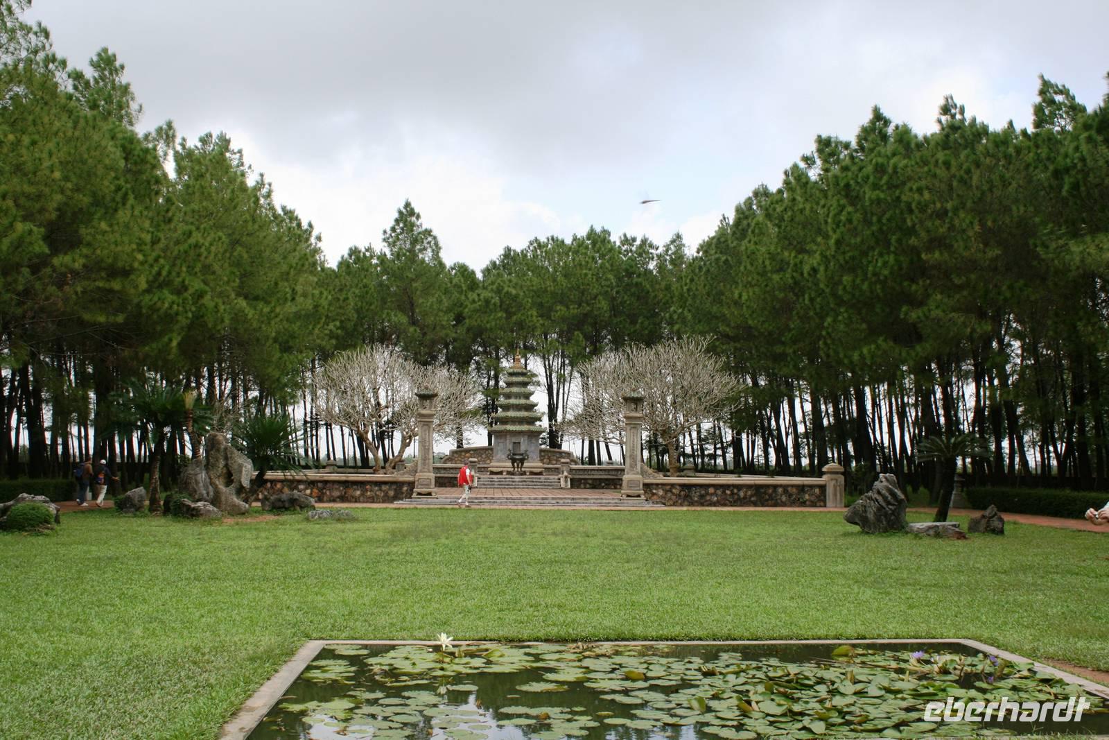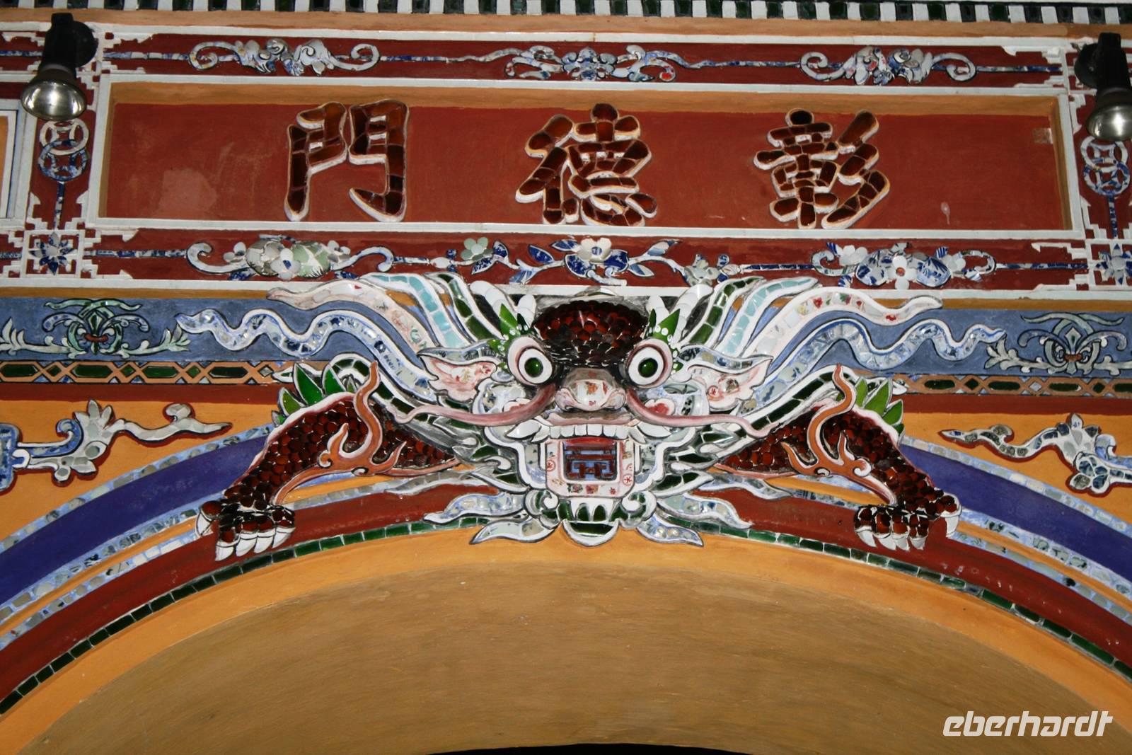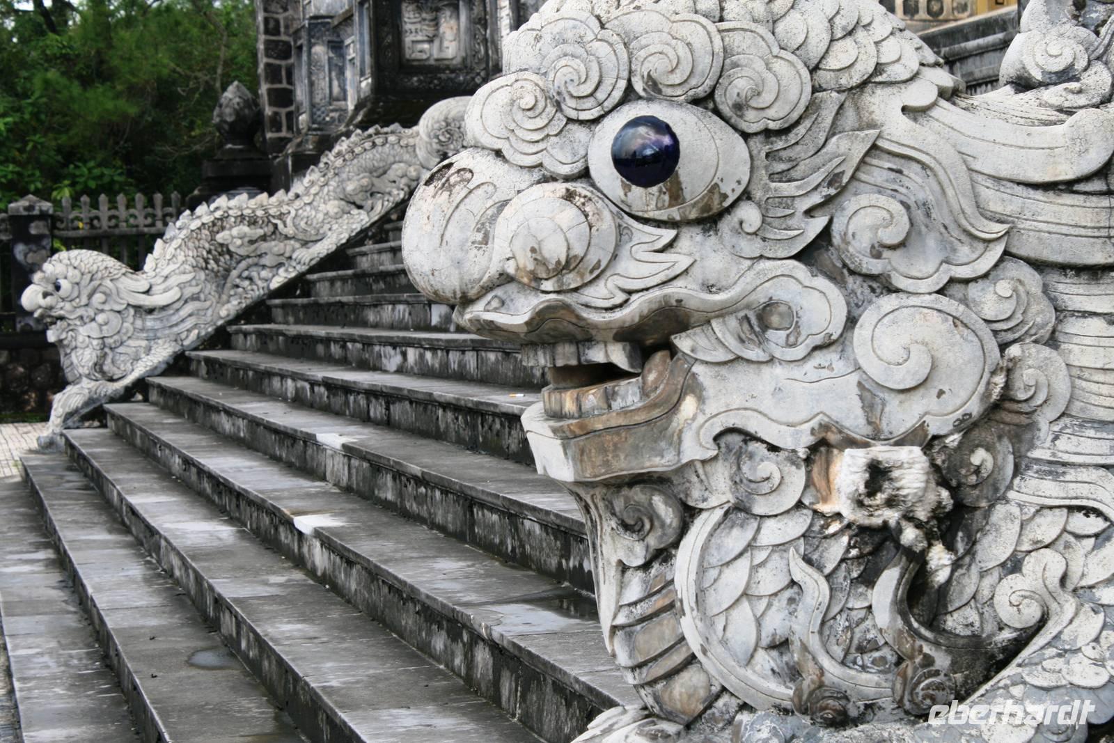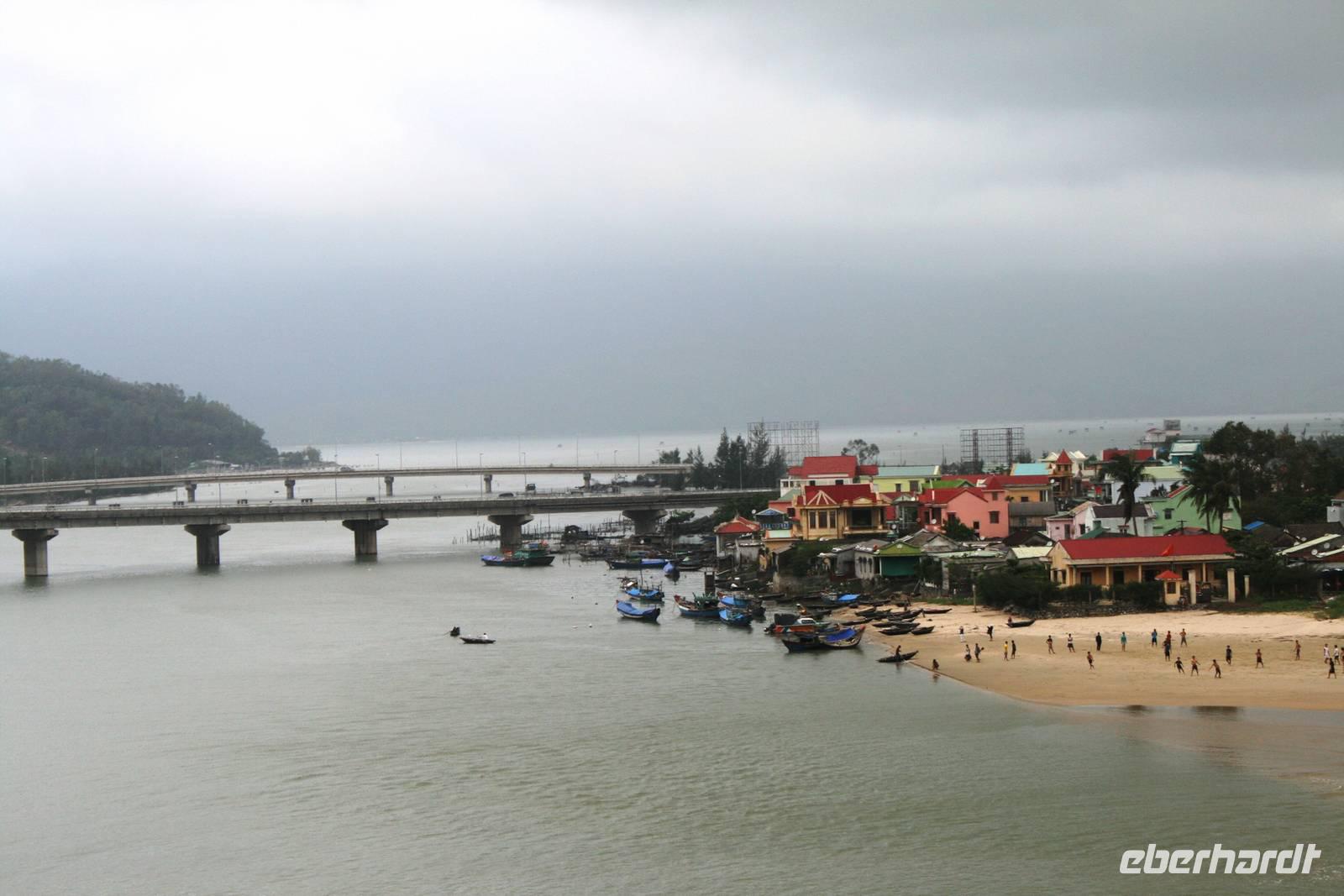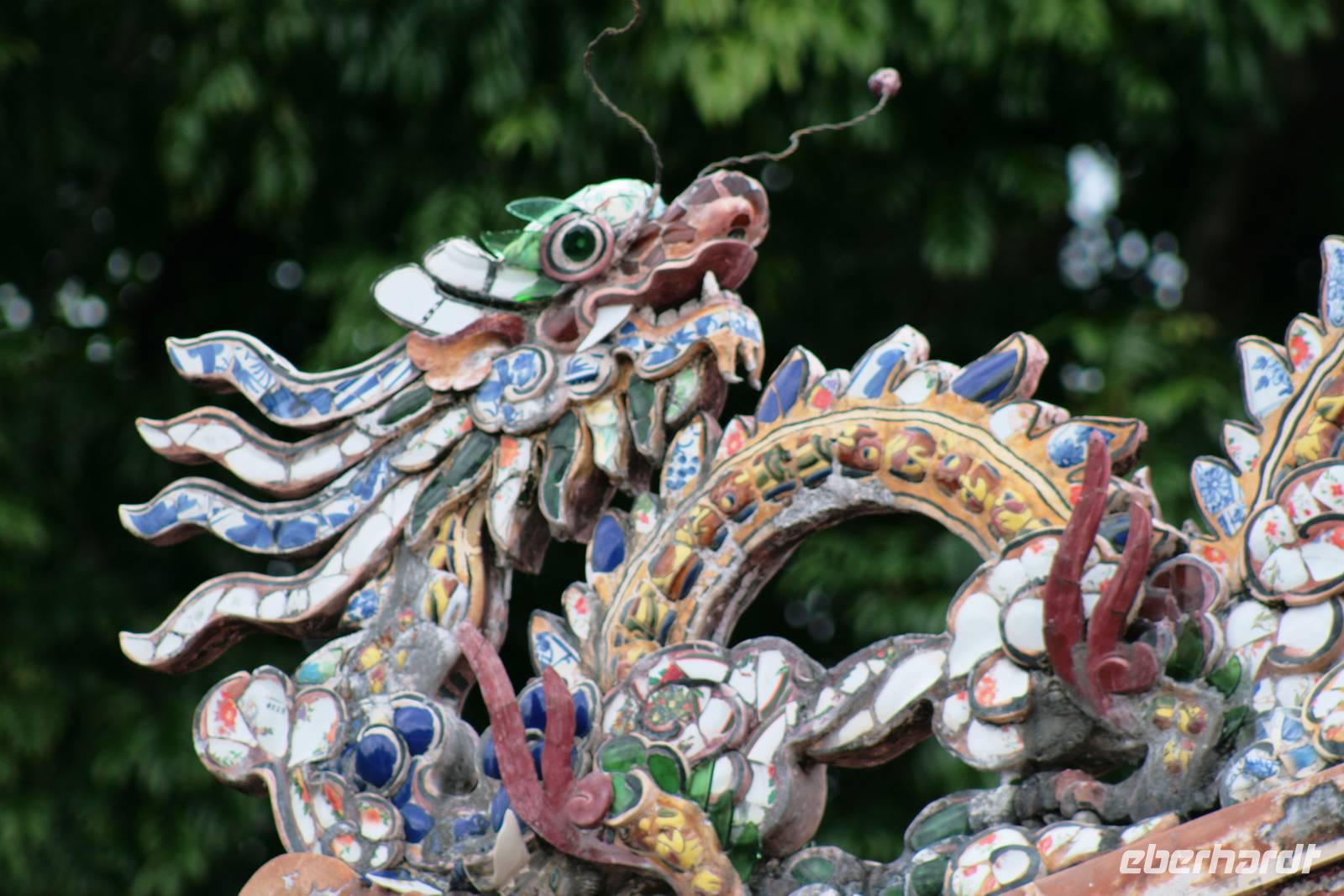 Da der Parfümfluss (Fluss der Wohlgerüche) zu viel Wasser führte, fuhren wir das kurze Stück zur Thien Mu Pagode nicht mit dem Boot, sondern mit dem Bus. Die älteste Pagode Hues wurde 1601 erbaut und der Himmelsgöttin geweiht. Unser Reiseleiter Ngoc erzählte uns viel Interessantes zur Entstehungsgeschichte und über den Buddhismus. Er besitzt ein umfangreiches Wissen und mittlerweile verstanden wir sein etwas eigenwilliges Deutsch. Der 21 m hohe, achteckige Turm mit sieben Stockwerken ragt wie ein Leuchtturm empor. Jedes der Stockwerke symbolisiert eine Inkarnation Buddhas. Fasziniert waren wir von der ca. 2 Tonnen schweren Bronzeglocke, deren Klang über 10 km weit zu hören sein soll. Die grimmig schauenden Wächter am Eingang bereiteten uns keine Angst und so betraten wir die gepflegte Anlage mit anhängendem aktiven Kloster. Mittlerweile spürten wir die für uns ungewöhnlichen Temperaturen und enorme Luftfeuchtigkeit und gingen alles langsamer an. Mit Bus fuhren wir weiter zu den eindrucksvollen Grabstätten der Viet Kaiser. Wo die Trauer lächelt, und die Freude weint - Treffender kann man die Stimmung dieser Orte kaum wiedergeben. Zunächst besichtigten wir die monumentale Grabanlage von Kaiser Kai Dinh, dem letzten Kaiser, der nur noch eine Marionette der Franzosen war. Viele europäische Einflüsse sind hier zu erkennen. Danach fuhren wir zur Grabanlage des Kaisers Minh Mang. Die großzügig angelegte Anlage in einem Park repräsentiert einen völlig anderen Baustil. Danach verliessen wir die alte Kaiserstadt. Unser heutiges Ziel war das historische Handelstädtchen Hoi An. Am stürmischen Lang Co Strand pausierten wir und stärkten uns bei gebratenen Nudeln und Bia. Nun ging es hinauf. Der Wolkenpass bildet die natürliche Grenze und Wetterscheide zwischen Nord- und Süd-Vietnam. Er ist etwa 20 Kilometer lang und erreicht 496 Meter Höhe. Der Wolkenpass machte seinem Namen wieder mal alle Ehre, aber wir hielten trotzdem am höchsten Punkt an und nahmen Abschied von Nordvietnam. Über die Nationalstraße 1 gelangten wir nach Da Nang. Hier ist Ngoc zu Hause. Da Nang ist die viertgrößte Stadt Vietnams und durch seinen Naturhafen zum Pazifischen Ozean auch eine wichtige Handelsstadt. Am Abend erreichten wir Hoi An.