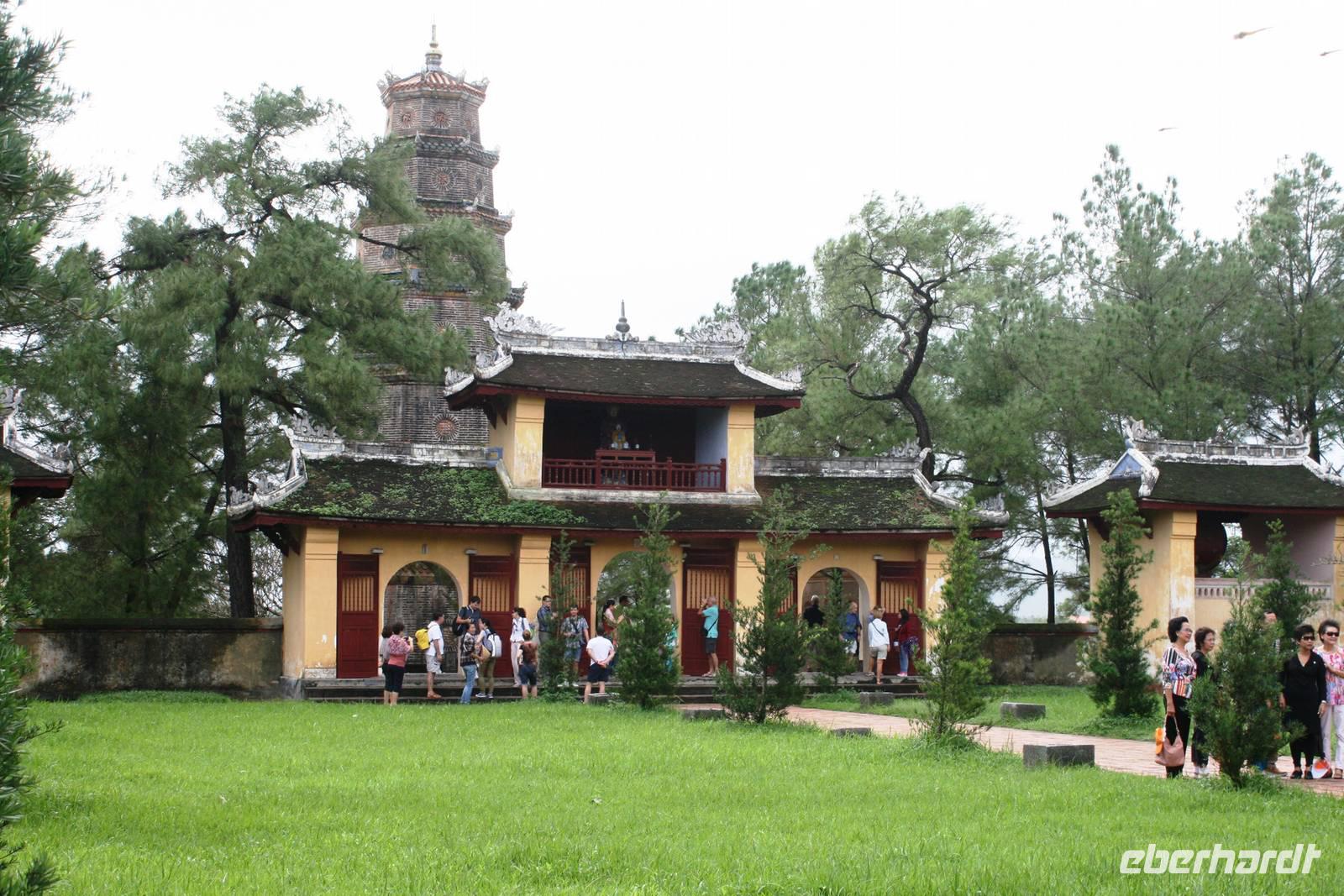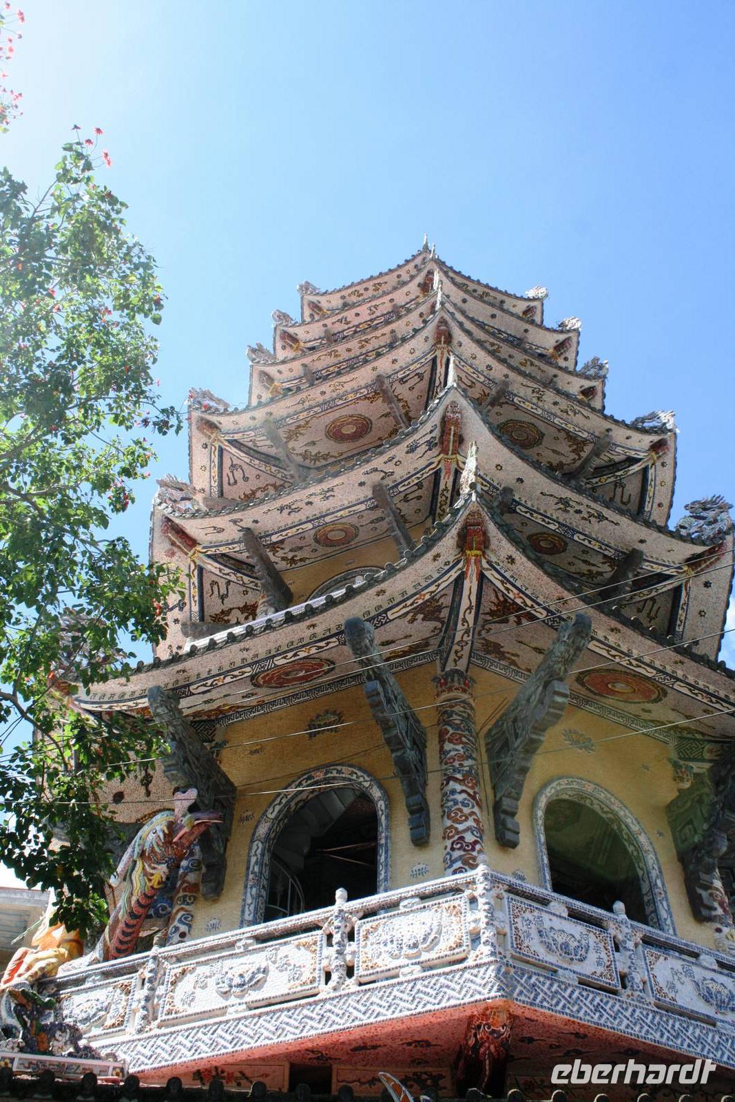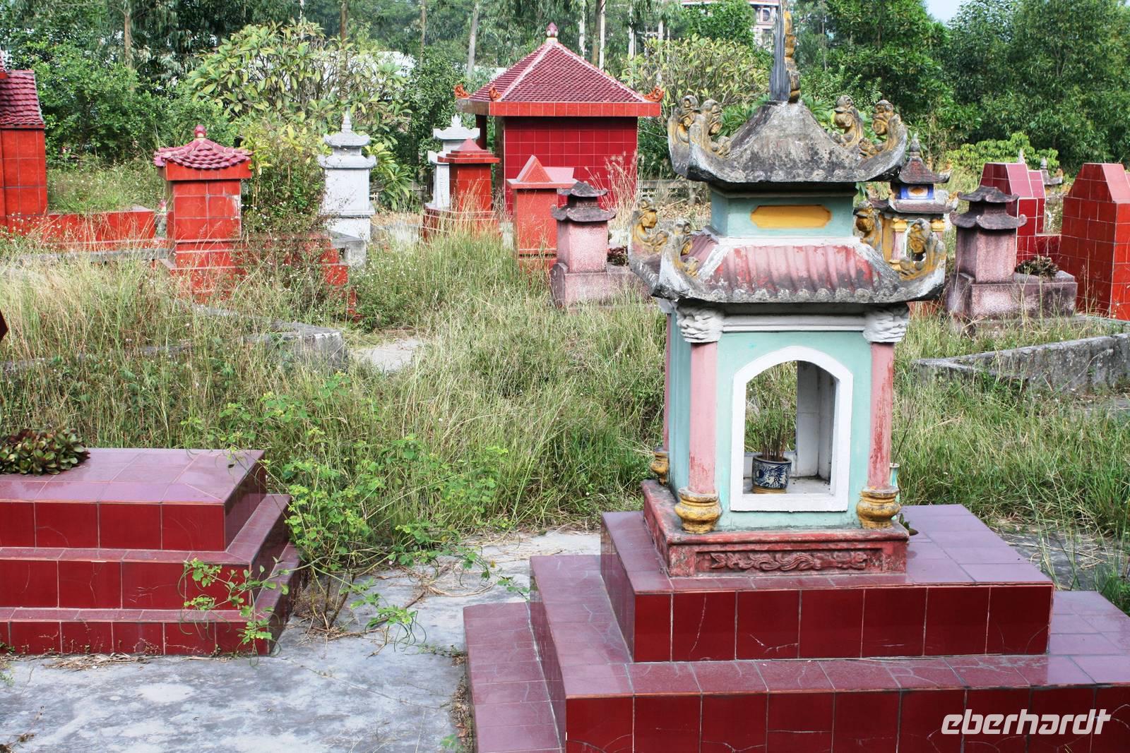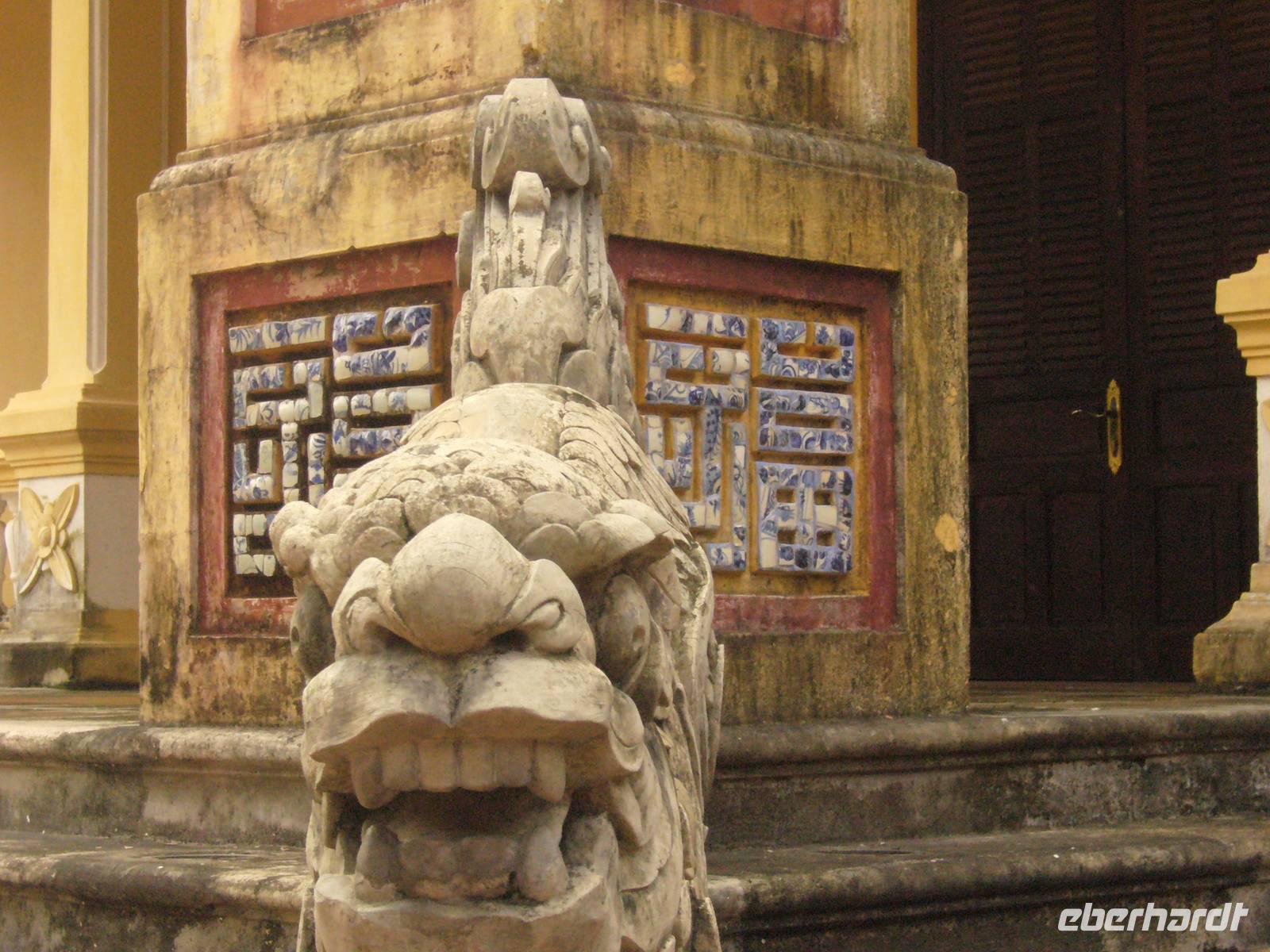 Da der Parfümfluss (Fluss der Wohlgerüche) zu viel Wasser führte, fuhren wir das kurze Stück zur Thien Mu Pagode nicht mit dem Boot, sondern mit dem Bus. Die älteste Pagode Hues wurde 1601 erbaut und der Himmelsgöttin geweiht. Unser Reiseleiter Ngoc erzählte uns viel Interessantes zur Entstehungsgeschichte und über den Buddhismus. Er besitzt ein umfangreiches Wissen und mittlerweile verstanden wir sein etwas eigenwilliges Deutsch. Der 21 m hohe, achteckige Turm mit sieben Stockwerken ragt wie ein Leuchtturm empor. Jedes der Stockwerke symbolisiert eine Inkarnation Buddhas. Fasziniert waren wir von der ca. 2 Tonnen schweren Bronzeglocke, deren Klang über 10 km weit zu hören sein soll. Die grimmig schauenden Wächter am Eingang bereiteten uns keine Angst und so betraten wir die gepflegte Anlage mit anhängendem aktiven Kloster. Mittlerweile spürten wir die für uns ungewöhnlichen Temperaturen und enorme Luftfeuchtigkeit und gingen alles langsamer an. Mit Bus fuhren wir weiter zu den eindrucksvollen Grabstätten der Viet Kaiser. Wo die Trauer lächelt, und die Freude weint - Treffender kann man die Stimmung dieser Orte kaum wiedergeben. Zunächst besichtigten wir die monumentale Grabanlage von Kaiser Kai Dinh, dem letzten Kaiser, der nur noch eine Marionette der Franzosen war. Viele europäische Einflüsse sind hier zu erkennen. Danach fuhren wir zur Grabanlage des Kaisers Minh Mang. Die großzügig angelegte Anlage in einem Park repräsentiert einen völlig anderen Baustil. Danach verliessen wir die alte Kaiserstadt. Unser heutiges Ziel war das historische Handelstädtchen Hoi An. Am stürmischen Lang Co Strand pausierten wir und stärkten uns bei gebratenen Nudeln und Bia. Nun ging es hinauf. Der Wolkenpass bildet die natürliche Grenze und Wetterscheide zwischen Nord- und Süd-Vietnam. Er ist etwa 20 Kilometer lang und erreicht 496 Meter Höhe. Der Wolkenpass machte seinem Namen wieder mal alle Ehre, aber wir hielten trotzdem am höchsten Punkt an und nahmen Abschied von Nordvietnam. Über die Nationalstraße 1 gelangten wir nach Da Nang. Hier ist Ngoc zu Hause. Da Nang ist die viertgrößte Stadt Vietnams und durch seinen Naturhafen zum Pazifischen Ozean auch eine wichtige Handelsstadt. Am Abend erreichten wir Hoi An.