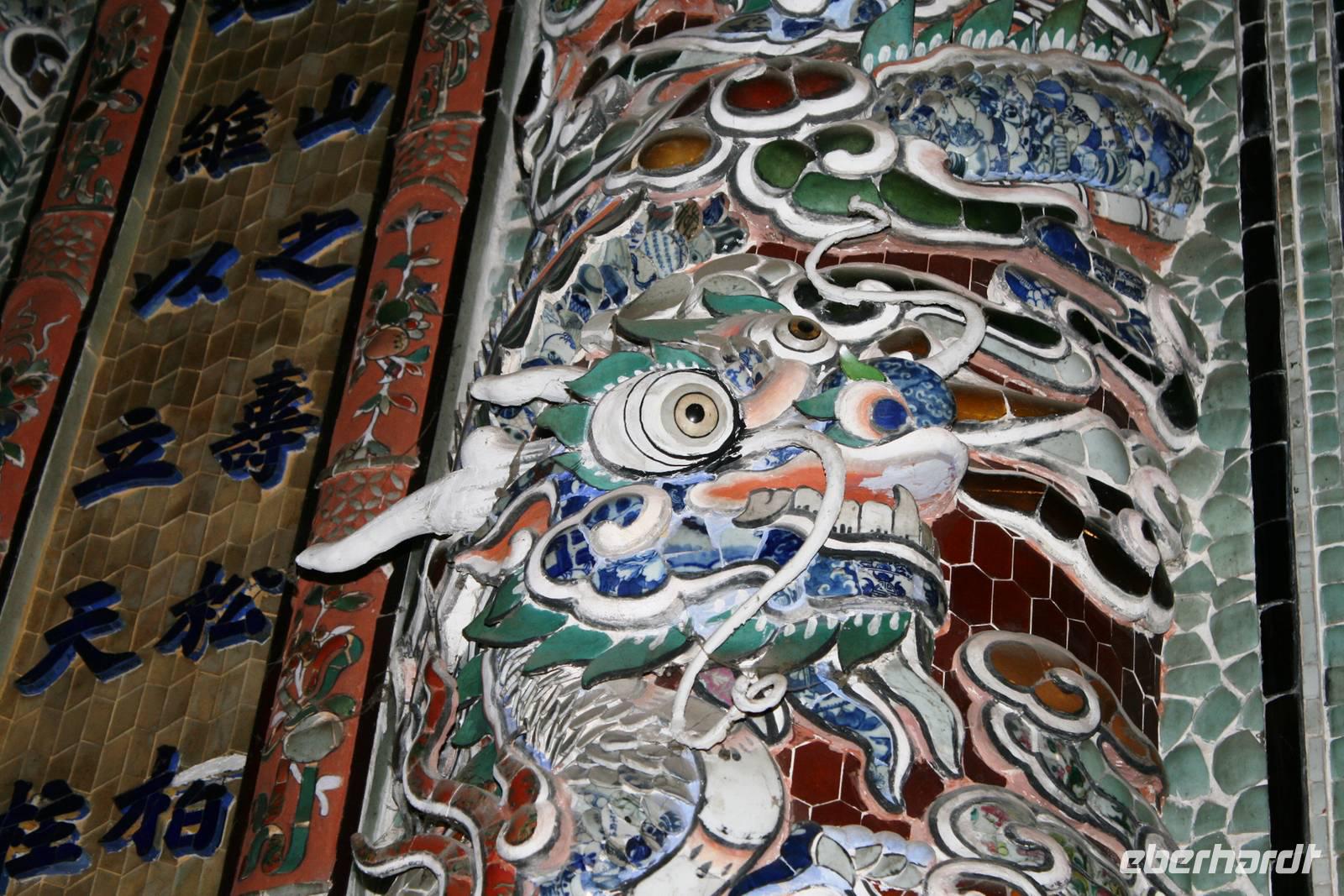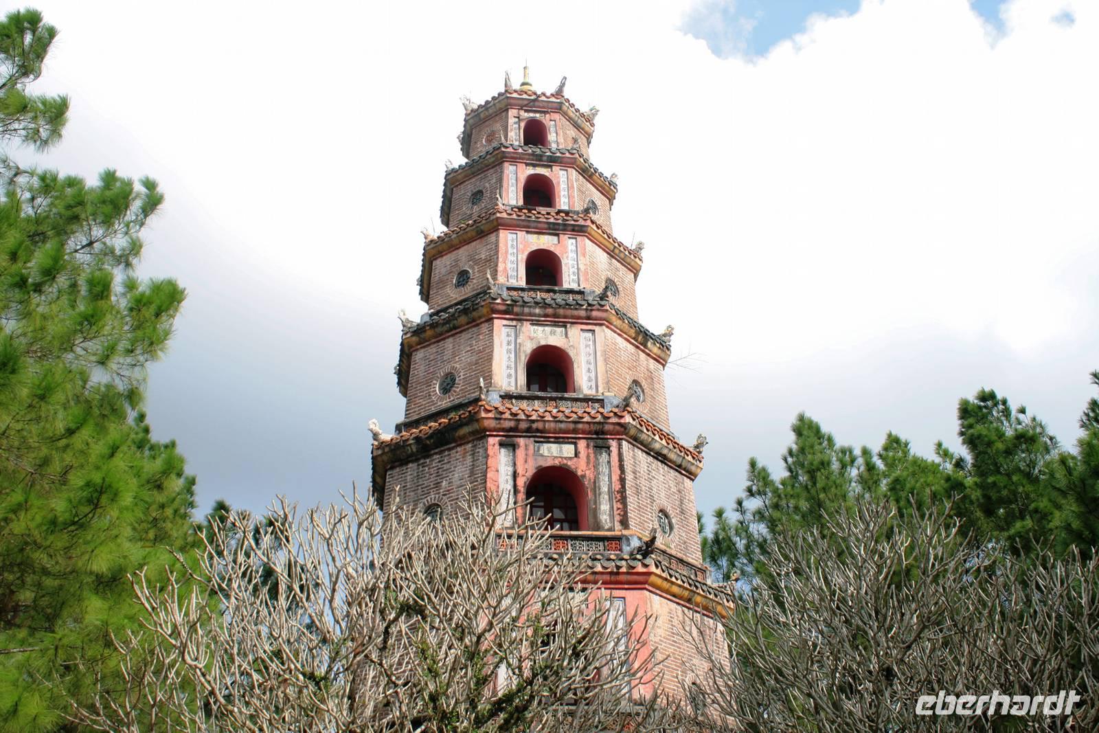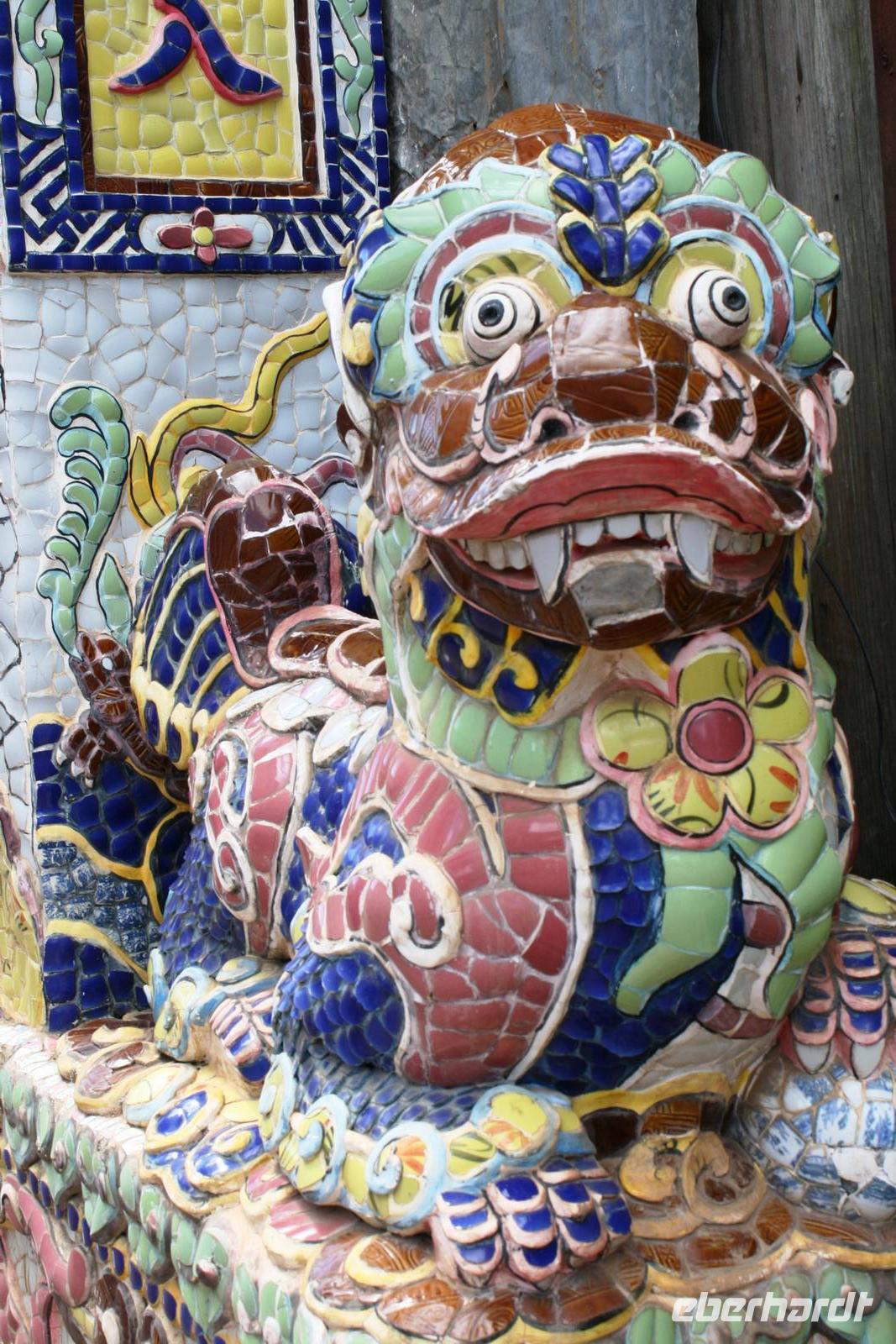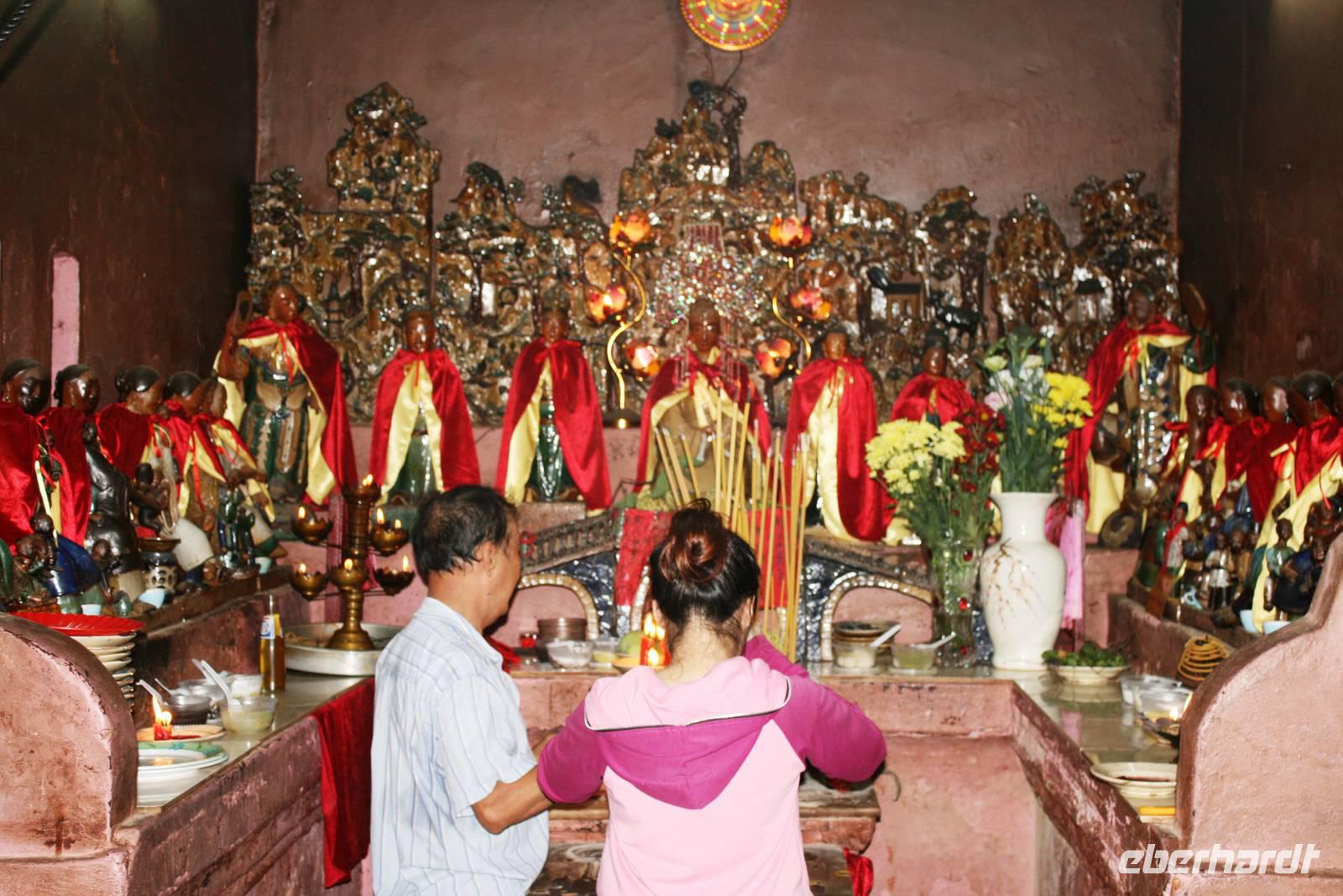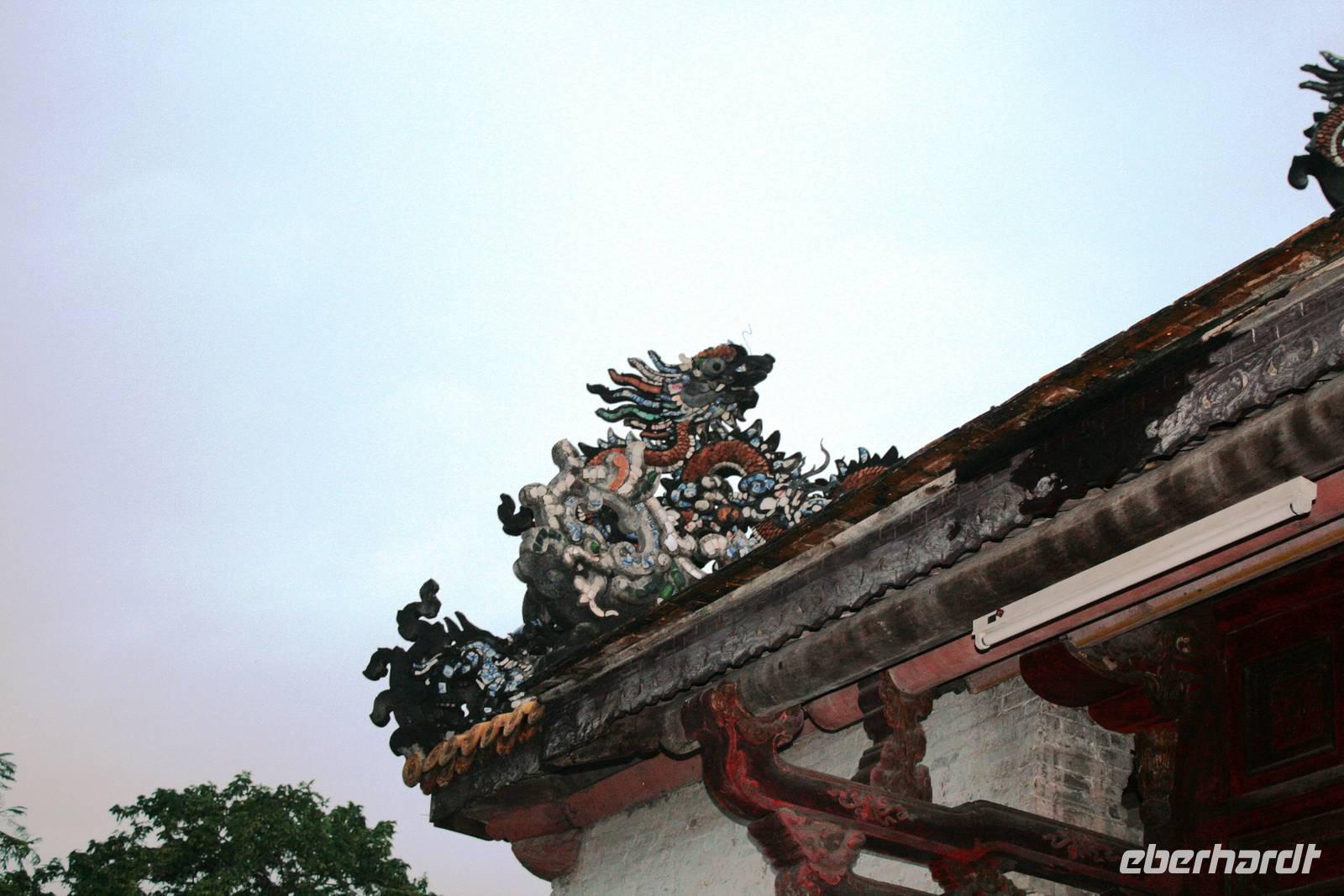 Da der Parfümfluss (Fluss der Wohlgerüche) zu viel Wasser führte, fuhren wir das kurze Stück zur Thien Mu Pagode nicht mit dem Boot, sondern mit dem Bus. Die älteste Pagode Hues wurde 1601 erbaut und der Himmelsgöttin geweiht. Unser Reiseleiter Ngoc erzählte uns viel Interessantes zur Entstehungsgeschichte und über den Buddhismus. Er besitzt ein umfangreiches Wissen und mittlerweile verstanden wir sein etwas eigenwilliges Deutsch. Der 21 m hohe, achteckige Turm mit sieben Stockwerken ragt wie ein Leuchtturm empor. Jedes der Stockwerke symbolisiert eine Inkarnation Buddhas. Fasziniert waren wir von der ca. 2 Tonnen schweren Bronzeglocke, deren Klang über 10 km weit zu hören sein soll. Die grimmig schauenden Wächter am Eingang bereiteten uns keine Angst und so betraten wir die gepflegte Anlage mit anhängendem aktiven Kloster. Mittlerweile spürten wir die für uns ungewöhnlichen Temperaturen und enorme Luftfeuchtigkeit und gingen alles langsamer an. Mit Bus fuhren wir weiter zu den eindrucksvollen Grabstätten der Viet Kaiser. Wo die Trauer lächelt, und die Freude weint - Treffender kann man die Stimmung dieser Orte kaum wiedergeben. Zunächst besichtigten wir die monumentale Grabanlage von Kaiser Kai Dinh, dem letzten Kaiser, der nur noch eine Marionette der Franzosen war. Viele europäische Einflüsse sind hier zu erkennen. Danach fuhren wir zur Grabanlage des Kaisers Minh Mang. Die großzügig angelegte Anlage in einem Park repräsentiert einen völlig anderen Baustil. Danach verliessen wir die alte Kaiserstadt. Unser heutiges Ziel war das historische Handelstädtchen Hoi An. Am stürmischen Lang Co Strand pausierten wir und stärkten uns bei gebratenen Nudeln und Bia. Nun ging es hinauf. Der Wolkenpass bildet die natürliche Grenze und Wetterscheide zwischen Nord- und Süd-Vietnam. Er ist etwa 20 Kilometer lang und erreicht 496 Meter Höhe. Der Wolkenpass machte seinem Namen wieder mal alle Ehre, aber wir hielten trotzdem am höchsten Punkt an und nahmen Abschied von Nordvietnam. Über die Nationalstraße 1 gelangten wir nach Da Nang. Hier ist Ngoc zu Hause. Da Nang ist die viertgrößte Stadt Vietnams und durch seinen Naturhafen zum Pazifischen Ozean auch eine wichtige Handelsstadt. Am Abend erreichten wir Hoi An.