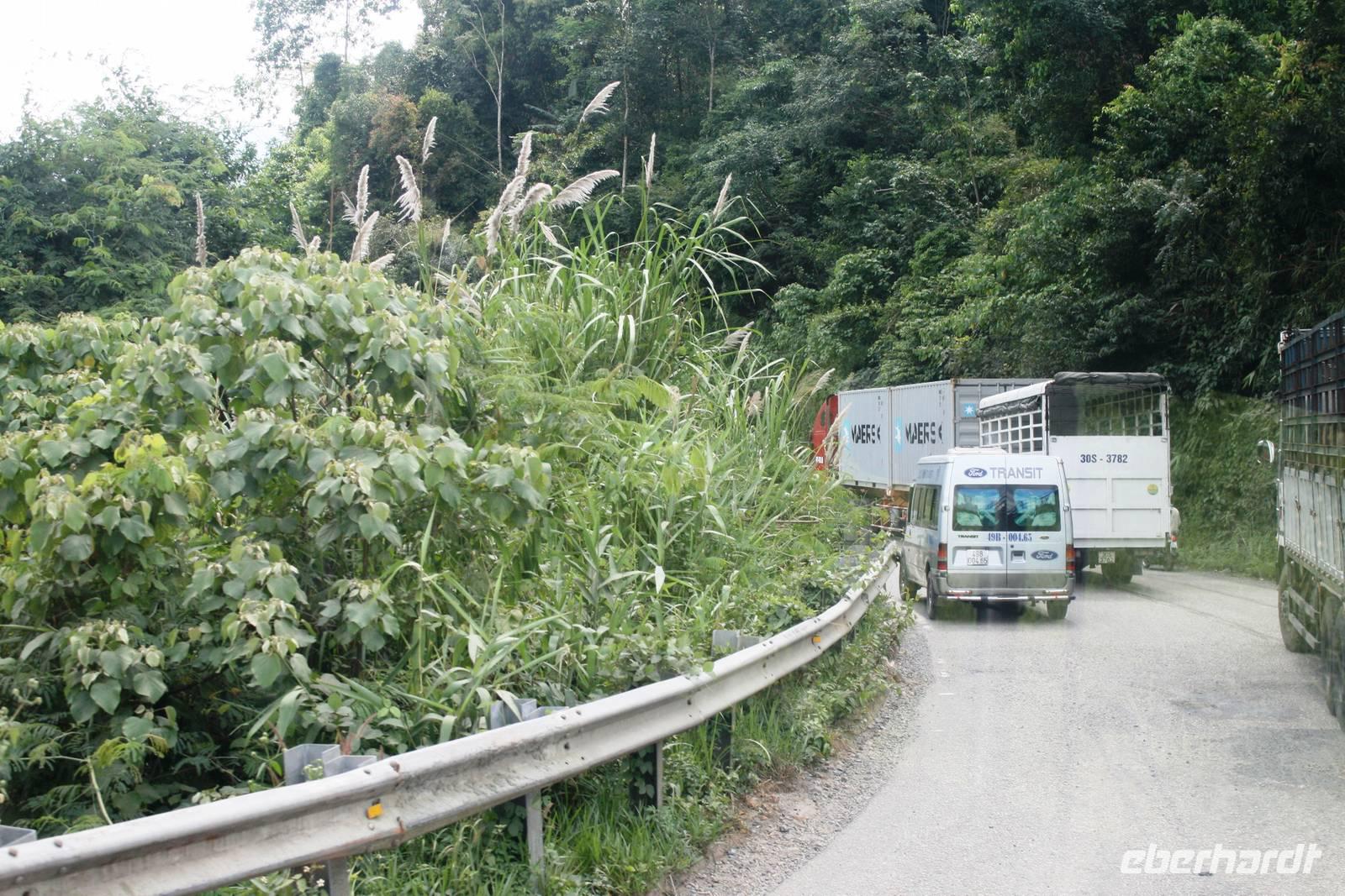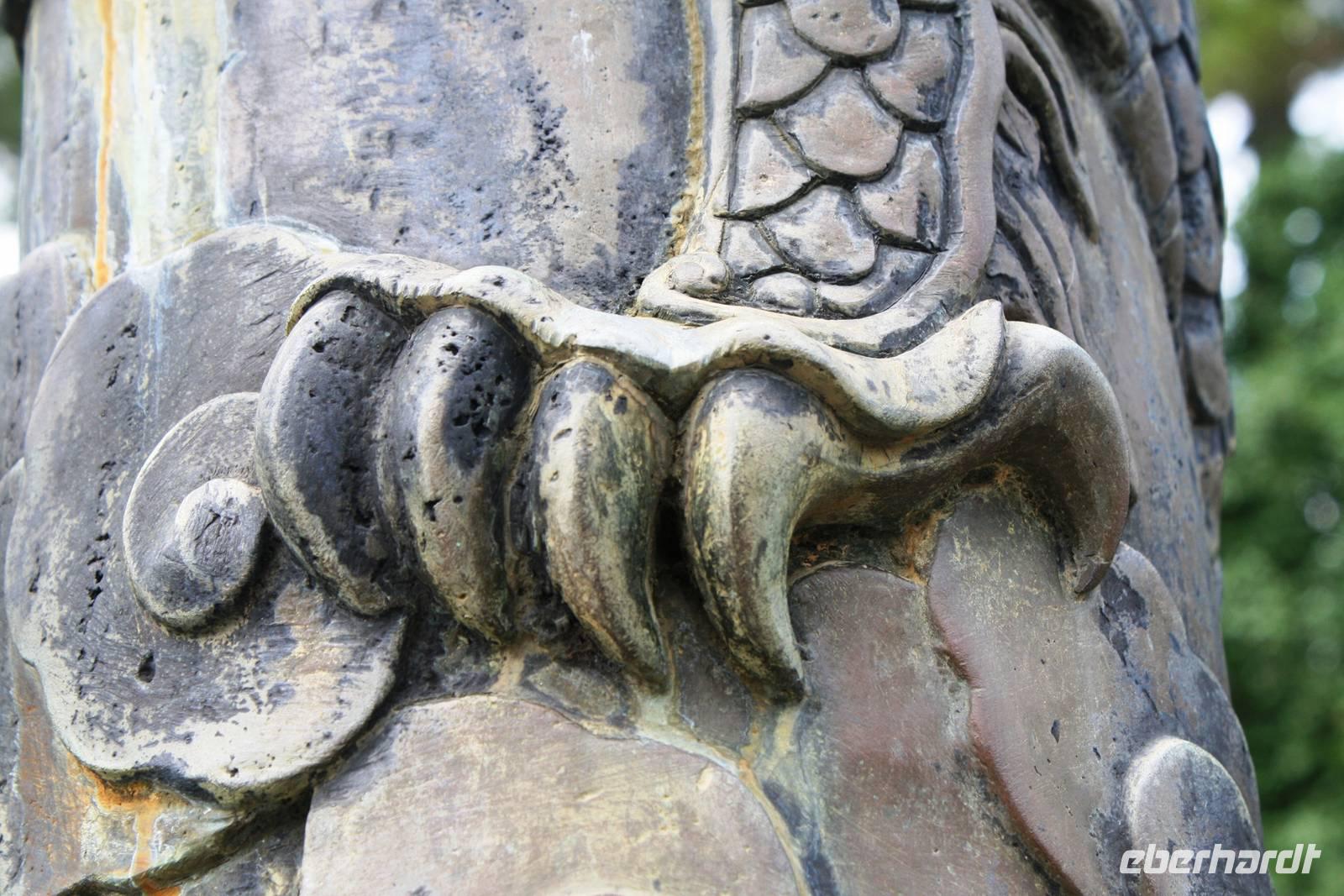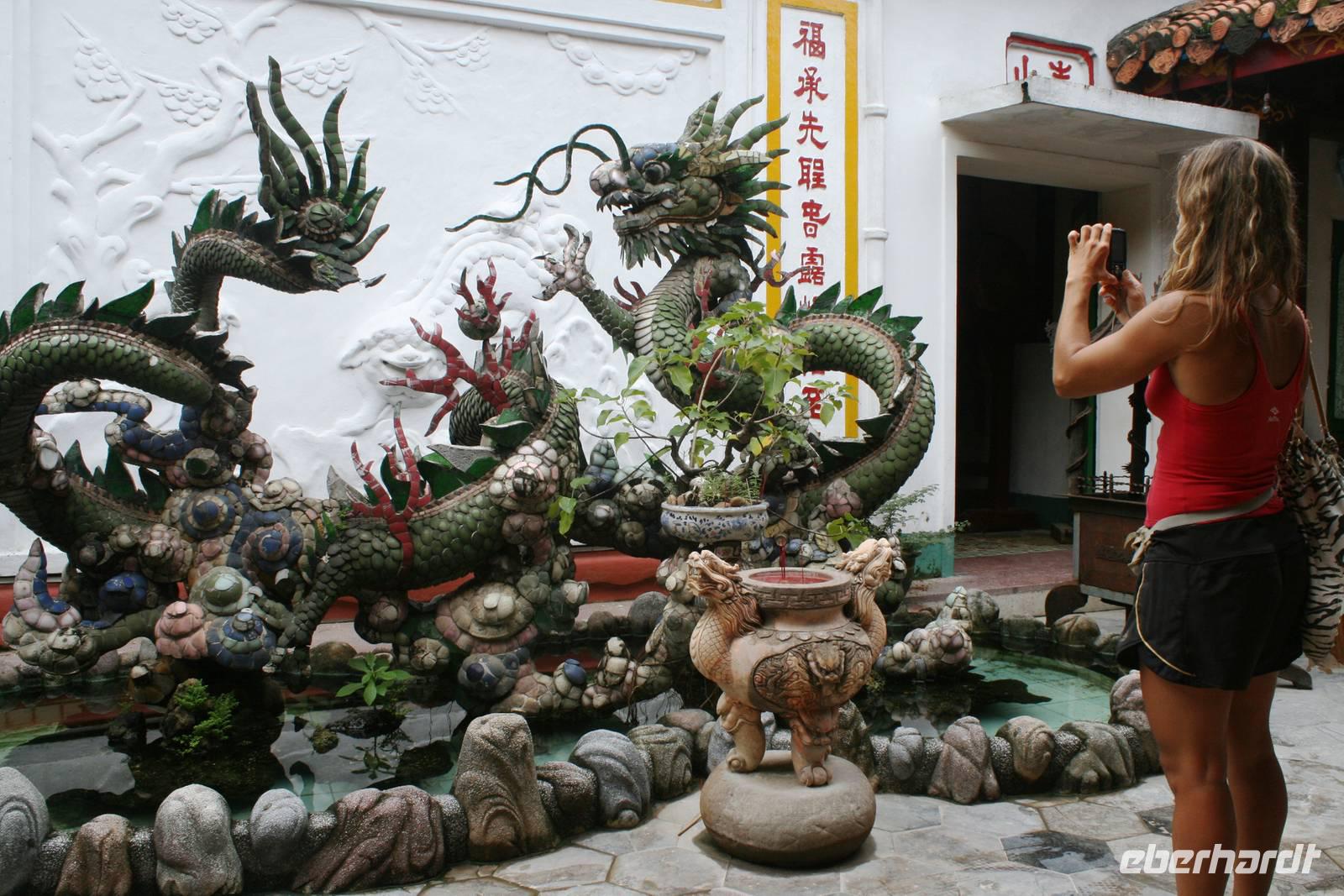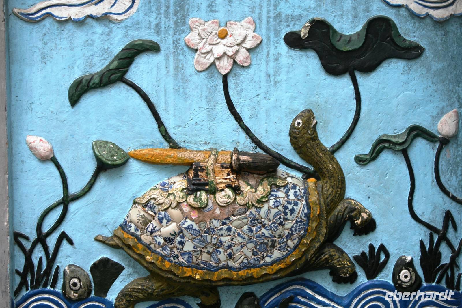 Da der Parfümfluss (Fluss der Wohlgerüche) zu viel Wasser führte, fuhren wir das kurze Stück zur Thien Mu Pagode nicht mit dem Boot, sondern mit dem Bus. Die älteste Pagode Hues wurde 1601 erbaut und der Himmelsgöttin geweiht. Unser Reiseleiter Ngoc erzählte uns viel Interessantes zur Entstehungsgeschichte und über den Buddhismus. Er besitzt ein umfangreiches Wissen und mittlerweile verstanden wir sein etwas eigenwilliges Deutsch. Der 21 m hohe, achteckige Turm mit sieben Stockwerken ragt wie ein Leuchtturm empor. Jedes der Stockwerke symbolisiert eine Inkarnation Buddhas. Fasziniert waren wir von der ca. 2 Tonnen schweren Bronzeglocke, deren Klang über 10 km weit zu hören sein soll. Die grimmig schauenden Wächter am Eingang bereiteten uns keine Angst und so betraten wir die gepflegte Anlage mit anhängendem aktiven Kloster. Mittlerweile spürten wir die für uns ungewöhnlichen Temperaturen und enorme Luftfeuchtigkeit und gingen alles langsamer an. Mit Bus fuhren wir weiter zu den eindrucksvollen Grabstätten der Viet Kaiser. Wo die Trauer lächelt, und die Freude weint - Treffender kann man die Stimmung dieser Orte kaum wiedergeben. Zunächst besichtigten wir die monumentale Grabanlage von Kaiser Kai Dinh, dem letzten Kaiser, der nur noch eine Marionette der Franzosen war. Viele europäische Einflüsse sind hier zu erkennen. Danach fuhren wir zur Grabanlage des Kaisers Minh Mang. Die großzügig angelegte Anlage in einem Park repräsentiert einen völlig anderen Baustil. Danach verliessen wir die alte Kaiserstadt. Unser heutiges Ziel war das historische Handelstädtchen Hoi An. Am stürmischen Lang Co Strand pausierten wir und stärkten uns bei gebratenen Nudeln und Bia. Nun ging es hinauf. Der Wolkenpass bildet die natürliche Grenze und Wetterscheide zwischen Nord- und Süd-Vietnam. Er ist etwa 20 Kilometer lang und erreicht 496 Meter Höhe. Der Wolkenpass machte seinem Namen wieder mal alle Ehre, aber wir hielten trotzdem am höchsten Punkt an und nahmen Abschied von Nordvietnam. Über die Nationalstraße 1 gelangten wir nach Da Nang. Hier ist Ngoc zu Hause. Da Nang ist die viertgrößte Stadt Vietnams und durch seinen Naturhafen zum Pazifischen Ozean auch eine wichtige Handelsstadt. Am Abend erreichten wir Hoi An.