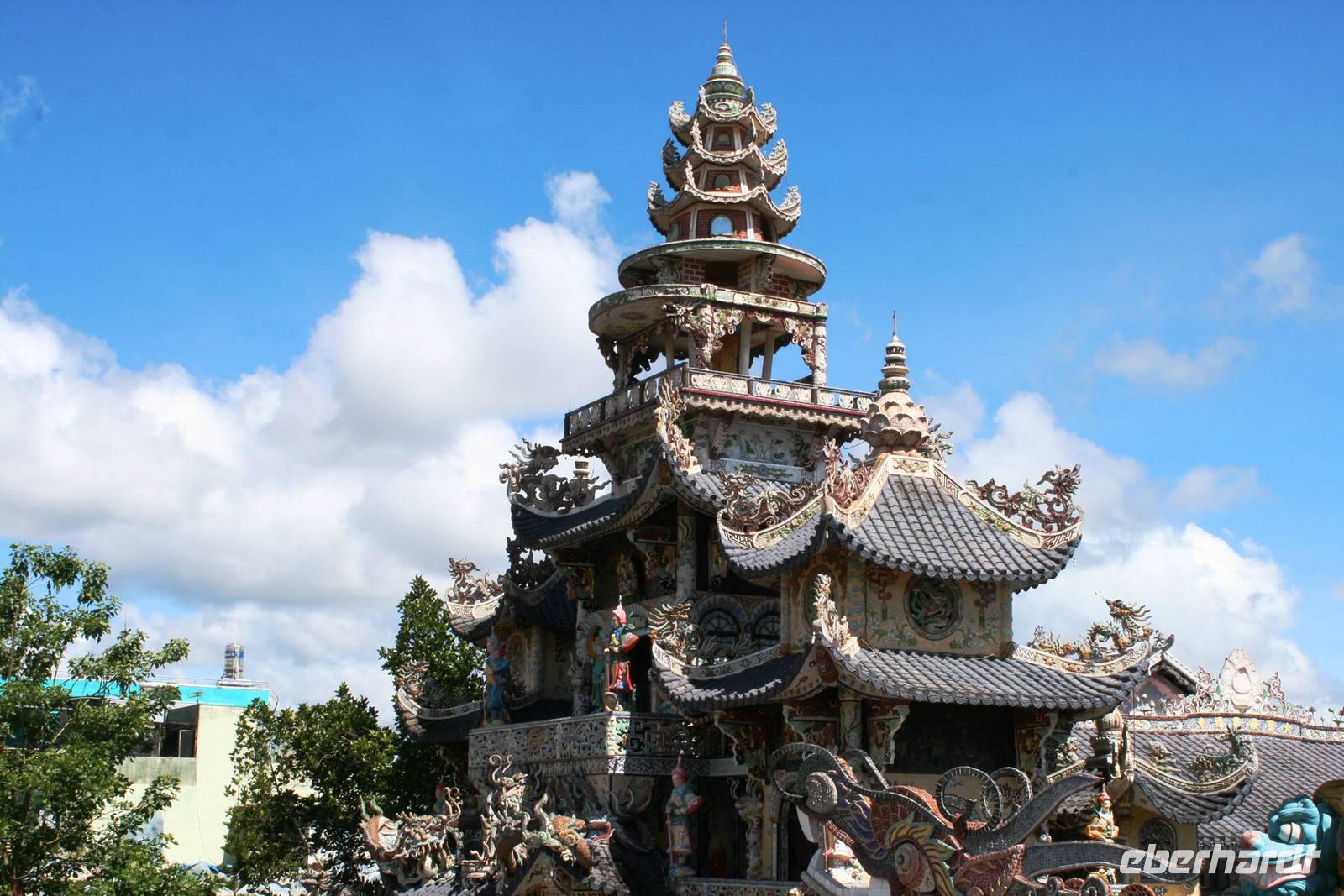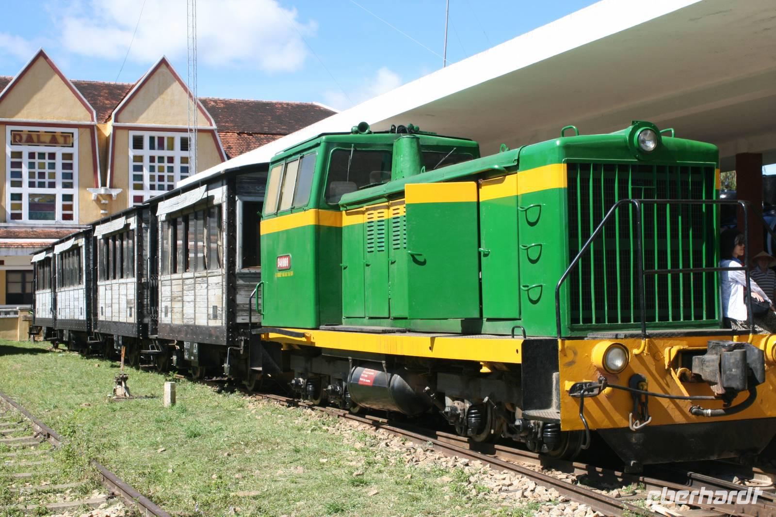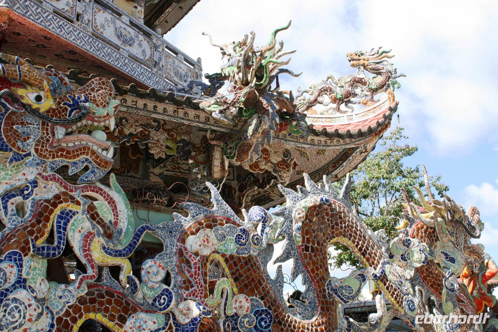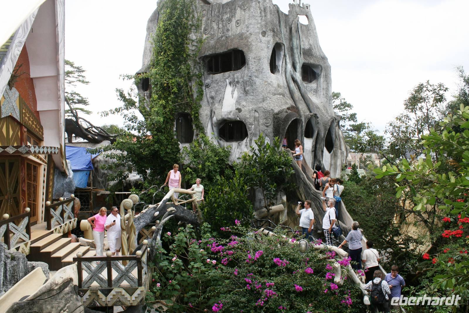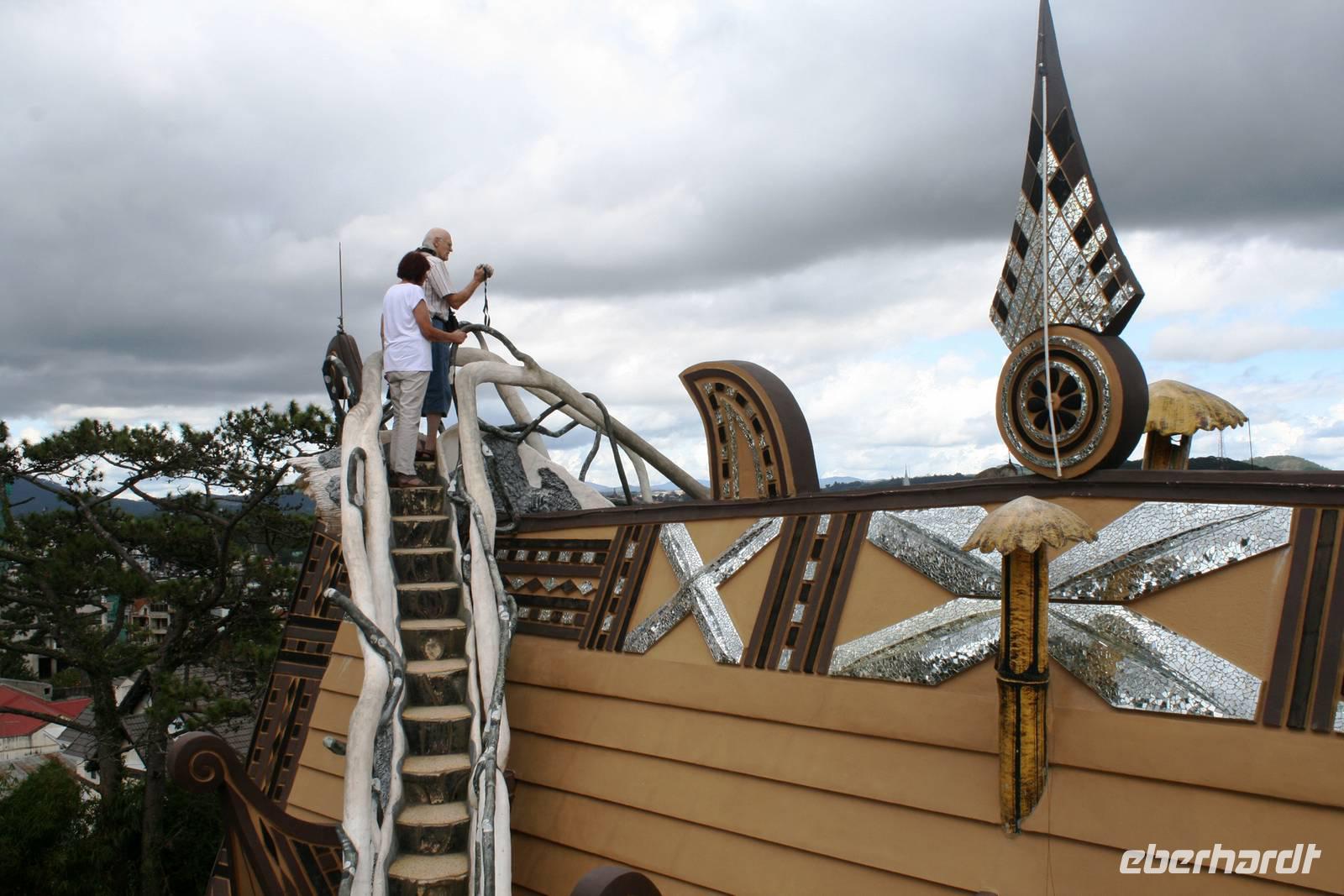 Nach einem begeisterten Frühstück begrüßte uns Huong mit Mütze und Schal. Bei 22° C am Morgen war ihr noch kalt. Wir mußten lachen. Mit dem Bus fuhren wir zum Bahnhof. Eigentlich hatten wir keine Lust mehr auf Zug fahren, aber die Eisenbahnfahrt in historischen Wagons wurde ein entspannendes Erlebnis. Die Bahnlinie zwischen Saigon und Da Lat wurde 1930 gebaut und ist heute größtenteils stillgelegt. Vorbei an Siedlungen, unzähligen Gewächshäusern, Erdbeerplantagen und riesigen Weihnachtssternstauden, die schon an das bevorstehende Fest erinnern, zuckelte die Eisenbahn ein kleines Stück zum Örtchen Trai Mat. Von hier bummelten wir zur Linh Phuoc Pagode, die erst in den 60er erbaut wurde. Bunte Mosaike aus Keramikscherben, überladende Ornamente, überdimensionale Statuen soweit unsere Augen blicken konnten. Beeindruckend und faszinierend, aber es ähnelte eher einem buddhistischen Jahrmarkt. Auf dem Rückweg zum Zug winkten uns fröhliche Schulkinder zu. Sie waren bestimmt so gut gelaunt, weil die Schule zu Ende war. Von Huong erfuhren wir, dass in Vietnam Schulpflicht besteht und Schuluniformen getragen werden. Aufgrund der Massen von Schülern wird an den Schulen sowohl vormittags als auch nachmittags unterrichtet. Nach einem Zwischenstopp am Happy House besichtigten wir den ehemaligen Sommerpalast des letzten Kaisers. Ein Hauch von Art Deko begleitete uns beim Rundgang durch die "Gemächer". Anschließend überraschten wir die Eberhardt Gäste mit dem Besuch des Crazy Houses. Hier hat die exzentrische Besitzerin Hang Nga (Tochter des ehemaligen Ministerpräsidenten) ihrer Fantasie ungezügelten Lauf gelassen und ein skurriles Gebäudekunstwerk entstehen lassen, welches noch lange nicht fertig ist. Wer will, kann hier auch im Kürbis- oder Spinnenzimmer übernachten. Wir waren uns einig, der Besuch des asiatischen "Hundertwasserhauses" war ein außergewöhnliches Erlebnis. Beim anschließenden Spaziergang durch die wunderschöne, bunte Anlage des Blumengartens fing es leider zu regnen an. Am Nachmittag genossen alle ihre Freizeit, durchstöberten den lokalen Markt auf der Suche nach Trockenfrüchten, kandierten Ingwer sowie Da Lat Wein und verweilten in einem der kleinen Cafes bei einem starken Kaffee und leckerer Pho Suppe. Am Abend gab es eine weitere, leckere Spezialität: Flambierte Bananen. Bei der Zubereitung wurde es unserem sympathischen Kellner spürbar heiss!