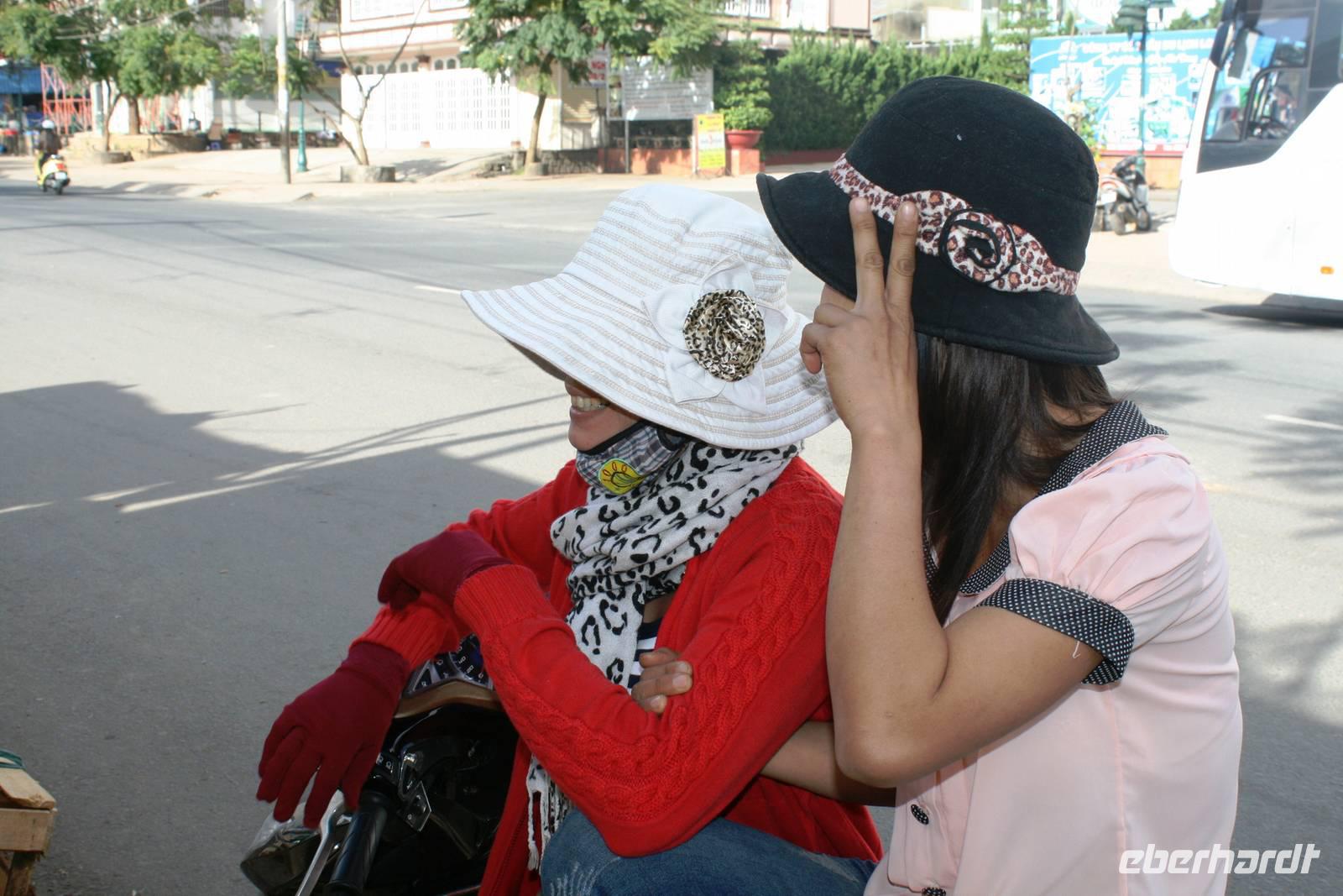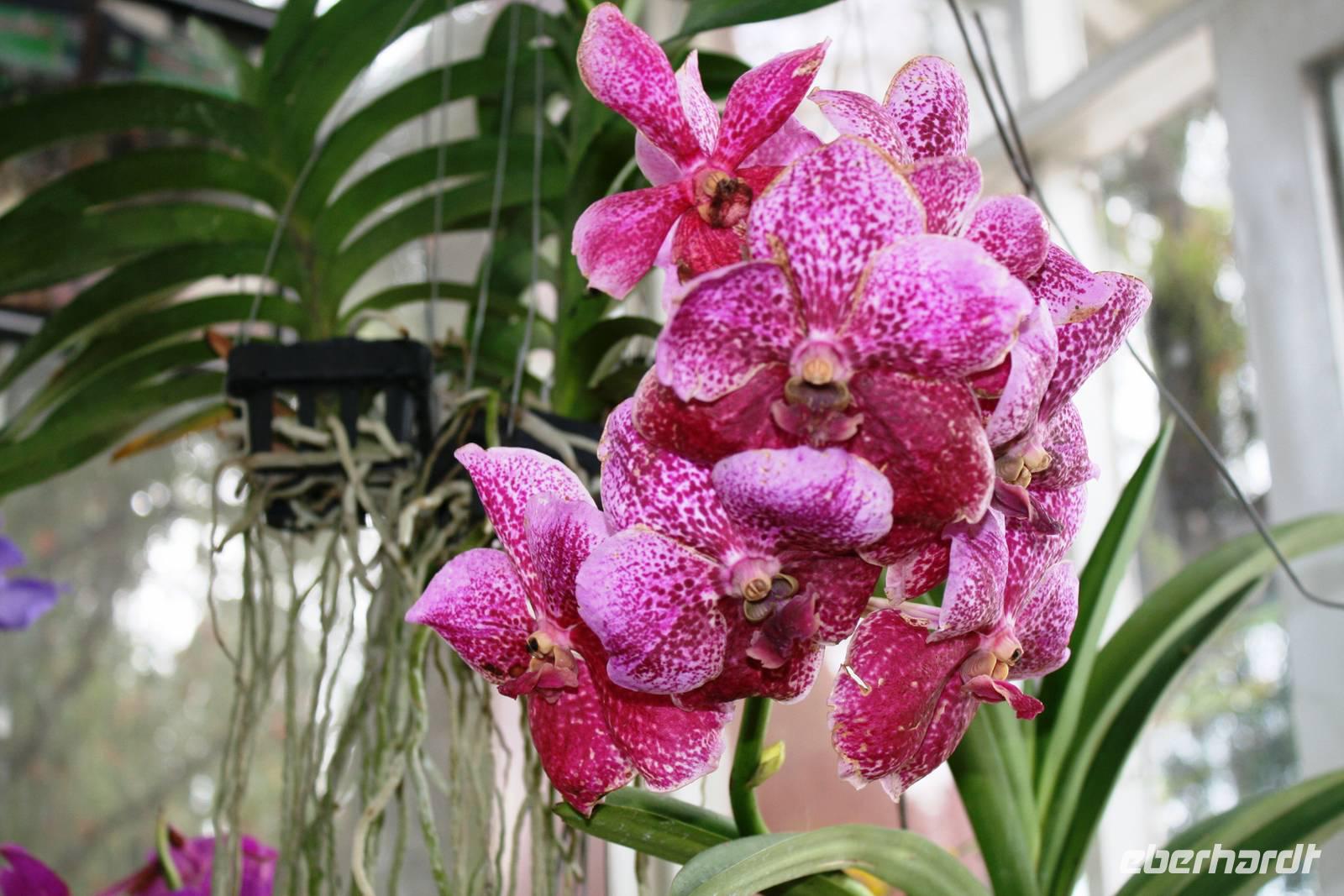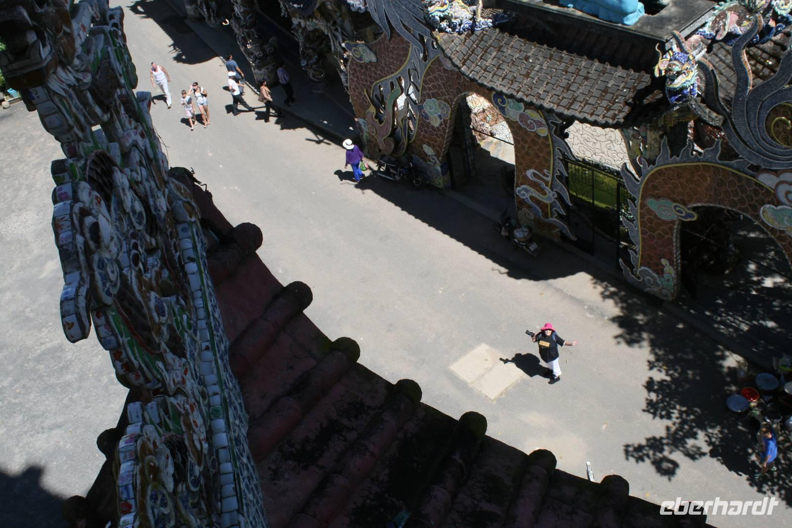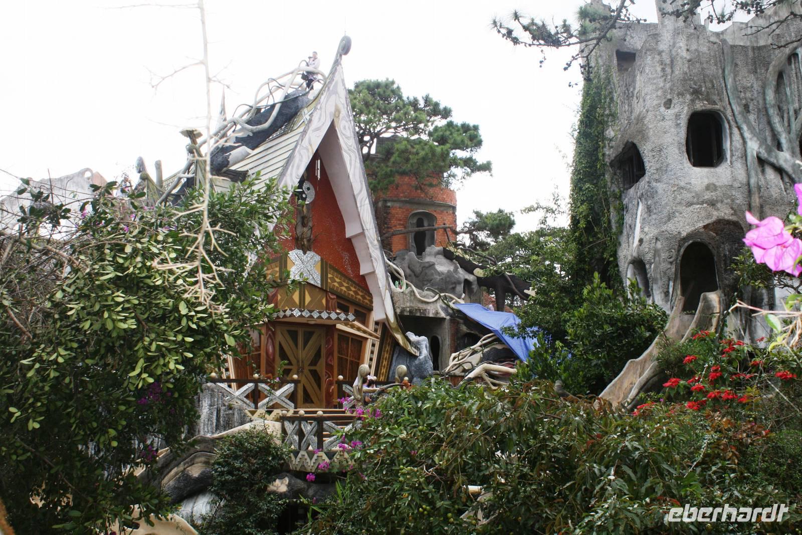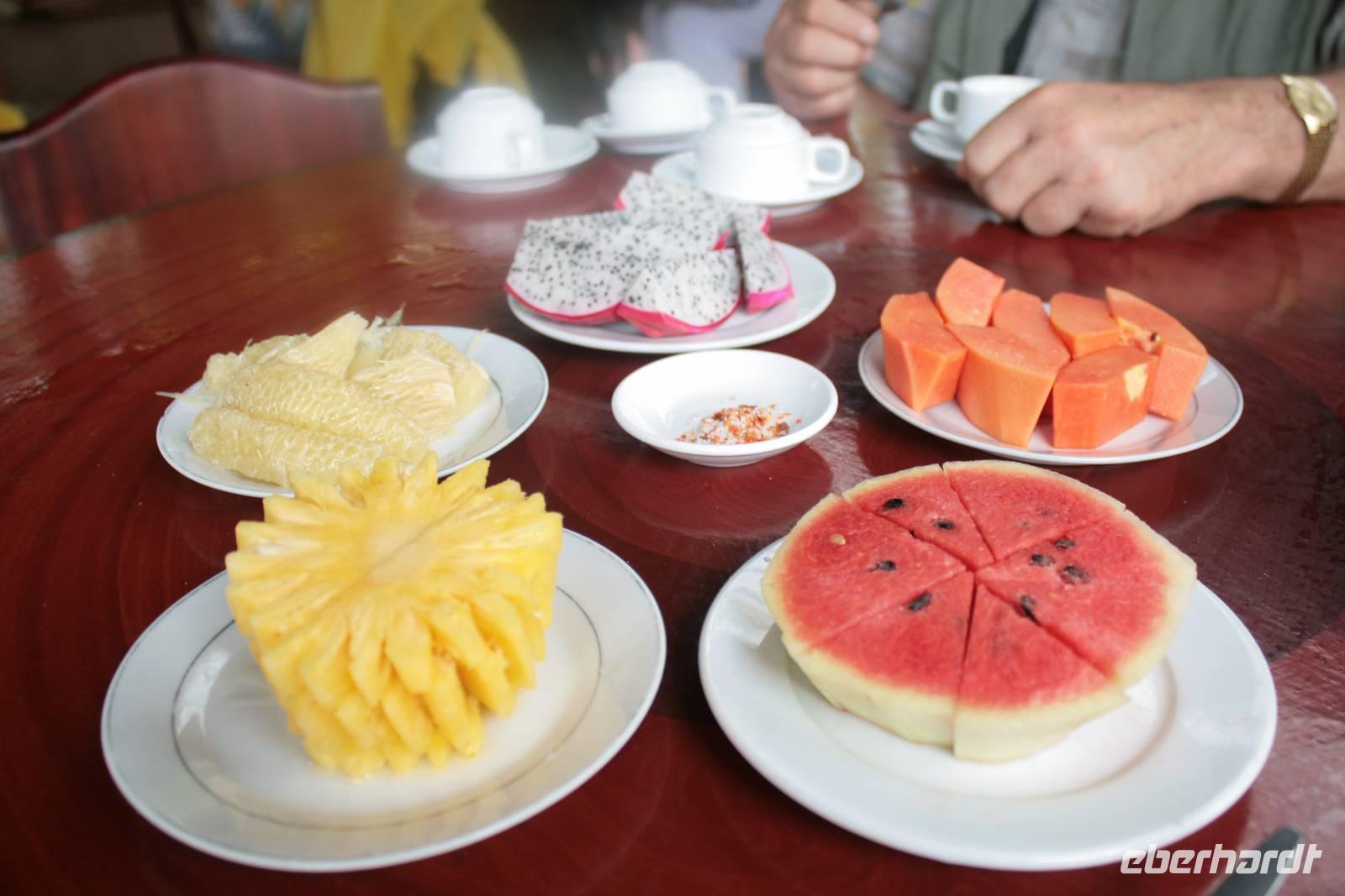 Nach einem begeisterten Frühstück begrüßte uns Huong mit Mütze und Schal. Bei 22° C am Morgen war ihr noch kalt. Wir mußten lachen. Mit dem Bus fuhren wir zum Bahnhof. Eigentlich hatten wir keine Lust mehr auf Zug fahren, aber die Eisenbahnfahrt in historischen Wagons wurde ein entspannendes Erlebnis. Die Bahnlinie zwischen Saigon und Da Lat wurde 1930 gebaut und ist heute größtenteils stillgelegt. Vorbei an Siedlungen, unzähligen Gewächshäusern, Erdbeerplantagen und riesigen Weihnachtssternstauden, die schon an das bevorstehende Fest erinnern, zuckelte die Eisenbahn ein kleines Stück zum Örtchen Trai Mat. Von hier bummelten wir zur Linh Phuoc Pagode, die erst in den 60er erbaut wurde. Bunte Mosaike aus Keramikscherben, überladende Ornamente, überdimensionale Statuen soweit unsere Augen blicken konnten. Beeindruckend und faszinierend, aber es ähnelte eher einem buddhistischen Jahrmarkt. Auf dem Rückweg zum Zug winkten uns fröhliche Schulkinder zu. Sie waren bestimmt so gut gelaunt, weil die Schule zu Ende war. Von Huong erfuhren wir, dass in Vietnam Schulpflicht besteht und Schuluniformen getragen werden. Aufgrund der Massen von Schülern wird an den Schulen sowohl vormittags als auch nachmittags unterrichtet. Nach einem Zwischenstopp am Happy House besichtigten wir den ehemaligen Sommerpalast des letzten Kaisers. Ein Hauch von Art Deko begleitete uns beim Rundgang durch die "Gemächer". Anschließend überraschten wir die Eberhardt Gäste mit dem Besuch des Crazy Houses. Hier hat die exzentrische Besitzerin Hang Nga (Tochter des ehemaligen Ministerpräsidenten) ihrer Fantasie ungezügelten Lauf gelassen und ein skurriles Gebäudekunstwerk entstehen lassen, welches noch lange nicht fertig ist. Wer will, kann hier auch im Kürbis- oder Spinnenzimmer übernachten. Wir waren uns einig, der Besuch des asiatischen "Hundertwasserhauses" war ein außergewöhnliches Erlebnis. Beim anschließenden Spaziergang durch die wunderschöne, bunte Anlage des Blumengartens fing es leider zu regnen an. Am Nachmittag genossen alle ihre Freizeit, durchstöberten den lokalen Markt auf der Suche nach Trockenfrüchten, kandierten Ingwer sowie Da Lat Wein und verweilten in einem der kleinen Cafes bei einem starken Kaffee und leckerer Pho Suppe. Am Abend gab es eine weitere, leckere Spezialität: Flambierte Bananen. Bei der Zubereitung wurde es unserem sympathischen Kellner spürbar heiss!