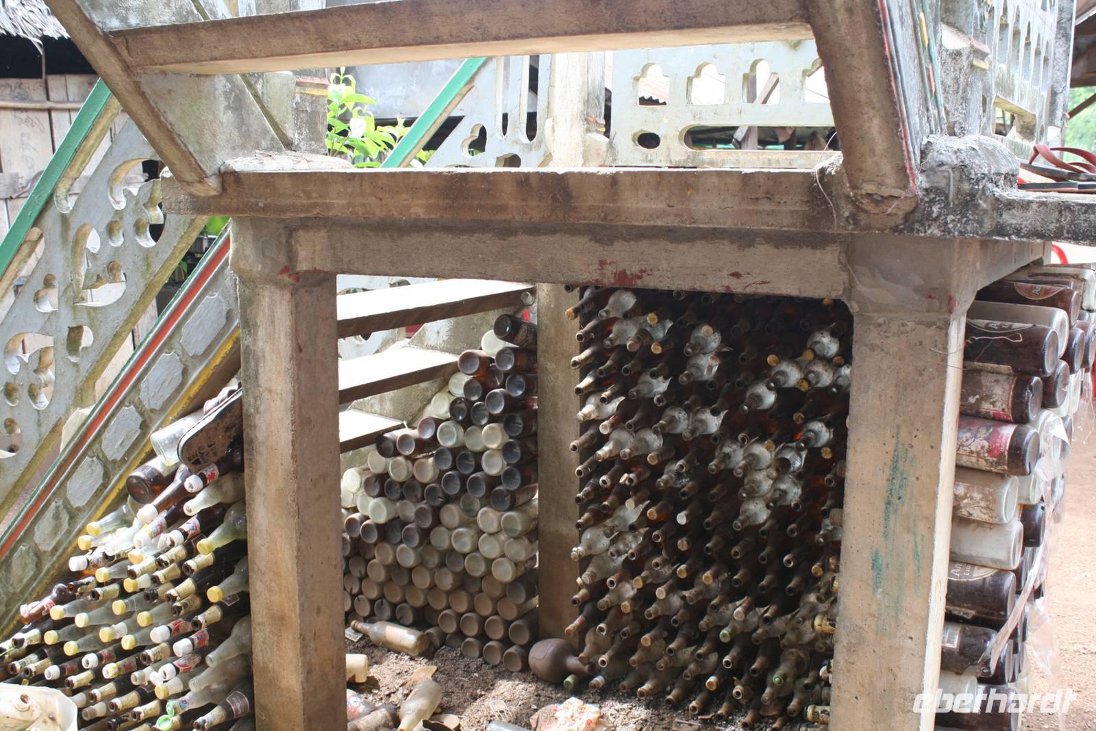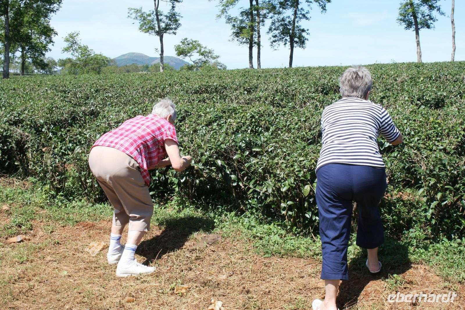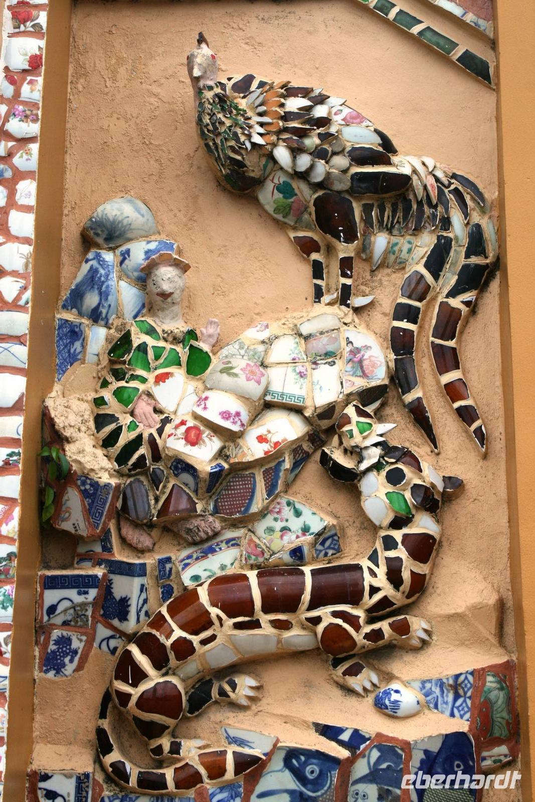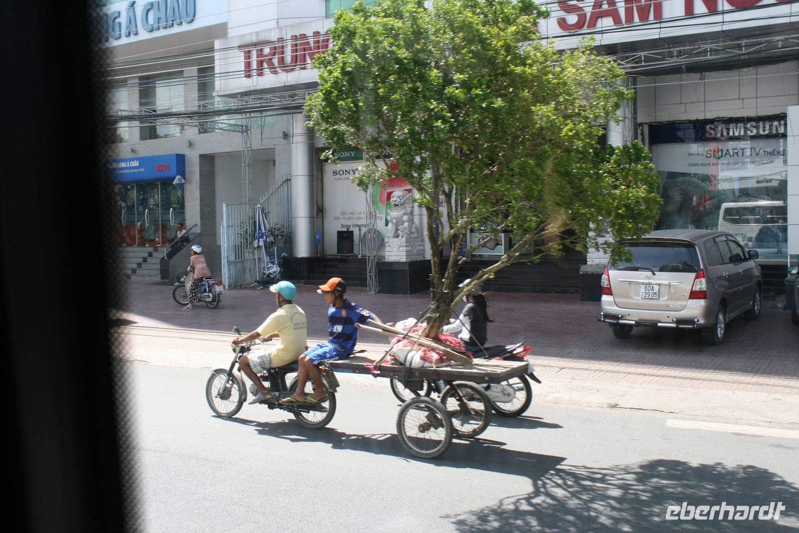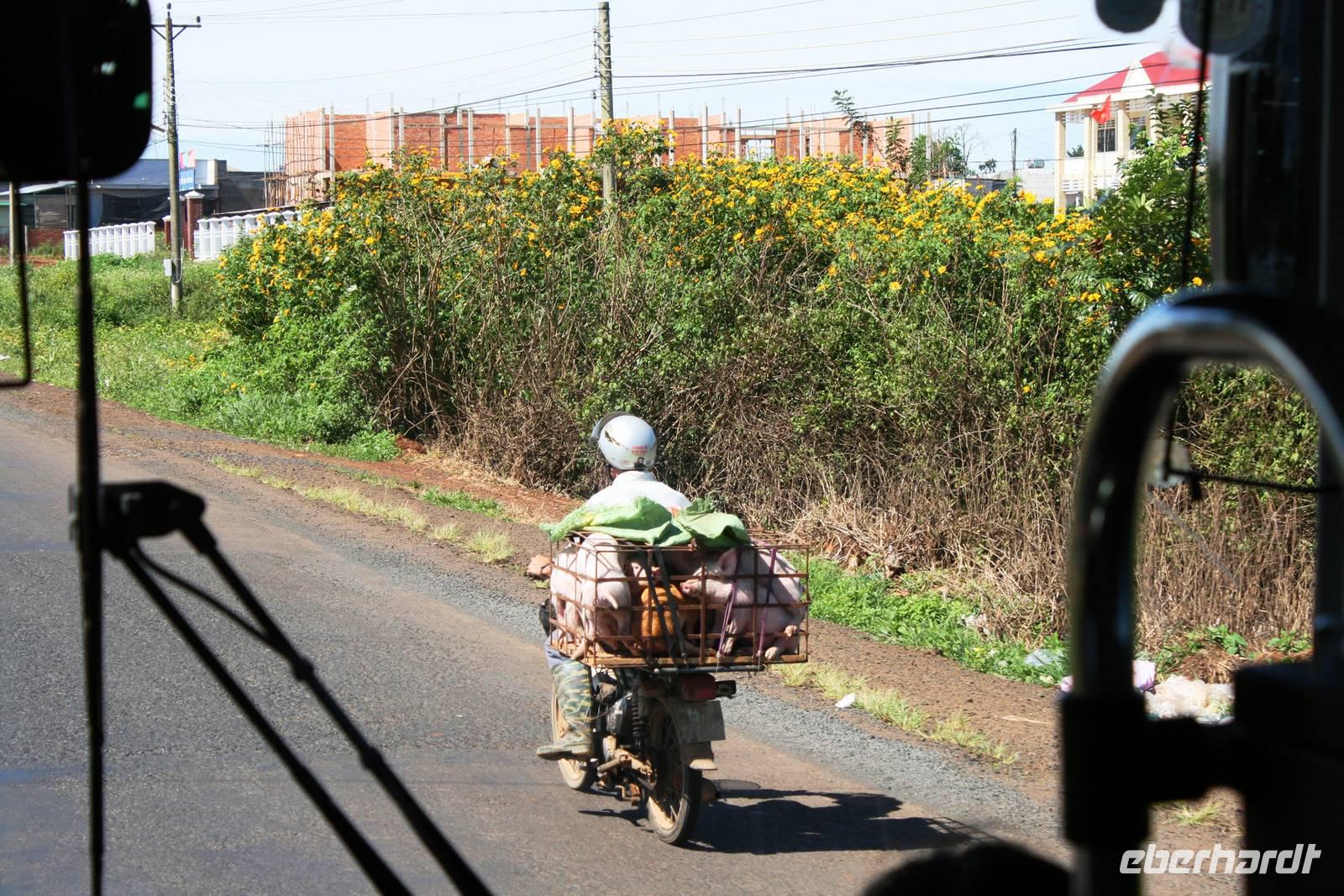 Nach einem begeisterten Frühstück begrüßte uns Huong mit Mütze und Schal. Bei 22° C am Morgen war ihr noch kalt. Wir mußten lachen. Mit dem Bus fuhren wir zum Bahnhof. Eigentlich hatten wir keine Lust mehr auf Zug fahren, aber die Eisenbahnfahrt in historischen Wagons wurde ein entspannendes Erlebnis. Die Bahnlinie zwischen Saigon und Da Lat wurde 1930 gebaut und ist heute größtenteils stillgelegt. Vorbei an Siedlungen, unzähligen Gewächshäusern, Erdbeerplantagen und riesigen Weihnachtssternstauden, die schon an das bevorstehende Fest erinnern, zuckelte die Eisenbahn ein kleines Stück zum Örtchen Trai Mat. Von hier bummelten wir zur Linh Phuoc Pagode, die erst in den 60er erbaut wurde. Bunte Mosaike aus Keramikscherben, überladende Ornamente, überdimensionale Statuen soweit unsere Augen blicken konnten. Beeindruckend und faszinierend, aber es ähnelte eher einem buddhistischen Jahrmarkt. Auf dem Rückweg zum Zug winkten uns fröhliche Schulkinder zu. Sie waren bestimmt so gut gelaunt, weil die Schule zu Ende war. Von Huong erfuhren wir, dass in Vietnam Schulpflicht besteht und Schuluniformen getragen werden. Aufgrund der Massen von Schülern wird an den Schulen sowohl vormittags als auch nachmittags unterrichtet. Nach einem Zwischenstopp am Happy House besichtigten wir den ehemaligen Sommerpalast des letzten Kaisers. Ein Hauch von Art Deko begleitete uns beim Rundgang durch die "Gemächer". Anschließend überraschten wir die Eberhardt Gäste mit dem Besuch des Crazy Houses. Hier hat die exzentrische Besitzerin Hang Nga (Tochter des ehemaligen Ministerpräsidenten) ihrer Fantasie ungezügelten Lauf gelassen und ein skurriles Gebäudekunstwerk entstehen lassen, welches noch lange nicht fertig ist. Wer will, kann hier auch im Kürbis- oder Spinnenzimmer übernachten. Wir waren uns einig, der Besuch des asiatischen "Hundertwasserhauses" war ein außergewöhnliches Erlebnis. Beim anschließenden Spaziergang durch die wunderschöne, bunte Anlage des Blumengartens fing es leider zu regnen an. Am Nachmittag genossen alle ihre Freizeit, durchstöberten den lokalen Markt auf der Suche nach Trockenfrüchten, kandierten Ingwer sowie Da Lat Wein und verweilten in einem der kleinen Cafes bei einem starken Kaffee und leckerer Pho Suppe. Am Abend gab es eine weitere, leckere Spezialität: Flambierte Bananen. Bei der Zubereitung wurde es unserem sympathischen Kellner spürbar heiss!